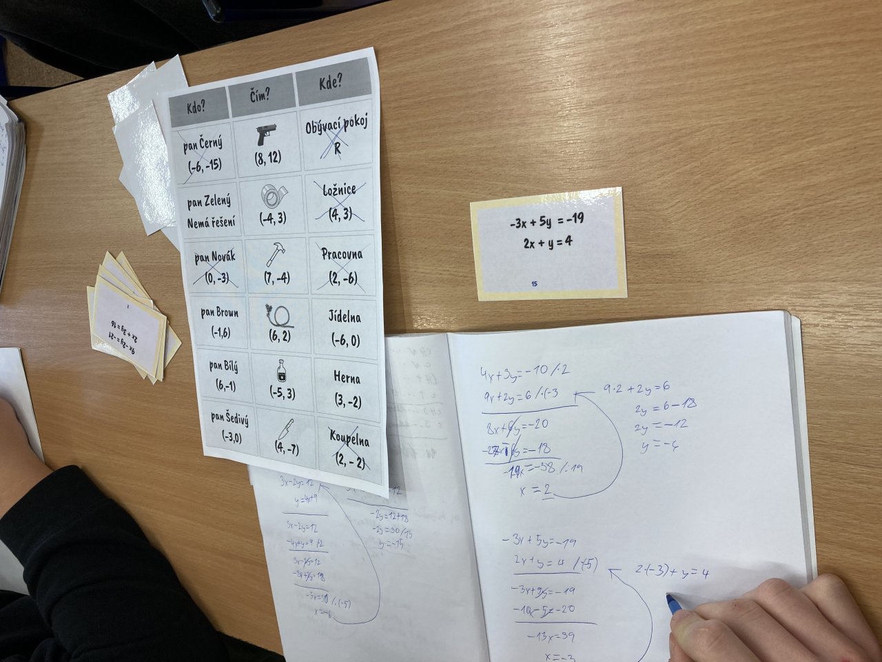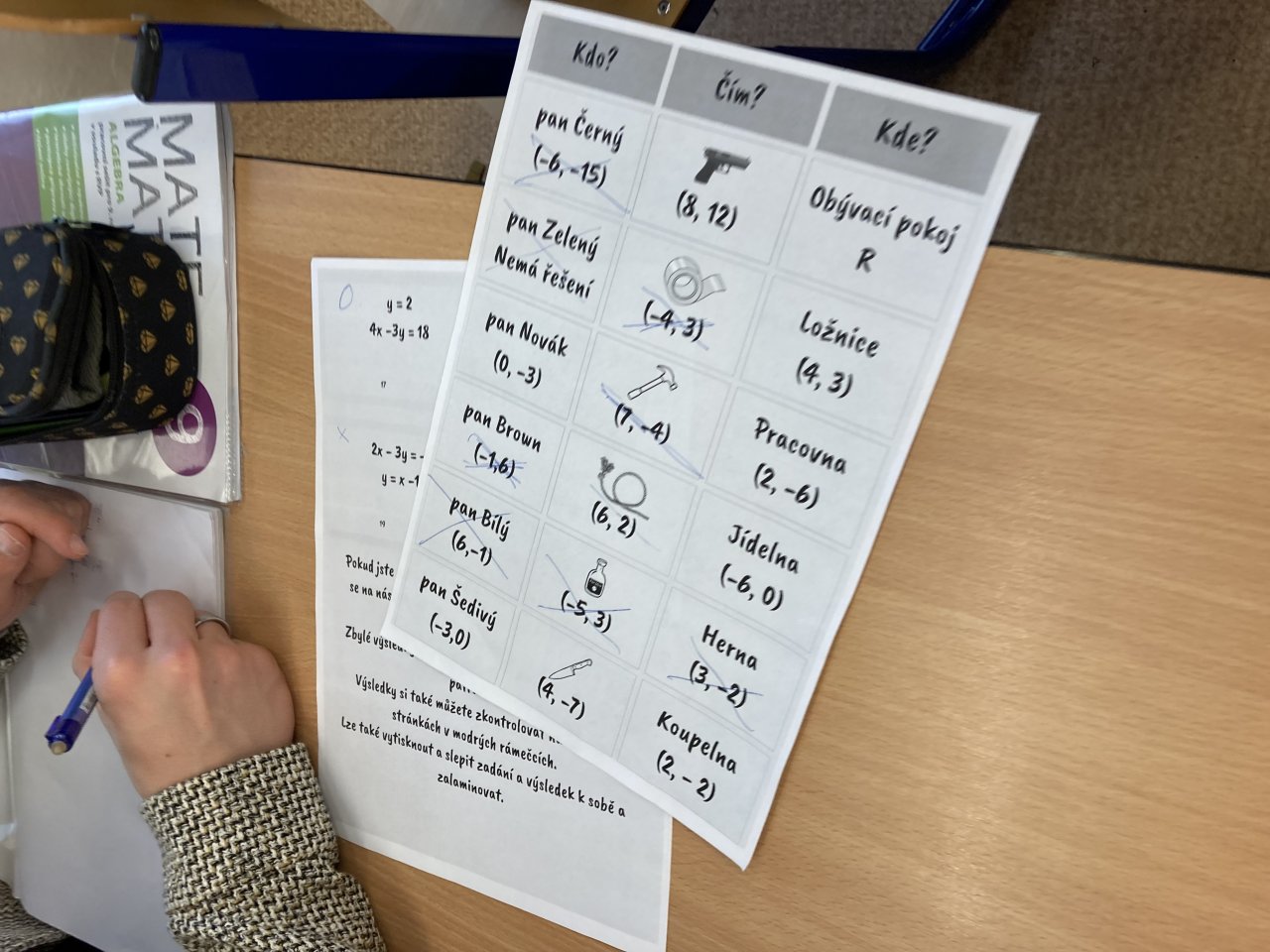 Až skupina vyřešila všechny soustavy, dostali klíč k šifře. Vyškrtáním výsledků měli zjistit, kdo je vrah, čím vraždil a kde.