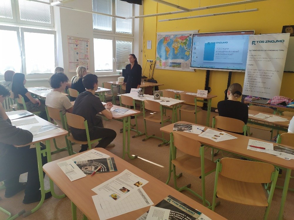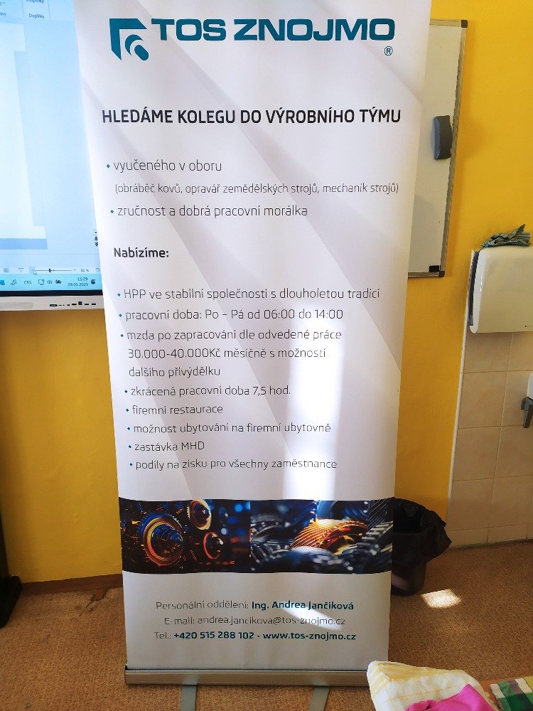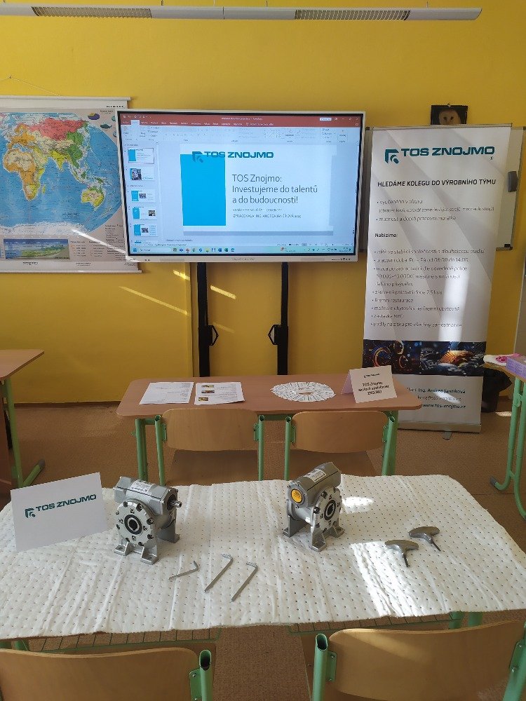 Datum: 31. 1. 2025V rámci prezentace firmy TOS Znojmo měli vycházející žáci možnost seznámit se s nabídkou profesí v oblasti strojírenství a techniky. Hlavní činností této firmy je vývoj, výroba a prodej převodových zařízení. Paní Ing. Andrea Jančíková žákům představila možnosti uplatnění absolventů škol v různých oborech a seznámila je s nabídkou stipendijních programů pro obor obráběč kovů, opravář zemědělských strojů a mechanik strojů.