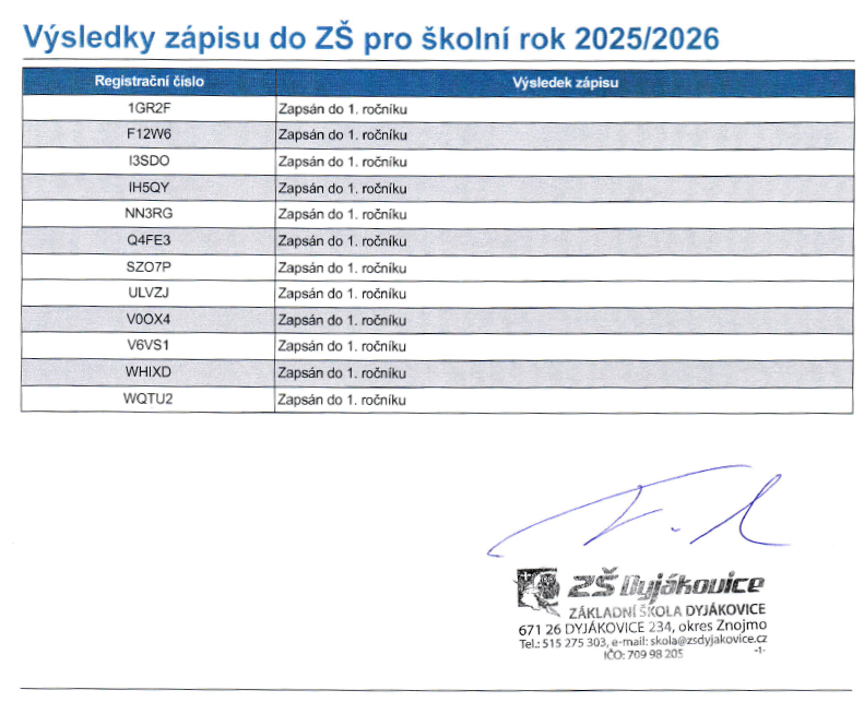 Výsledky zápisu do 1. třídy z 9. dubna 2025