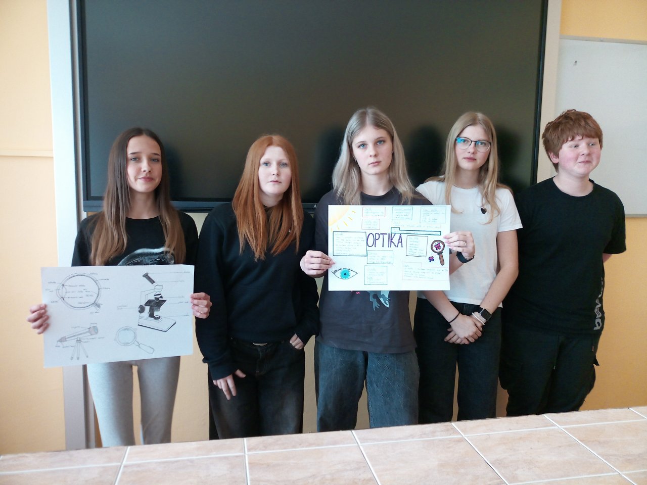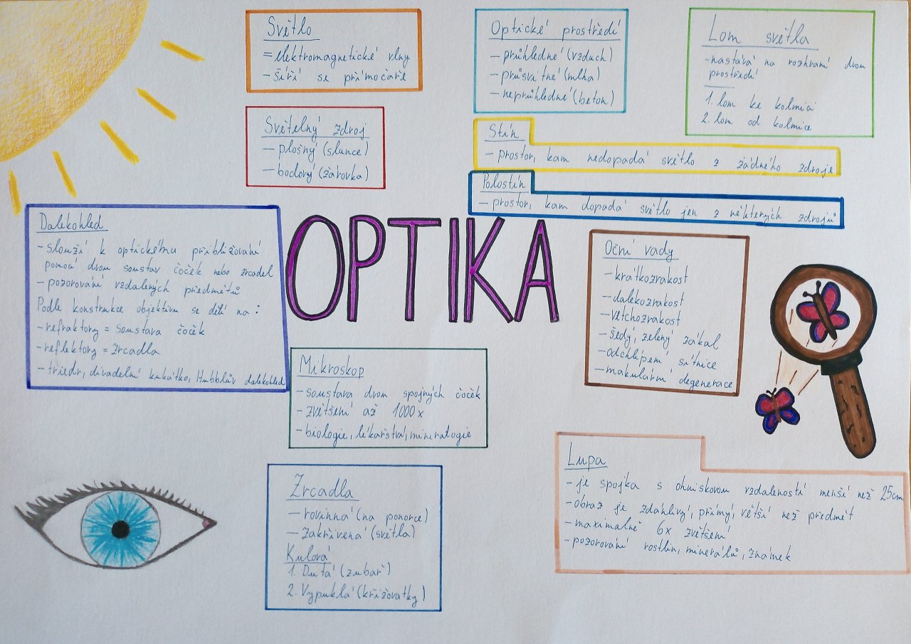 Datum: 6. 5. 2025V hodinách fyziky se žáci 9. třídy pustili do tvorby myšlenkových map zaměřených na téma optika. Každá skupina si vybrala podtéma, jako například oko, dalekohled, lupa, mikroskop, oční vady nebo zajímavosti ze světa optiky. Cílem bylo propojit teoretické znalosti s praktickými poznatky a rozvíjet schopnost logického myšlení a vizuálního uspořádání informací.