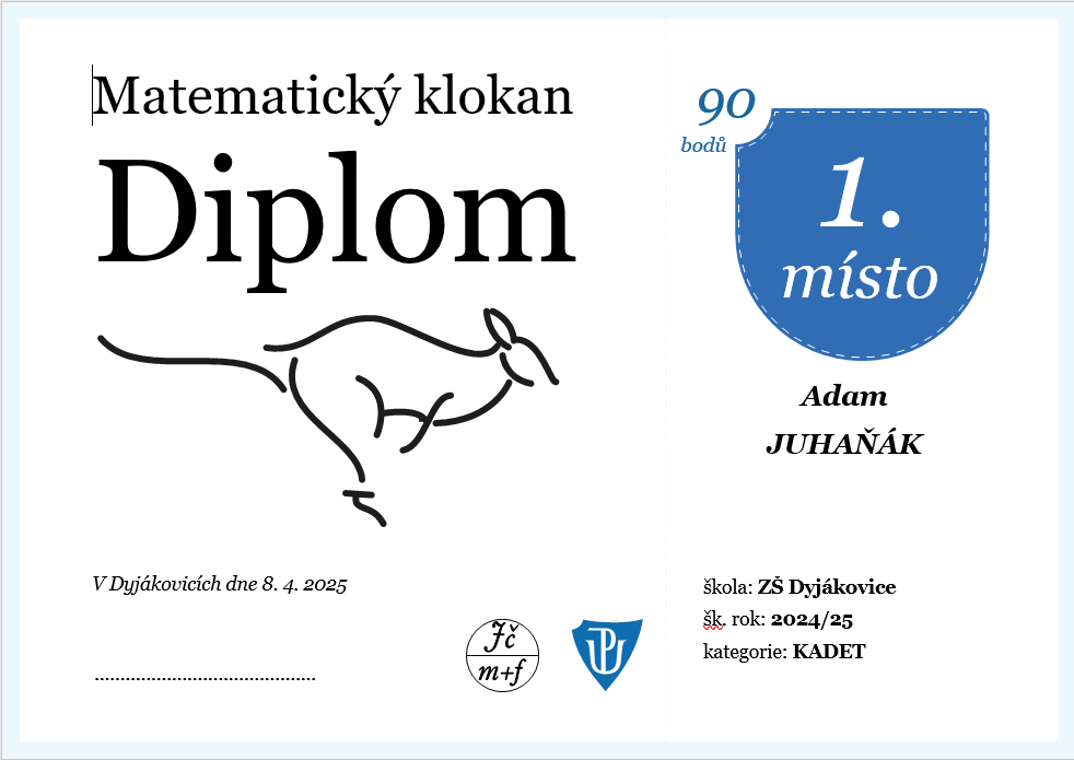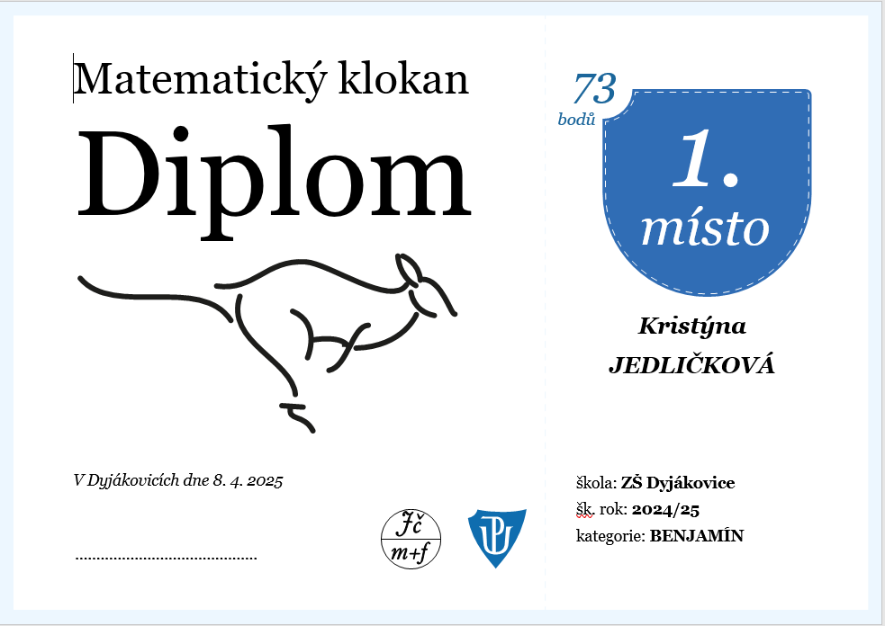 Datum: 7. 5. 2025Matematický klokan je mezinárodní matematická soutěž pro žáky základních a středních škol, která pochází z Francie a dnes se koná ve více než 80 zemích světa, včetně České republiky. Cílem soutěže je popularizovat matematiku zábavnou formou a podpořit logické myšlení dětí.