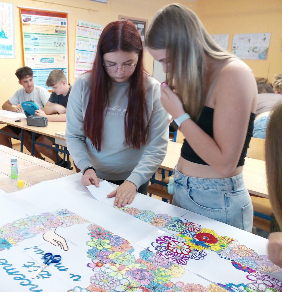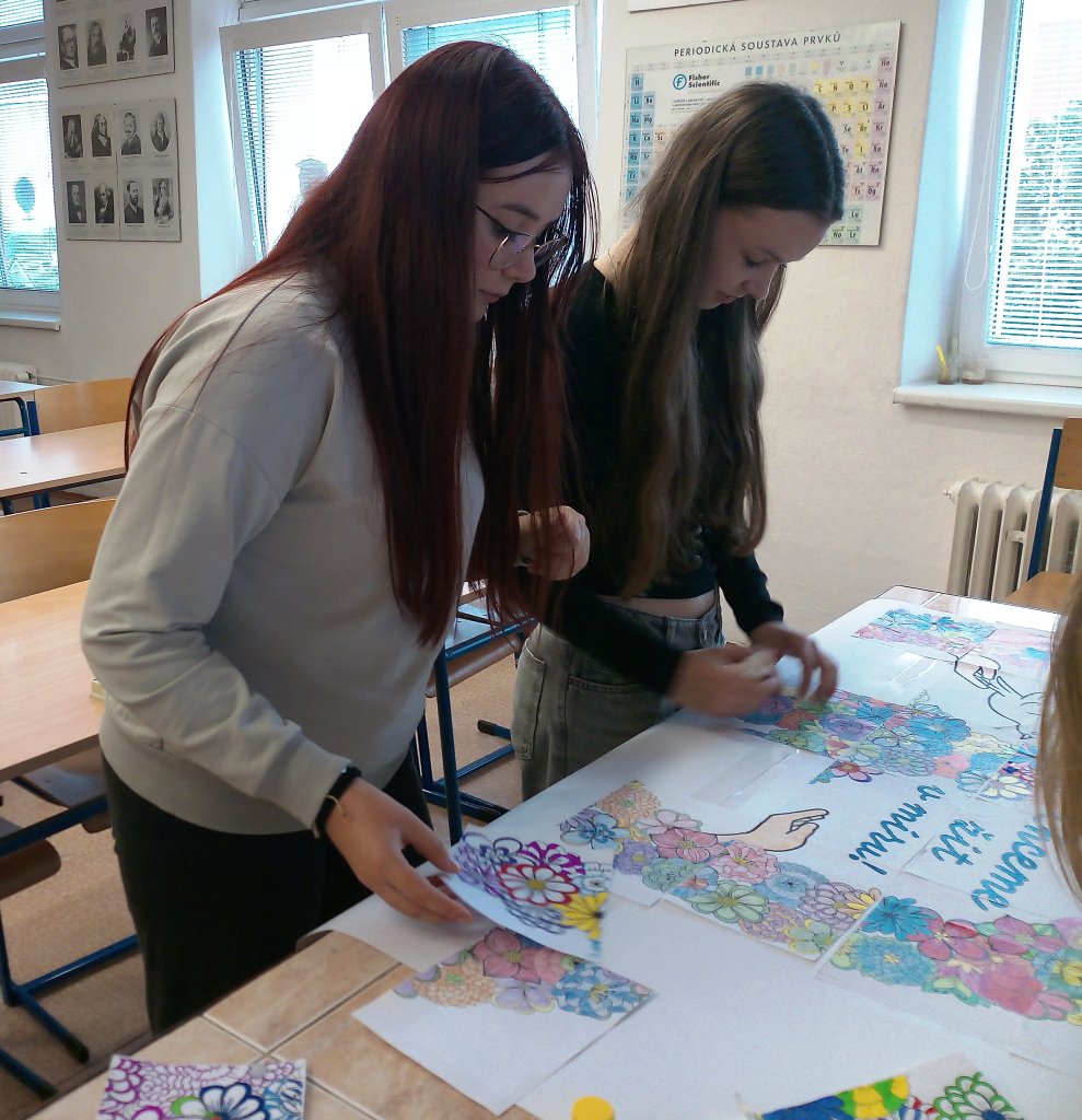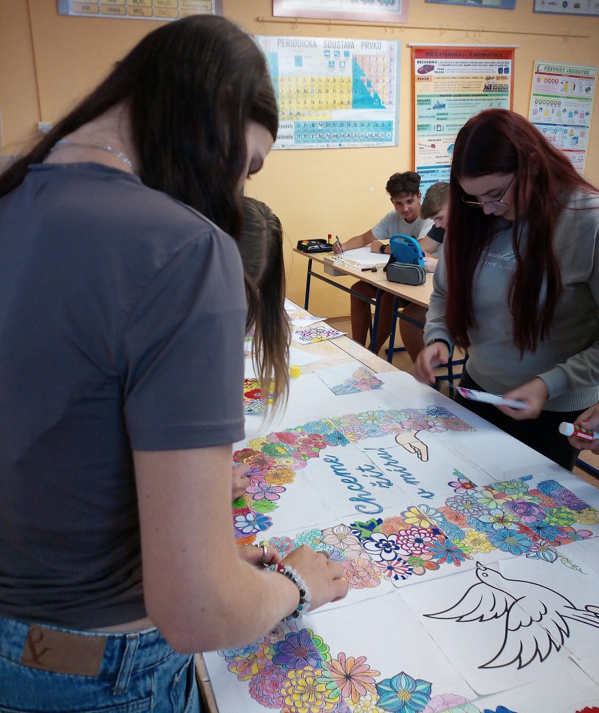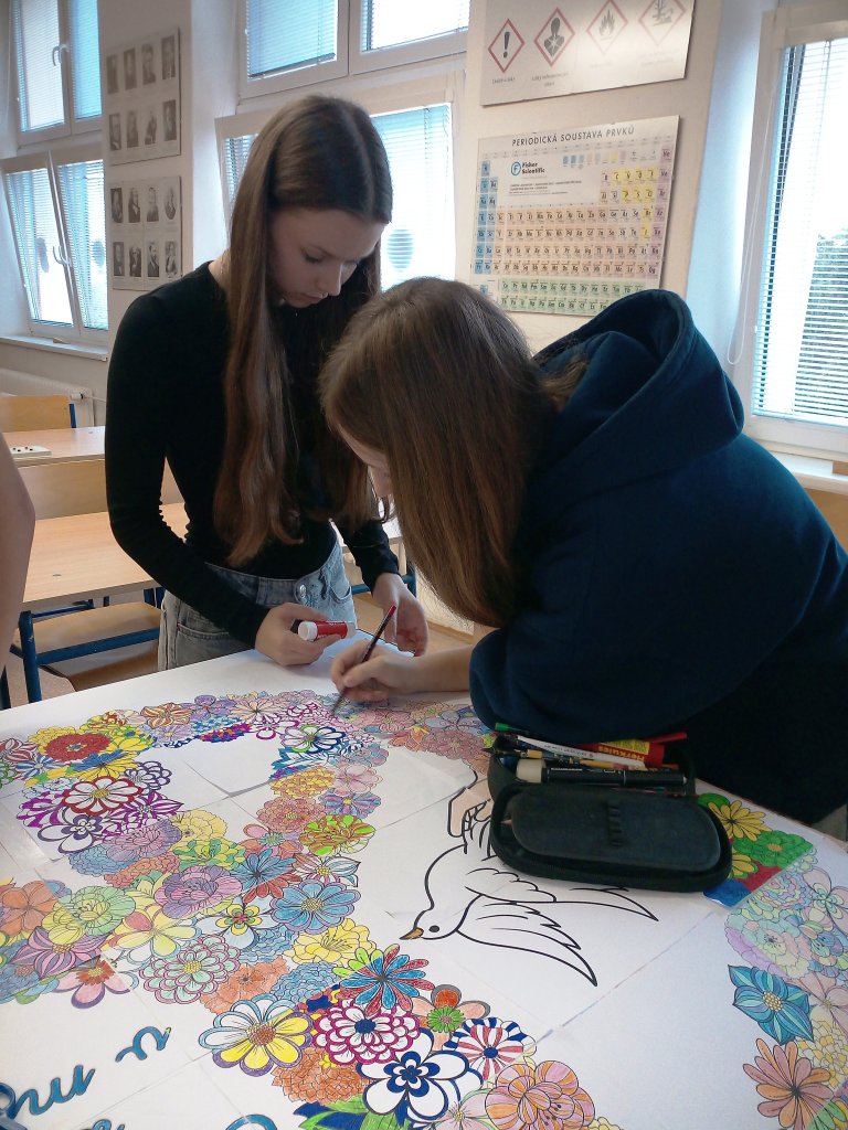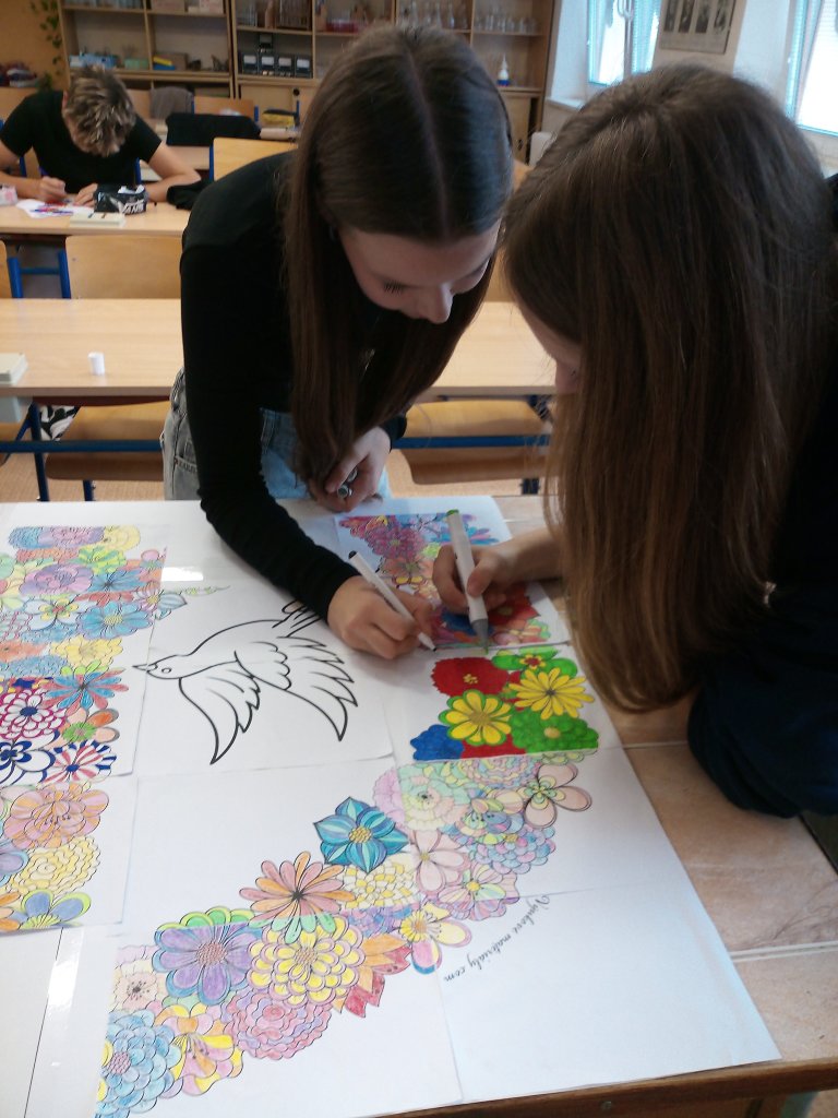 V rámci VkZ se zapojili do několika aktivit. Nejdříve společně vymalovali a potom složili velký kooperativní obrázek symbolizující mír, který nyní zdobí chodbu školy jako připomínka toho, že každý z nás může přispět k lepšímu světu.