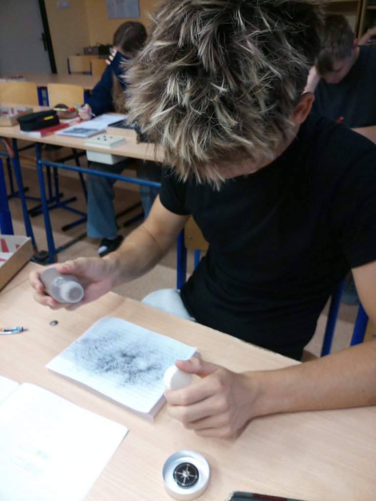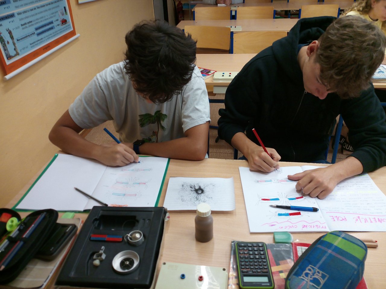 Na lavice si položili plastové podložky a papíry, pod které umístili magnety, a na papír rozsypali železné piliny. Ty se okamžitě uspořádaly podle siločar magnetického pole – nejhustší byly u pólů magnetu. Žáci si také vyzkoušeli, jak se pole mění při použití různých typů magnetů nebo při přiložení dvou magnetů blízko sebe.