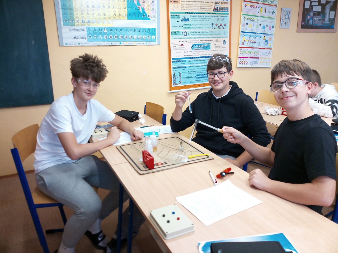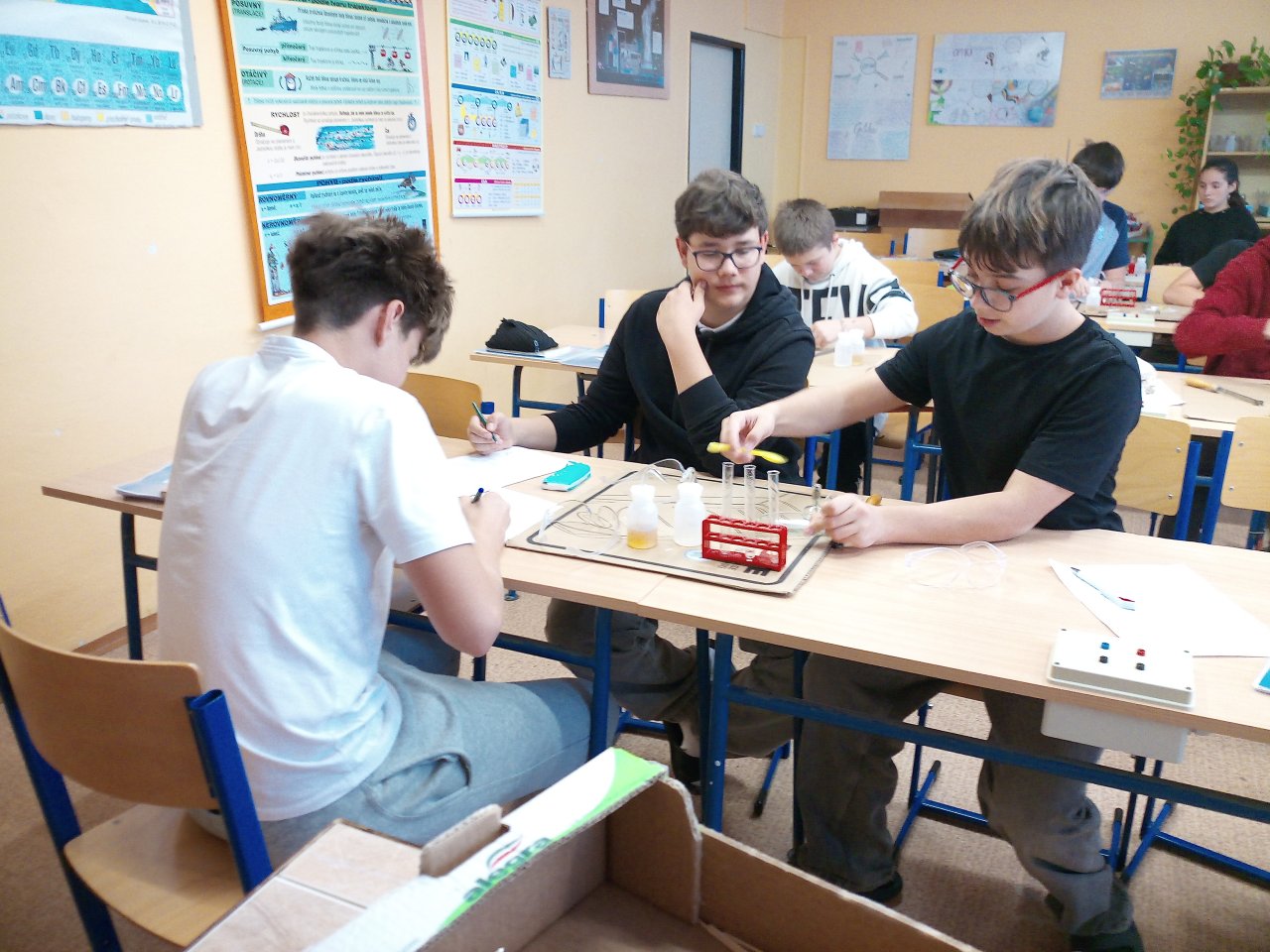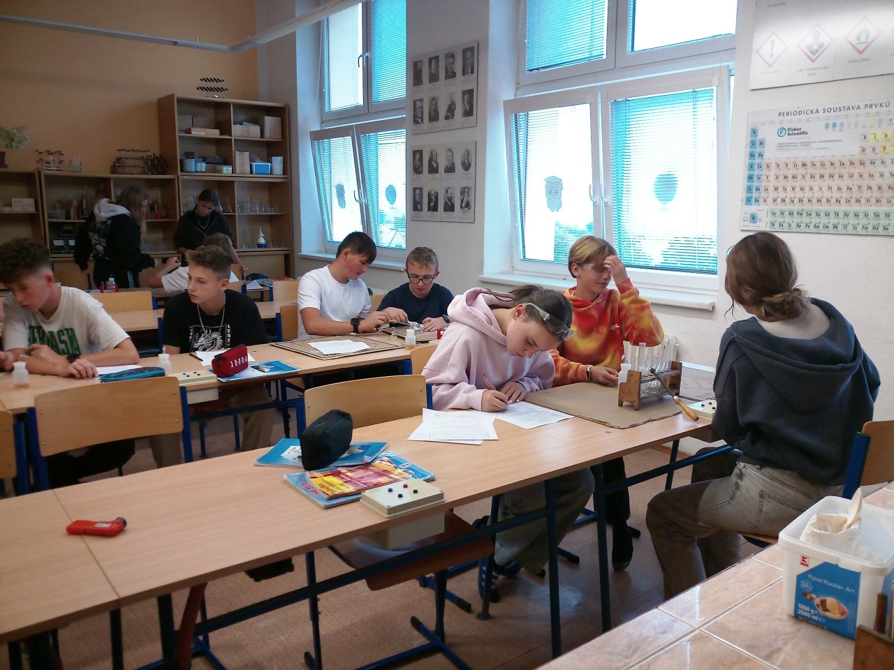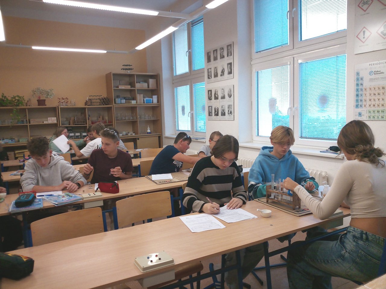 Datum: 27. 9. 2025V hodinách chemie se žáci 8. třídy proměnili v mladé vědce. Během praktické výuky zkoumali různé vlastnosti látek a prováděli jednoduché, ale zajímavé pokusy.