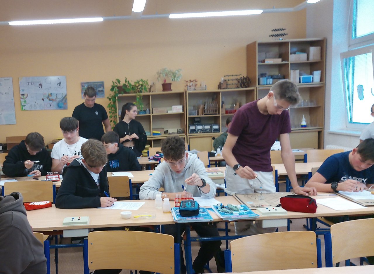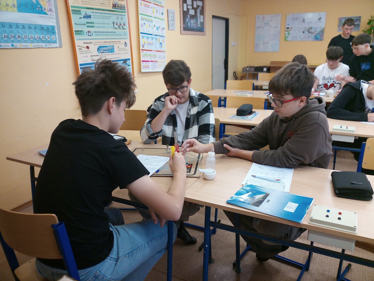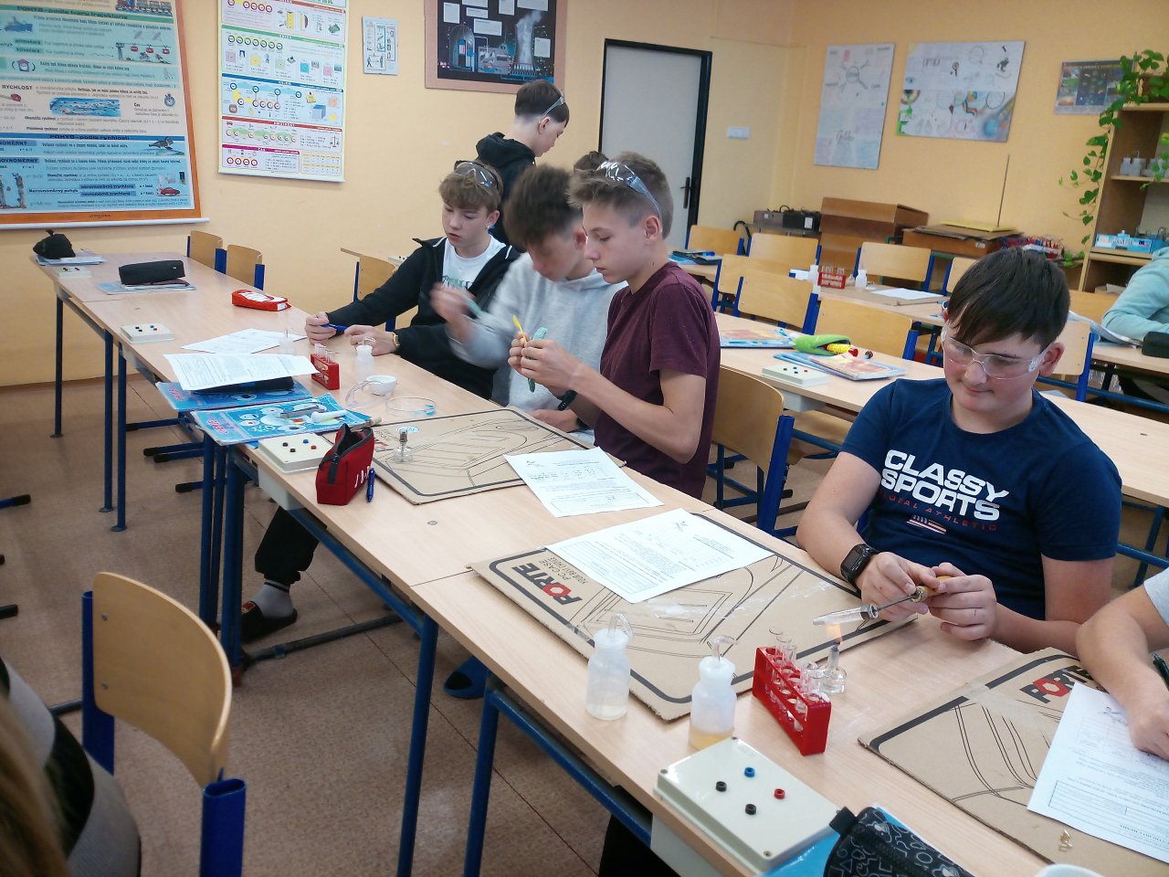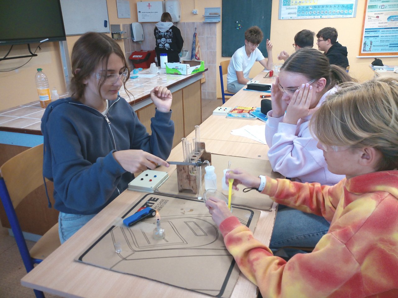 Datum: 27. 9. 2025V hodinách chemie se žáci 8. třídy proměnili v mladé vědce. Během praktické výuky zkoumali různé vlastnosti látek a prováděli jednoduché, ale zajímavé pokusy.