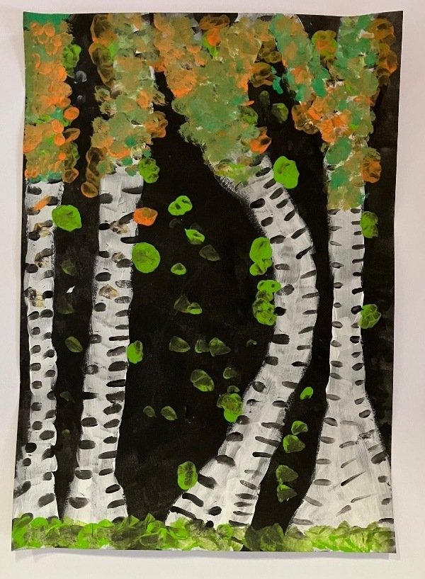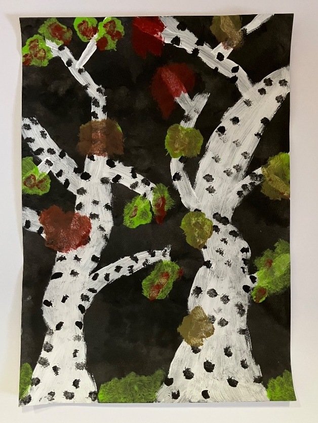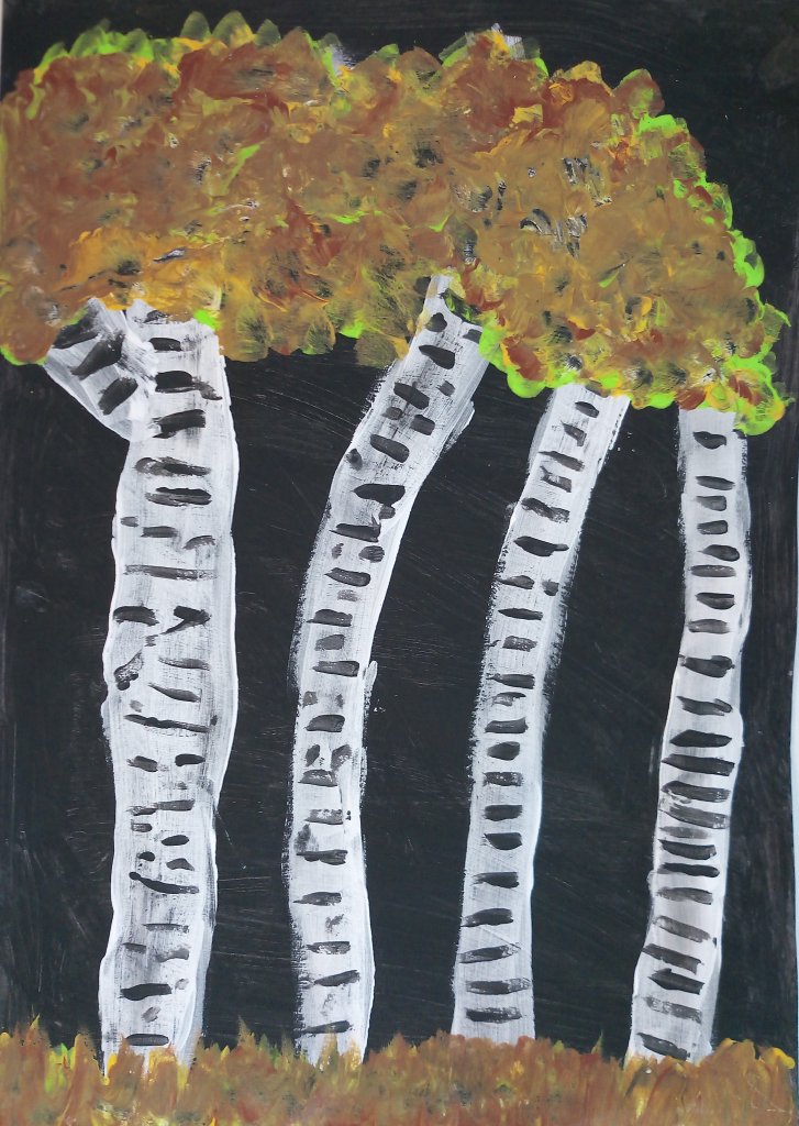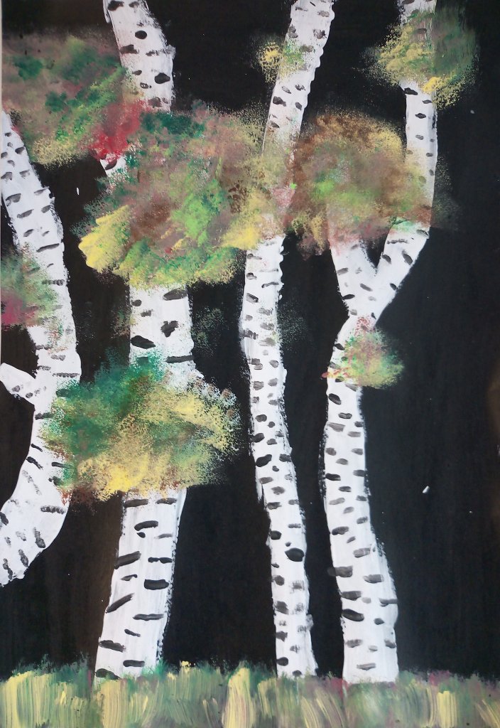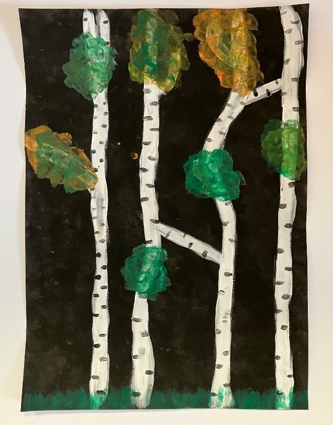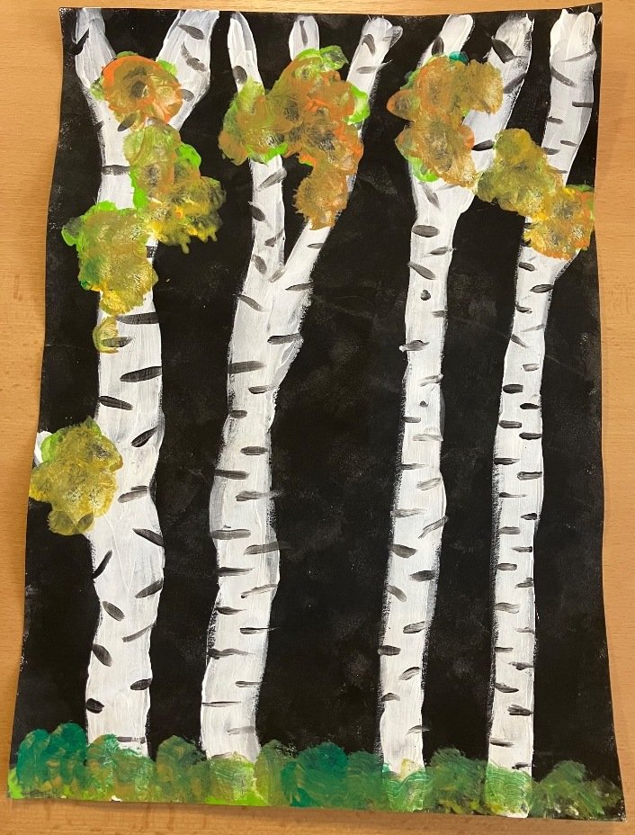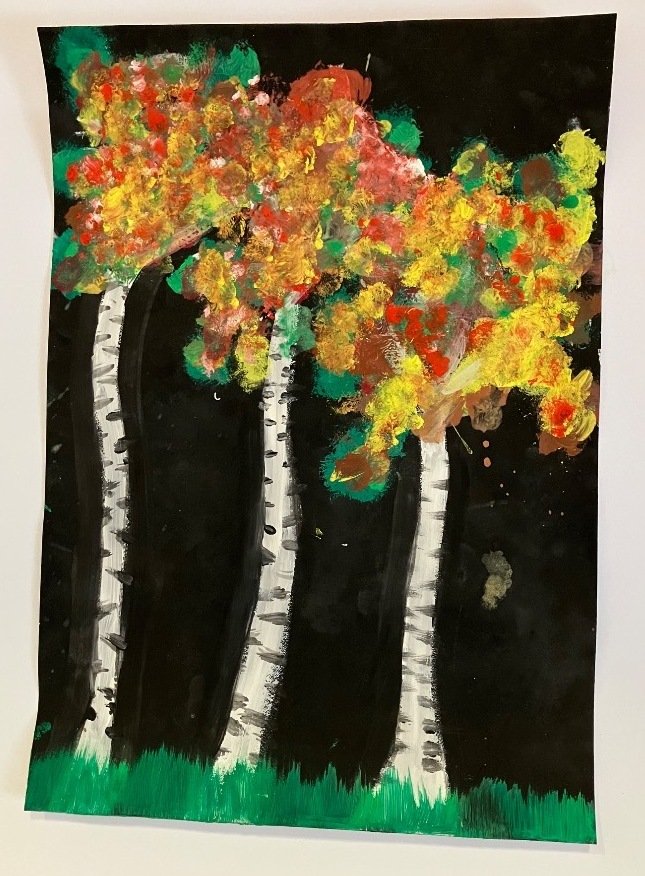 Datum: 1. 10. 2025Na podzim se nádherně vybarvuje příroda, a právě paleta podzimních barev v přírodě byla inspirací a zároveň námětem v hodinách výtvarné výchovy v 7. a 8. třídě. A kde jinde najít pestrou škálu barev než na stromech? A tak se žáci zaměřili na malbu stromů, přičemž kladli důraz na barevný kontrast. Základem bylo tmavé pozadí, do kterého mladí umělci namalovali kmeny břízy, jejichž bílá barva kůry na černém podkladu hezky vynikla. Celkový dojem obrazu žáci doplnili technikou tzv. tupování - touto technikou přimalovali pestrobarevné listy a umělecké dílo bylo na světě!