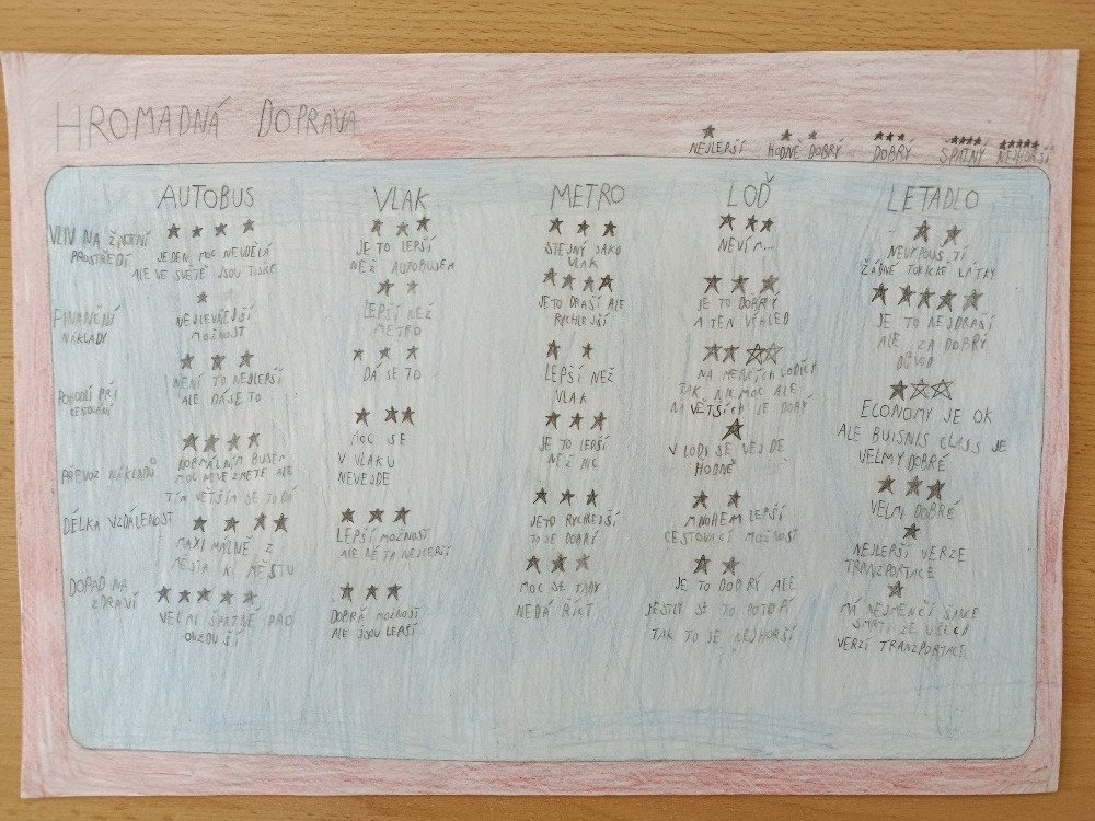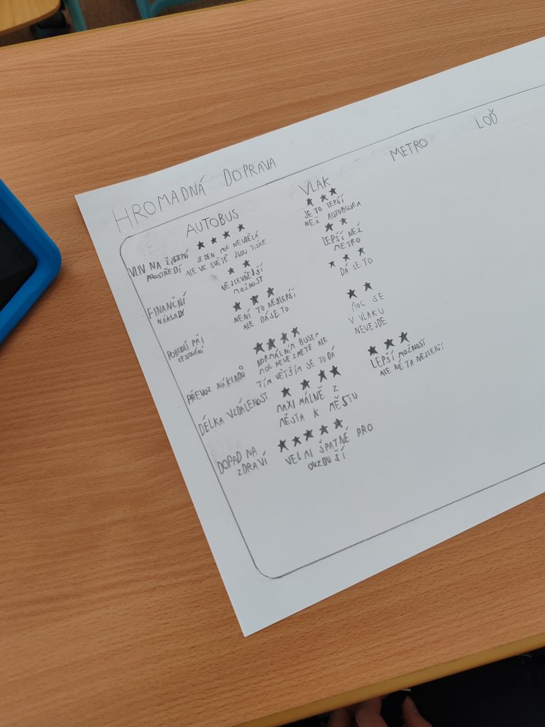 Poté se rozdělili do skupin, ve kterých dostali za úkol zhodnotit jednotlivé dopravní prostředky z hlediska vlivu na životní prostředí, finanční náročnosti, počtu přepravených osob, délky cest a dalších kritérií.