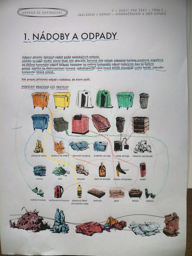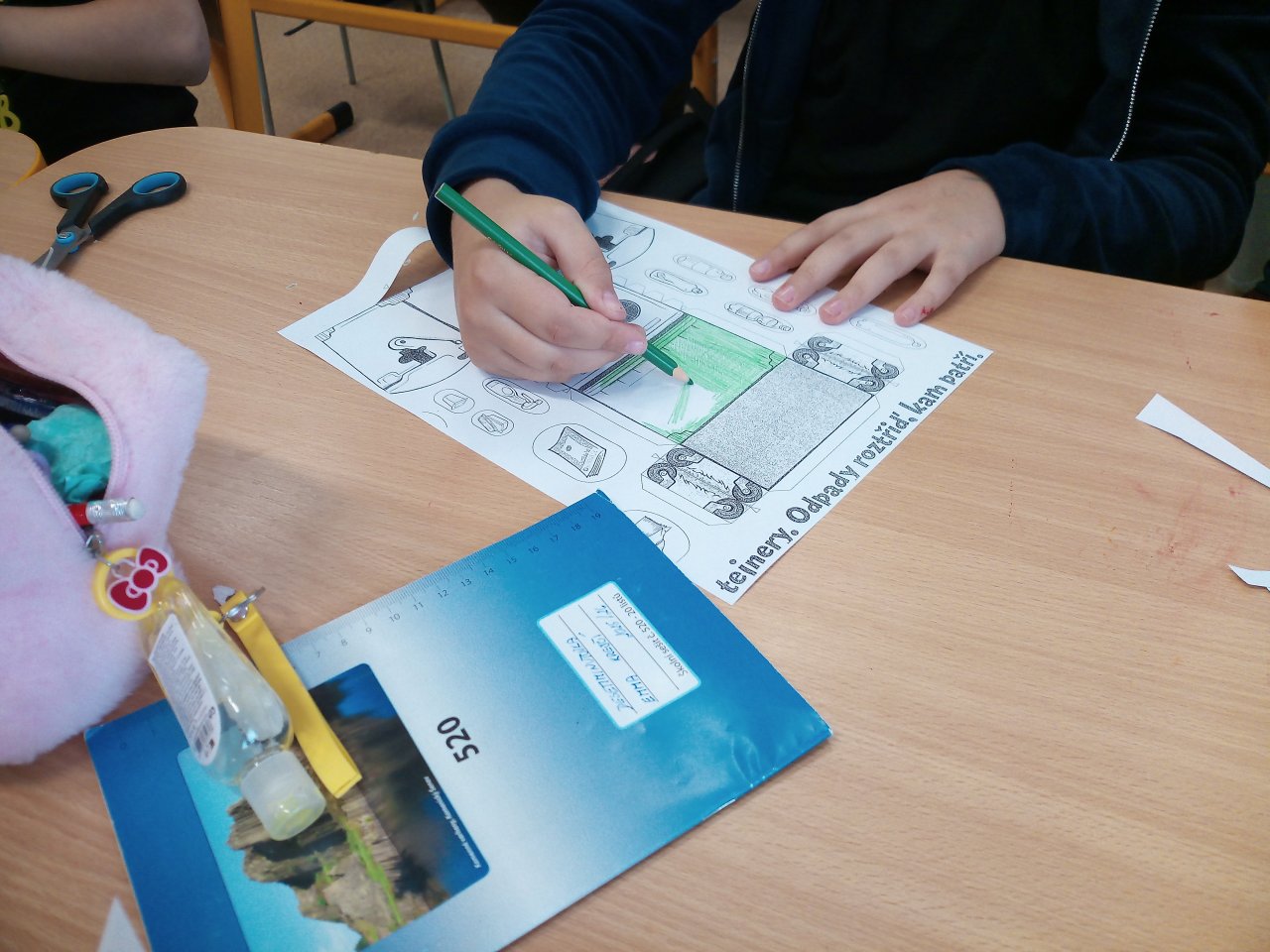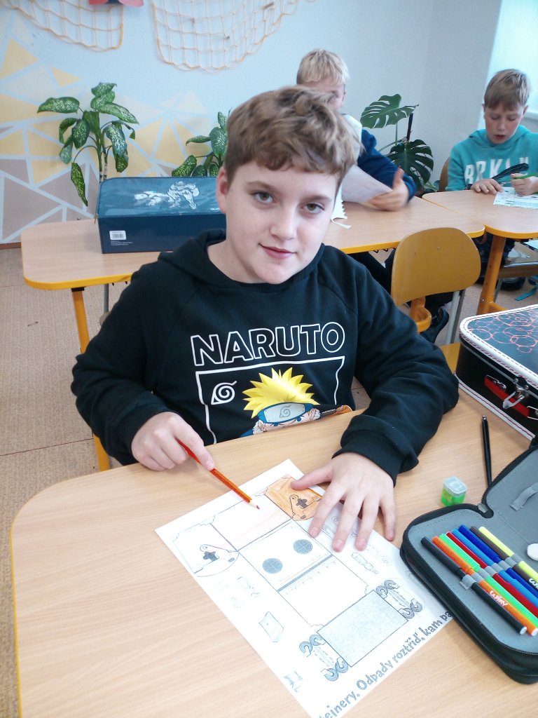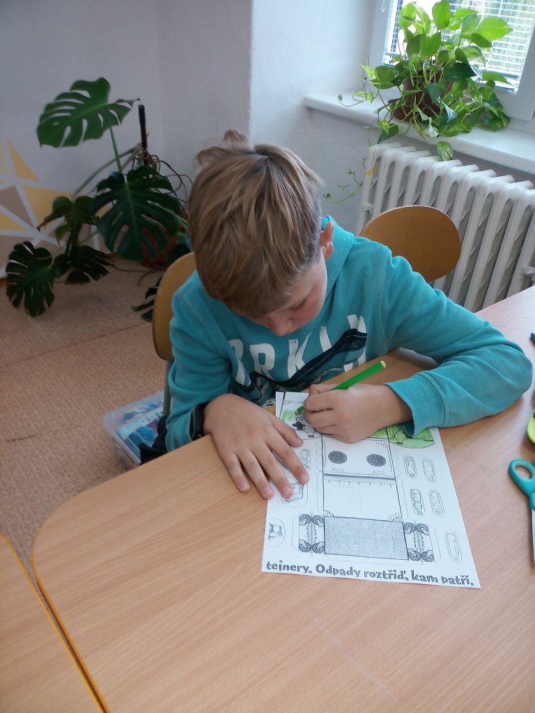 Nejprve si každý žák vybarvil a sestavil model popelnice, což byla nejen kreativní činnost, ale i skvělý způsob, jak si osvojit základní informace o různých typech odpadů a kontejnerech, do kterých patří. Poté následovala práce s pracovním listem, kde děti měly za úkol správně roztřídit odpadky do jednotlivých barevných kontejnerů – papír, plast, sklo, bioodpad a další.