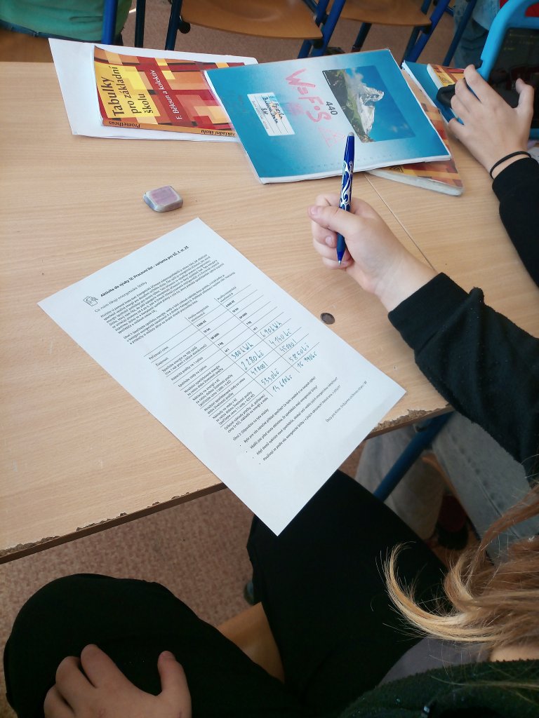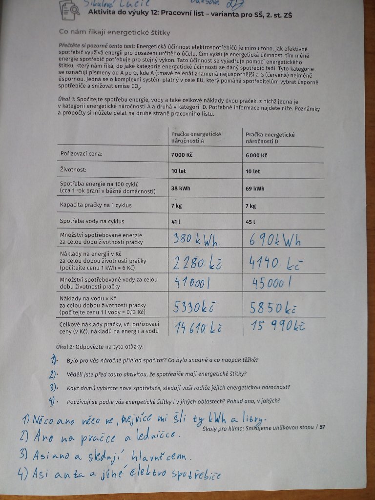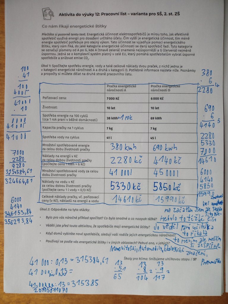 Součástí projektu byl i pracovní list, ve kterém počítali roční náklady na provoz různých domácích spotřebičů. Porovnávali spotřebiče s různými energetickými třídami a zjišťovali, jak velké rozdíly mohou být v ročním účtu za elektřinu.