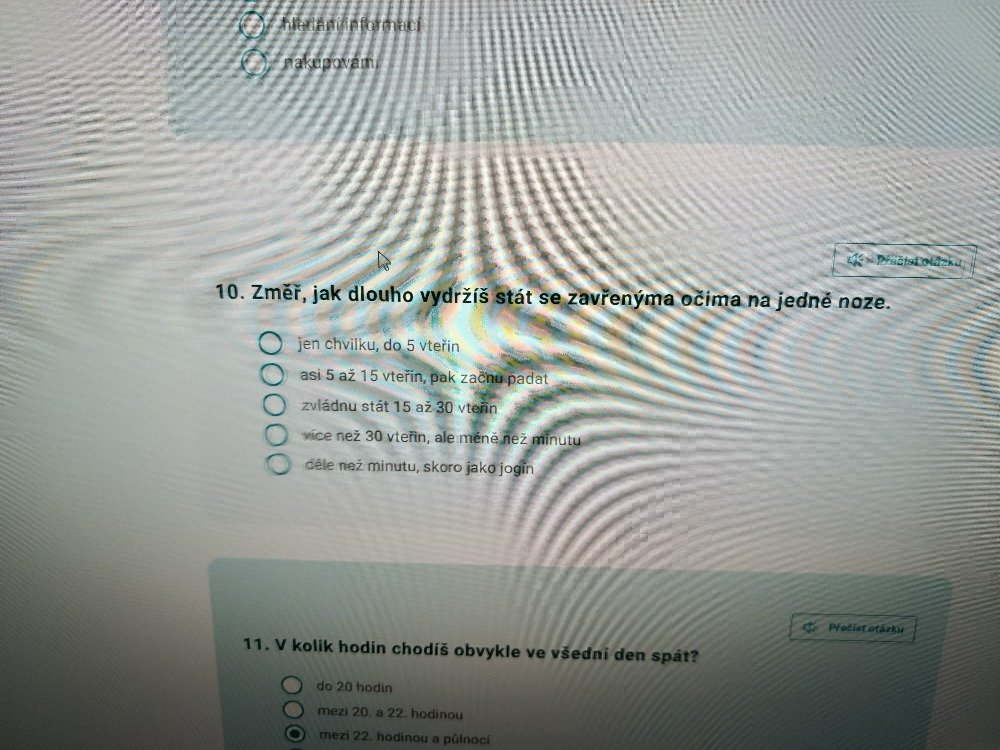 Žáci zatím 7. a 9. třídy již vyplňovali online dotazník, kde odpovídali na otázky týkající se každodenního života – například kolik času tráví na mobilu, jaké mají domácí mazlíčky, jak dlouho vydrží stát na jedné noze nebo jak se do školy dopravují. Výsledky pak mohli porovnat s odpověďmi tisíců dalších žáků z celé republiky.