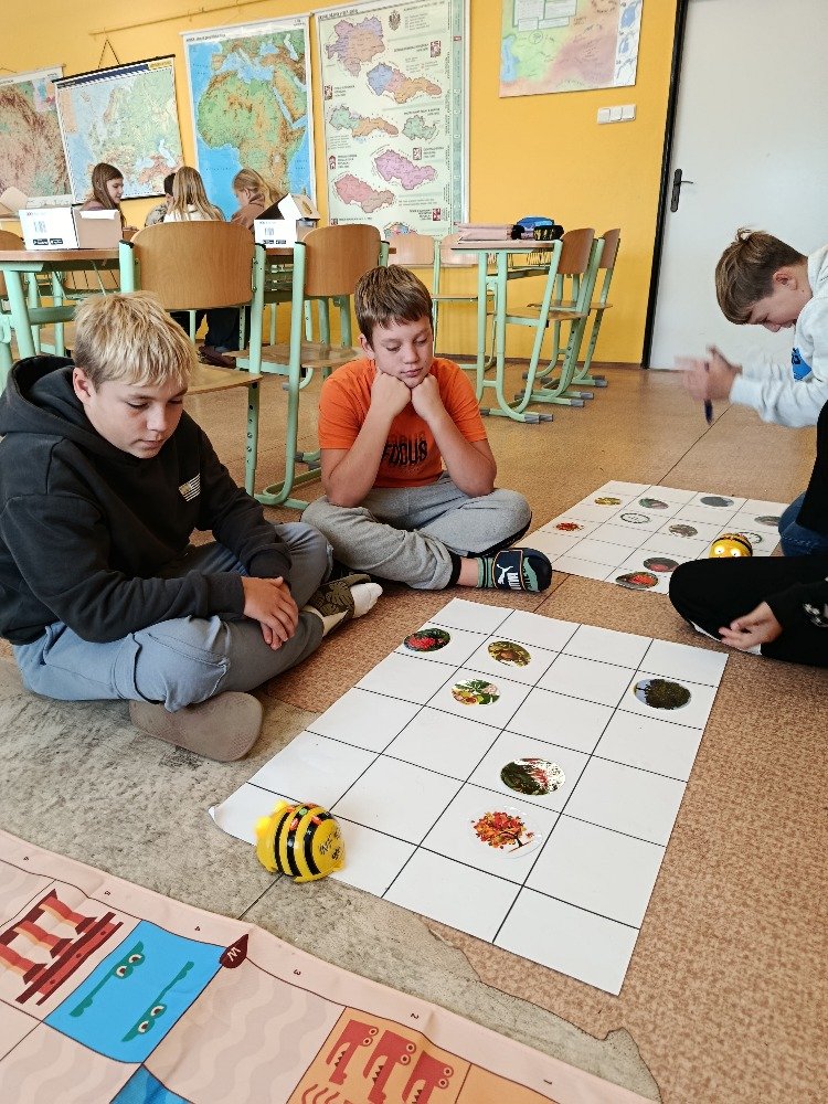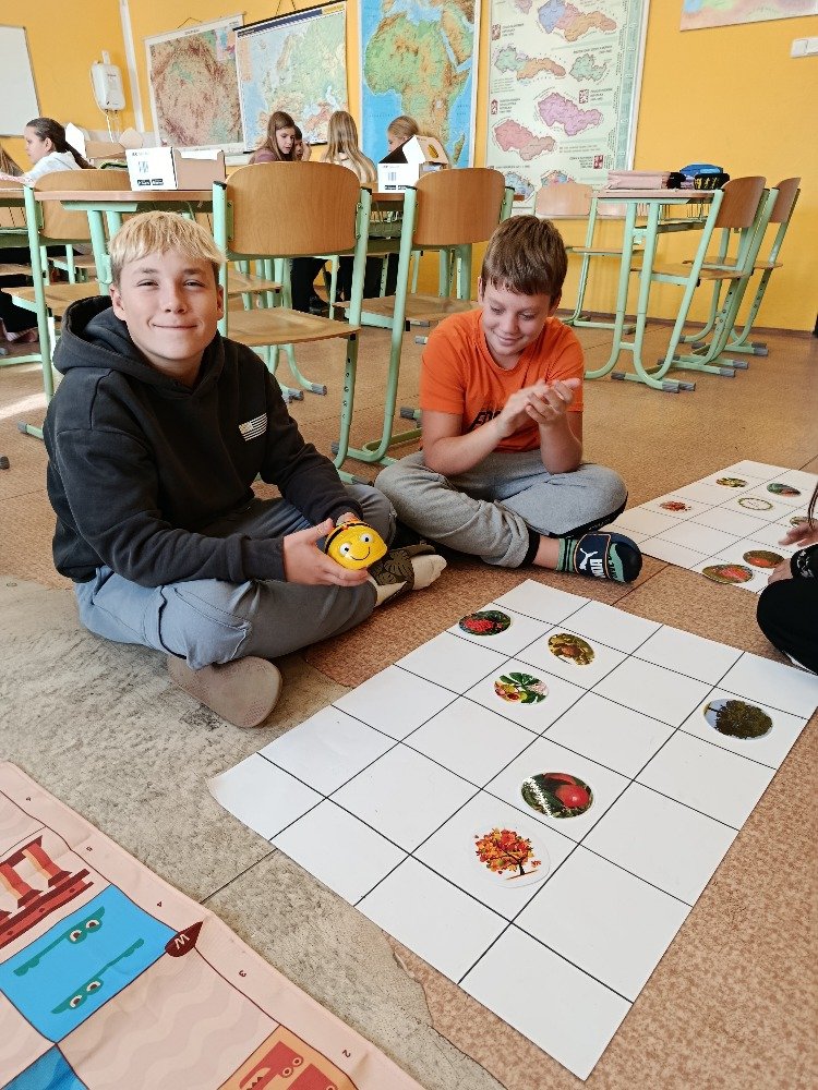 Poté jsme využili robota Bee-Bot a speciální podložku s obrázky stromů. Úkolem bylo naprogramovat robota tak, aby dojel ke správnému stromu podle zadaných indicií.