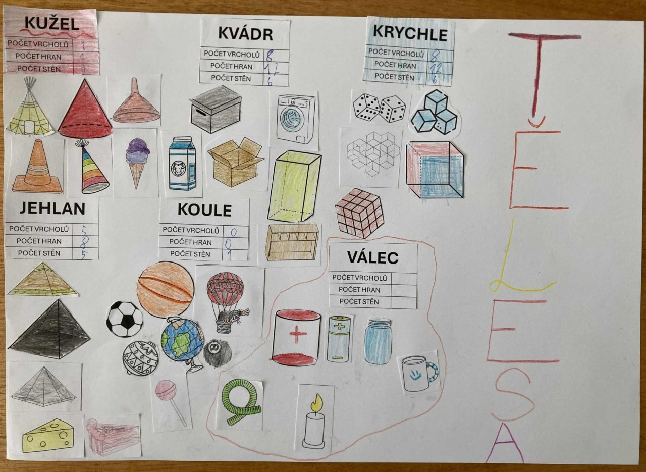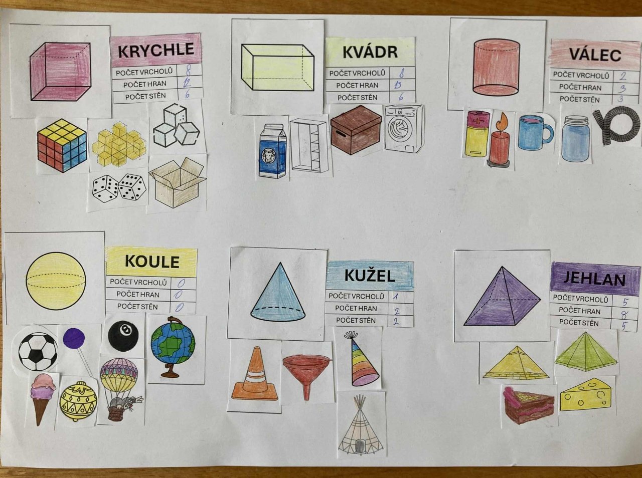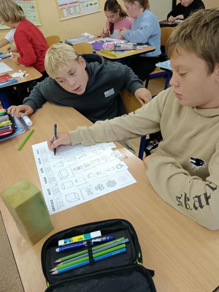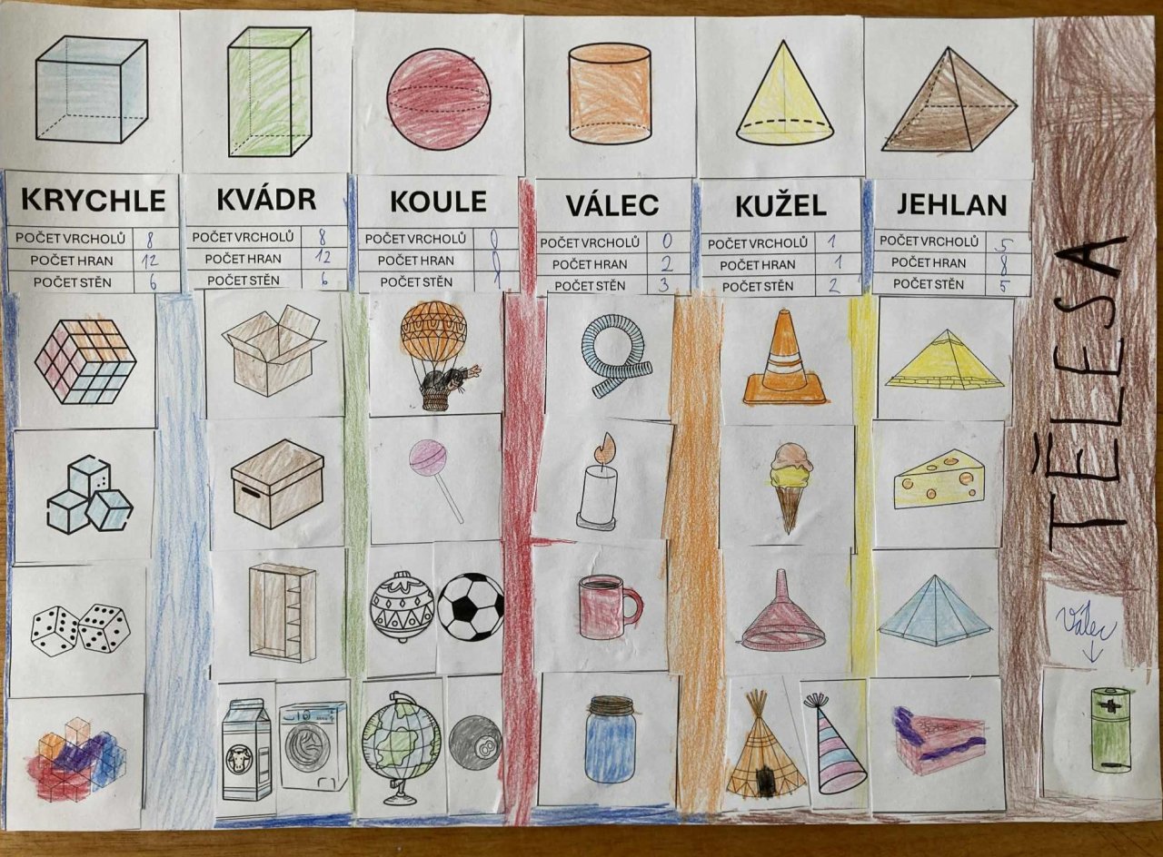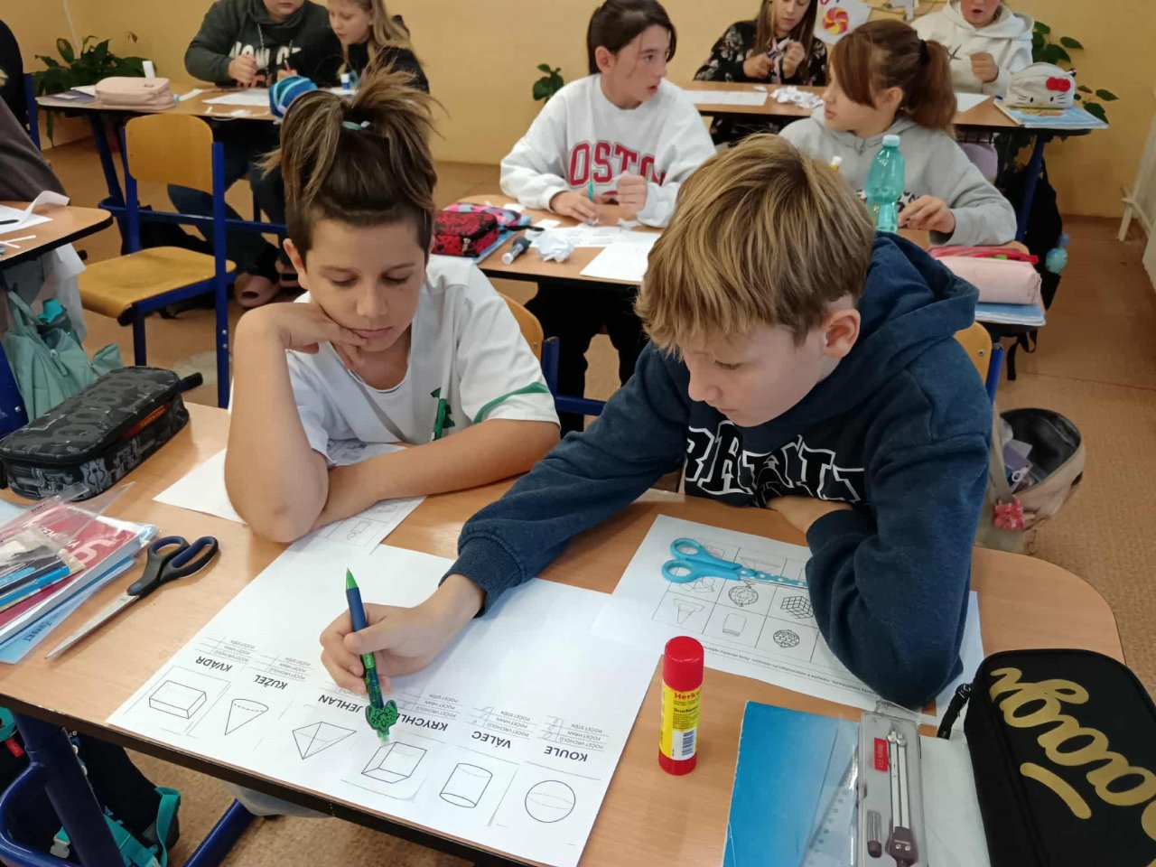 Žáci 6. třídy pracovali ve dvojicích a na výkres lepili obrázky různých těles. Ke každému tělesu přiřadili odpovídající obrázek a zopakovali si tak názvy i tvary jednotlivých těles. Práce je bavila a pomohla jim lépe pochopit prostorová tělesa