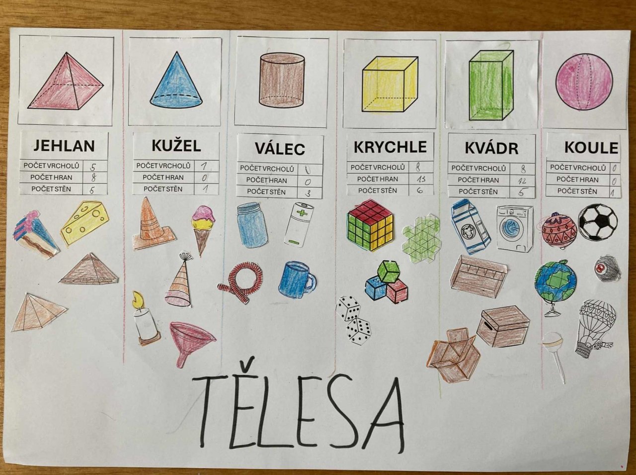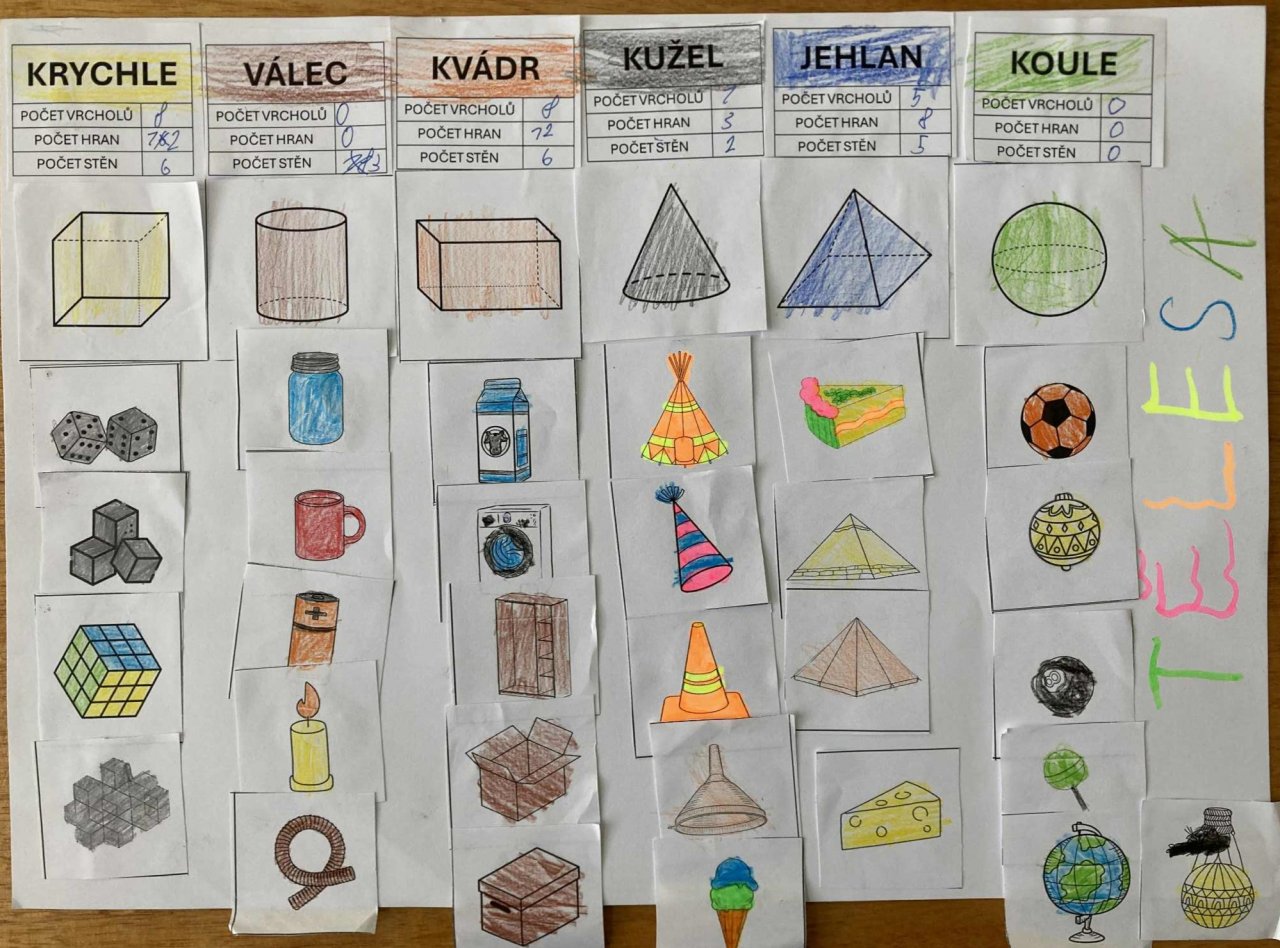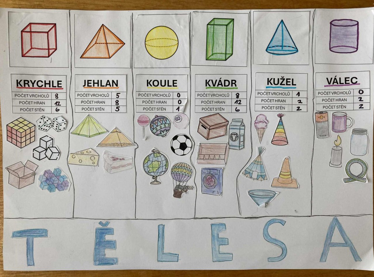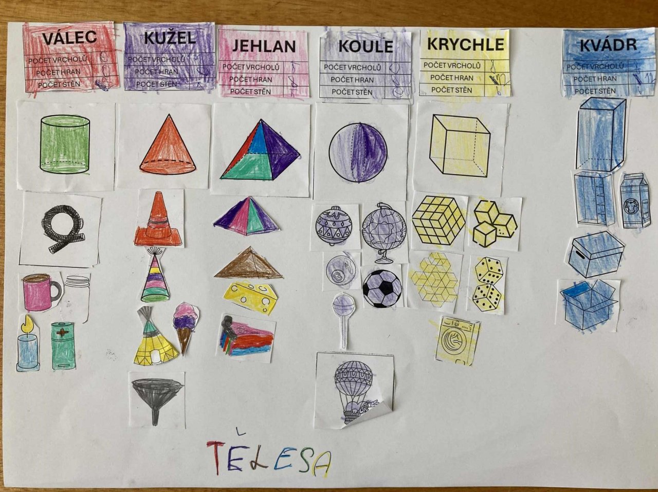 Žáci 6. třídy pracovali ve dvojicích a na výkres lepili obrázky různých těles. Ke každému tělesu přiřadili odpovídající obrázek a zopakovali si tak názvy i tvary jednotlivých těles. Práce je bavila a pomohla jim lépe pochopit prostorová tělesa