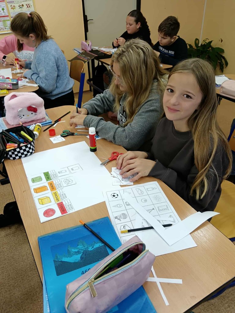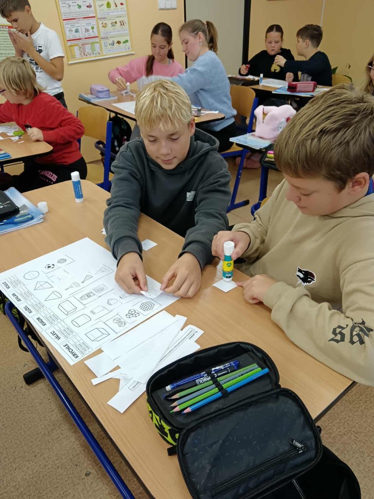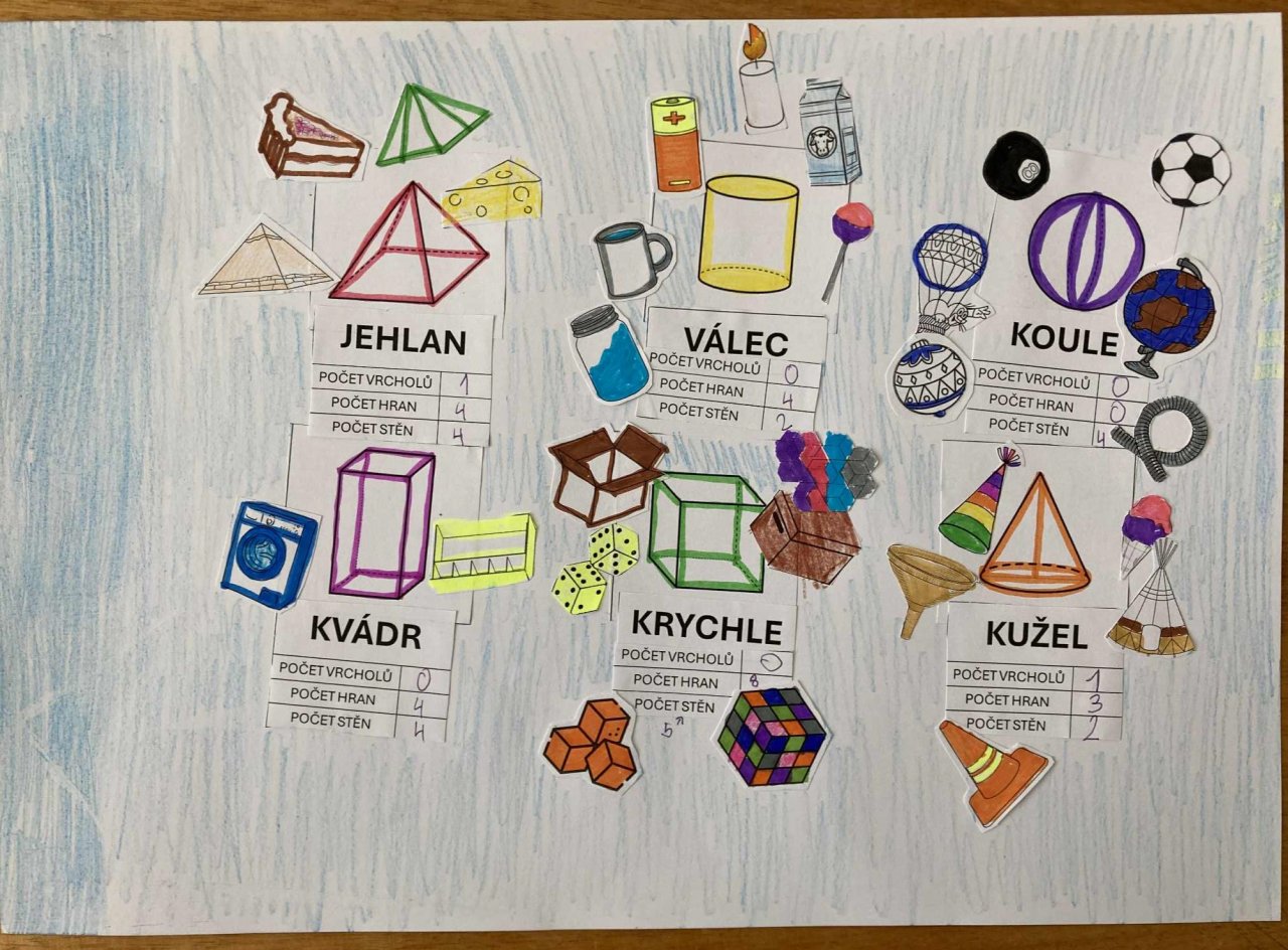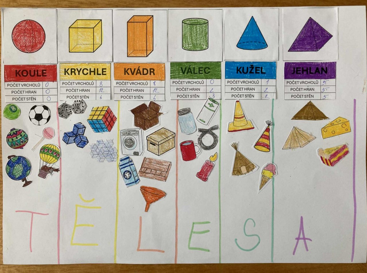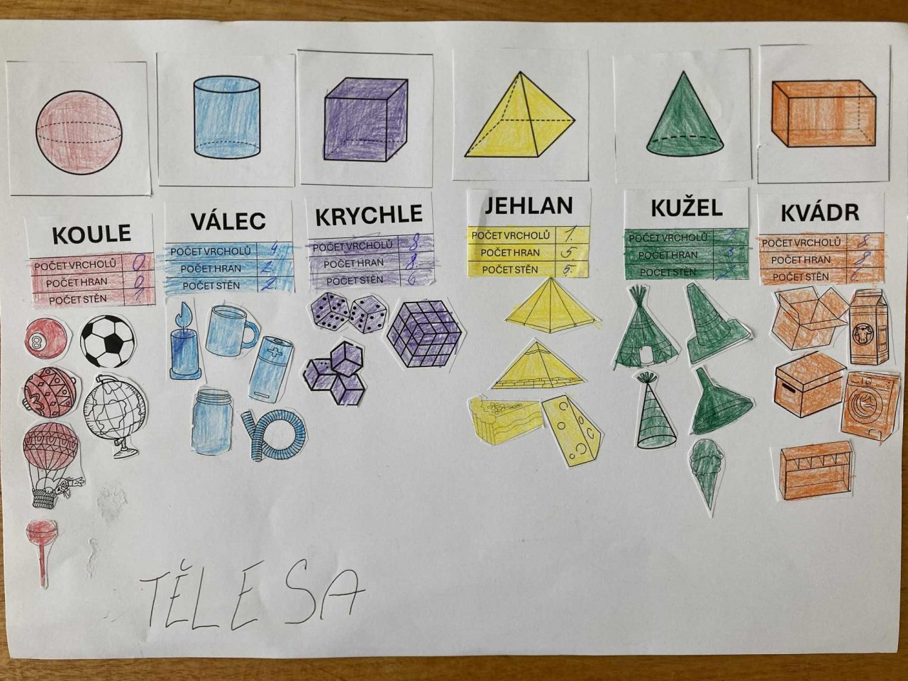 Žáci 6. třídy pracovali ve dvojicích a na výkres lepili obrázky různých těles. Ke každému tělesu přiřadili odpovídající obrázek a zopakovali si tak názvy i tvary jednotlivých těles. Práce je bavila a pomohla jim lépe pochopit prostorová tělesa