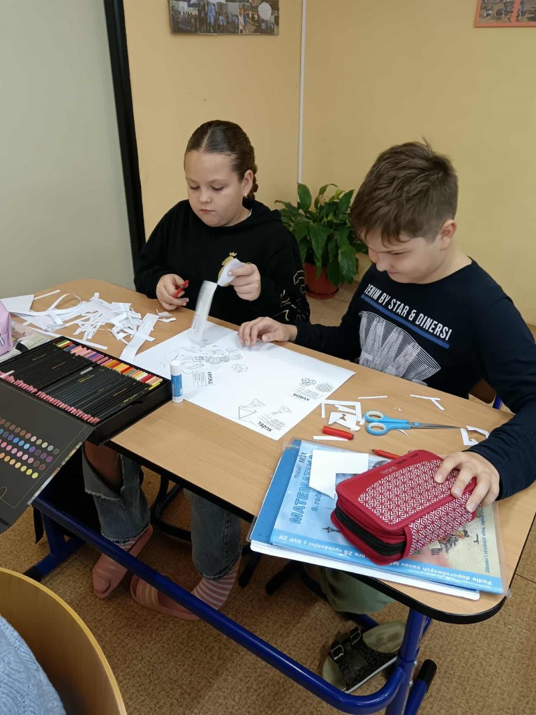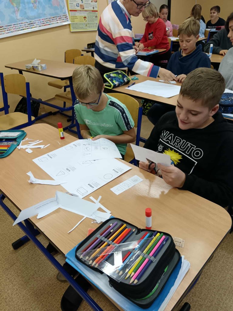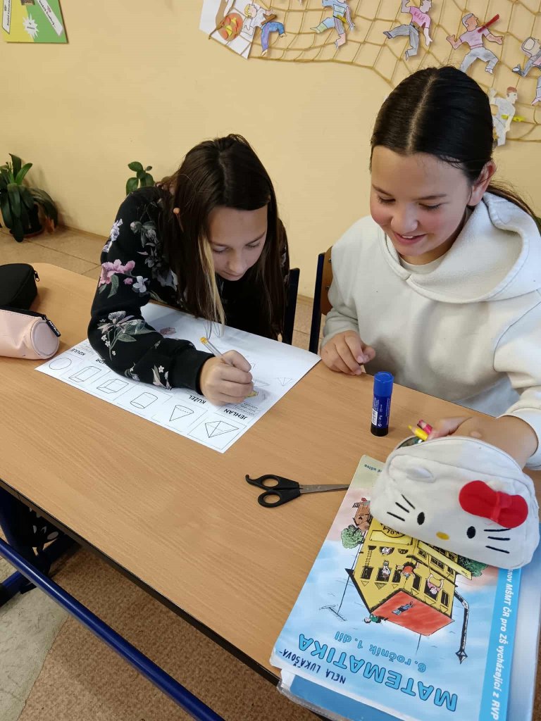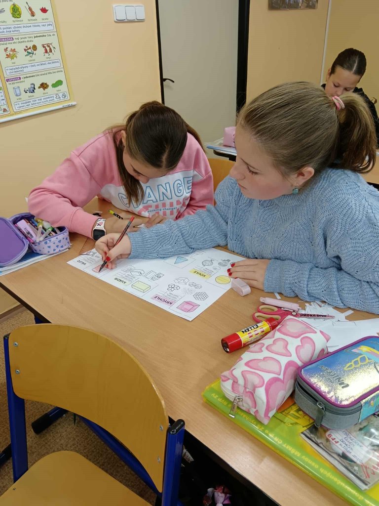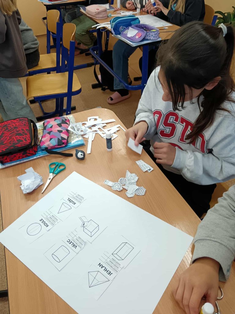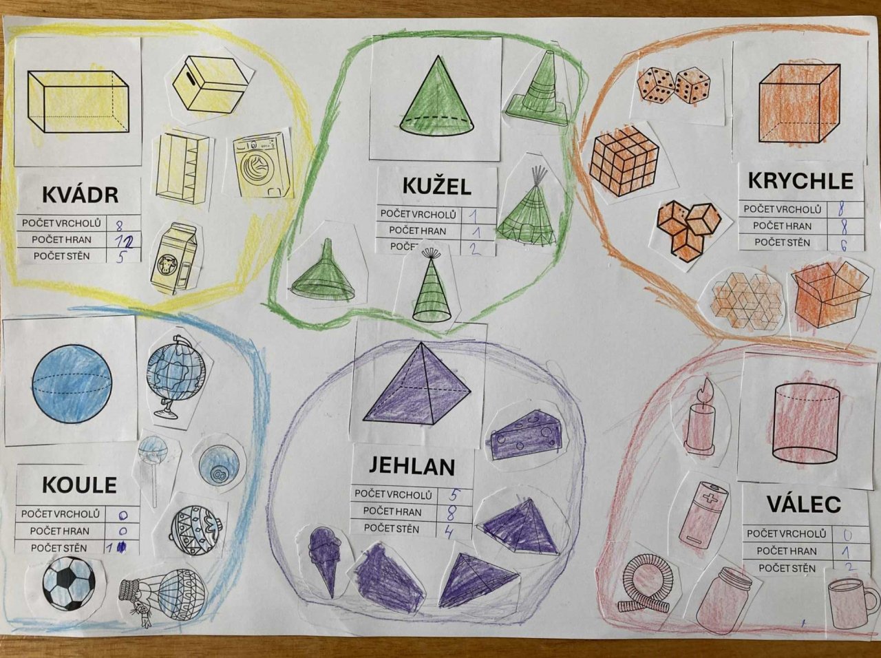 Žáci 6. třídy pracovali ve dvojicích a na výkres lepili obrázky různých těles. Ke každému tělesu přiřadili odpovídající obrázek a zopakovali si tak názvy i tvary jednotlivých těles. Práce je bavila a pomohla jim lépe pochopit prostorová tělesa