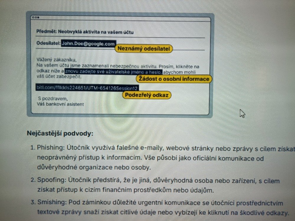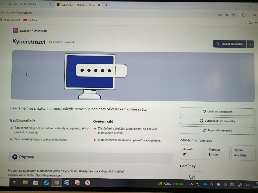 Žáci si také připomněli, jak mohou aktivně chránit svou digitální bezpečnost – například měnit hesla, používat PINy, aktualizovat antivirový program či dávat pozor na upozornění od bank, poskytovatelů služeb nebo policie.