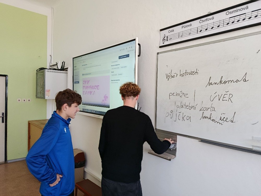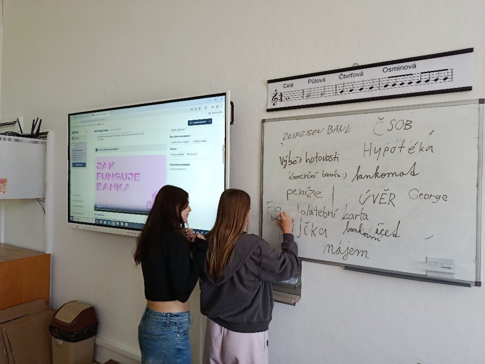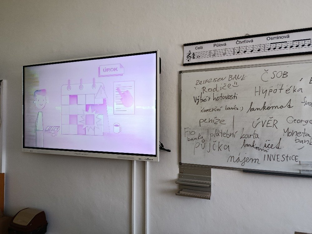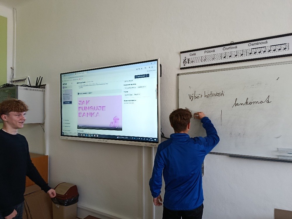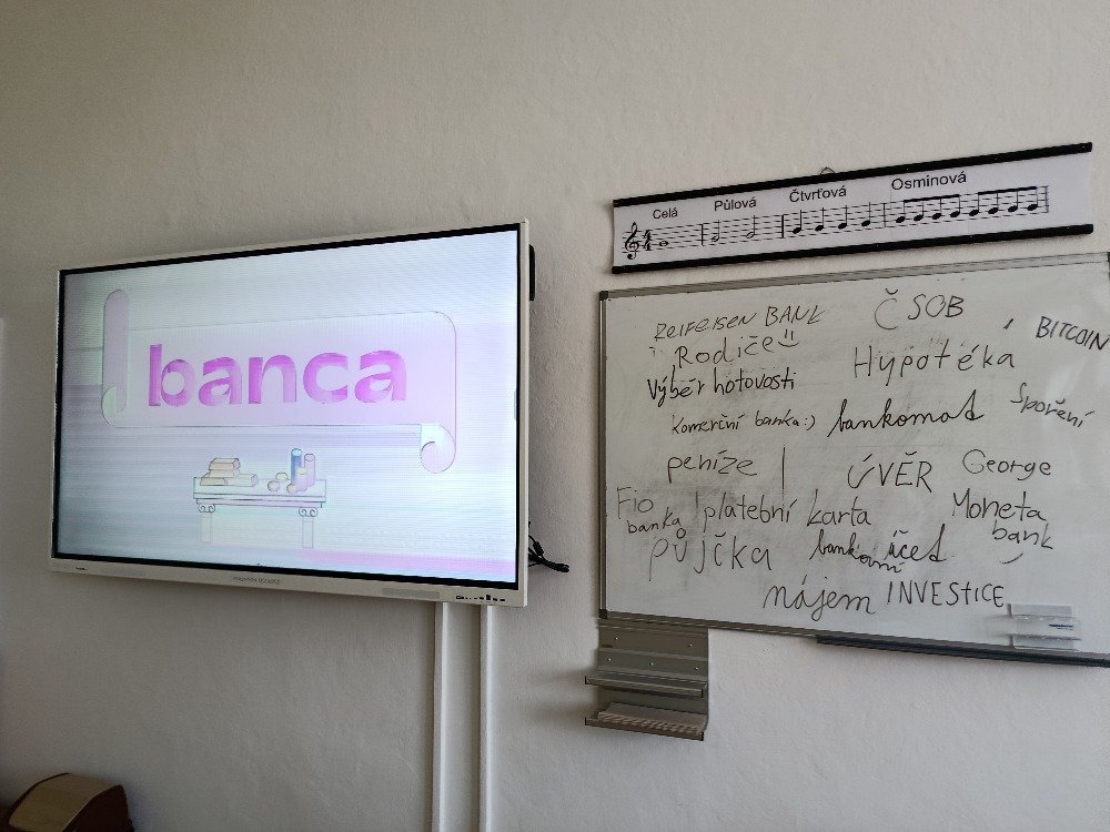 Datum: 9. 11. 2025V hodině VkO se žáci seznámili s tím, jak fungují banky a jaké základní služby nabízejí. Společně sledovali vzdělávací video, poté proběhla diskuze a tvorba myšlenkové mapy – žáci chodili k tabuli a zapisovali své postřehy.