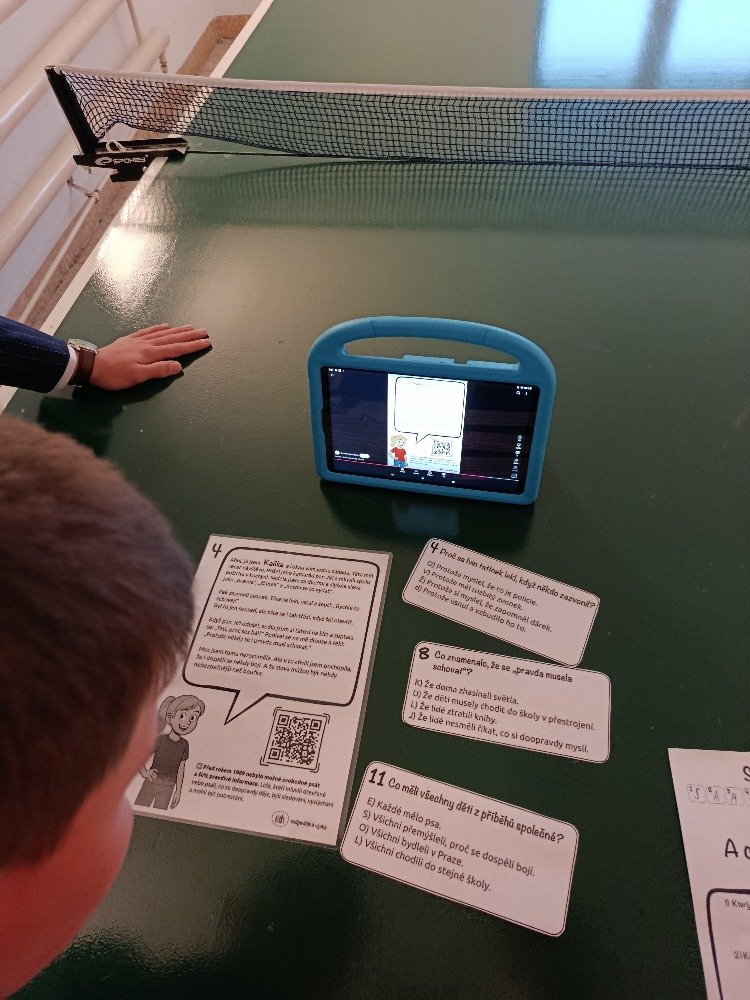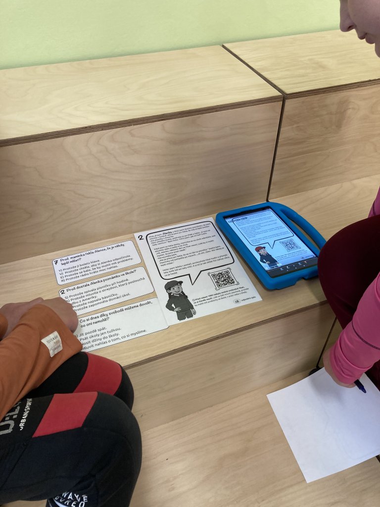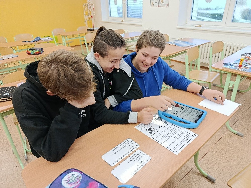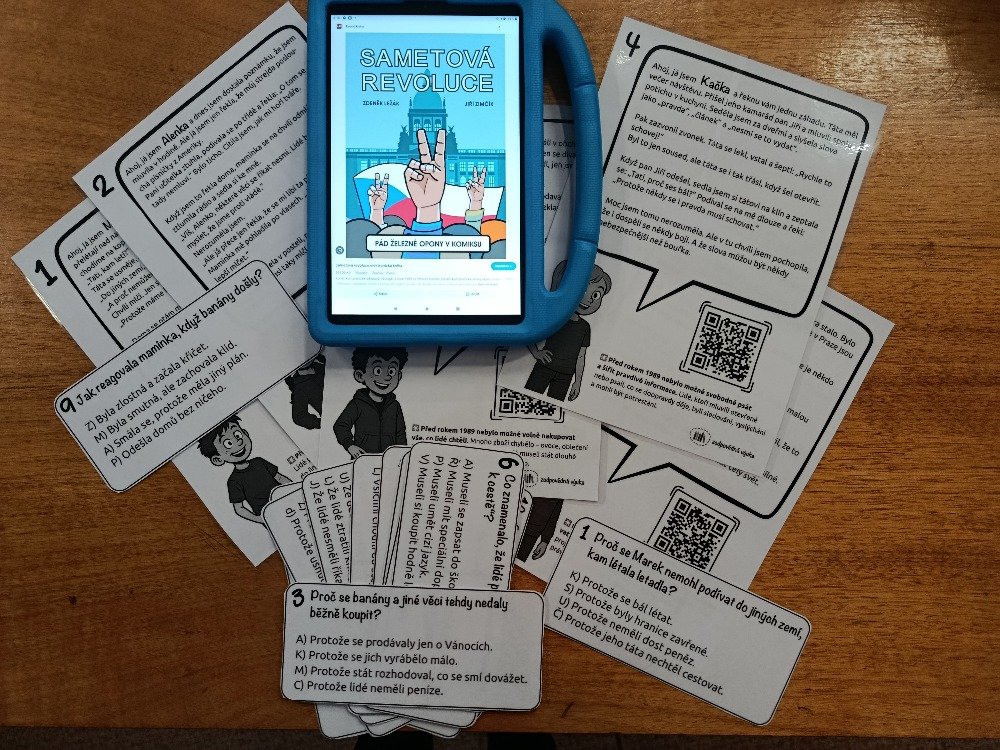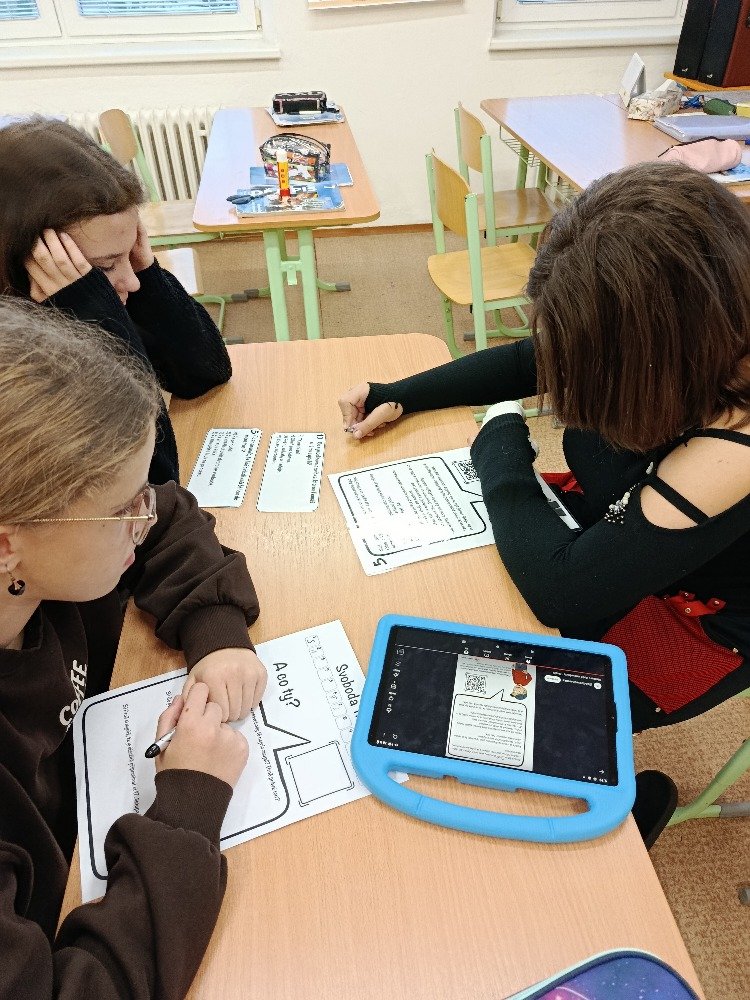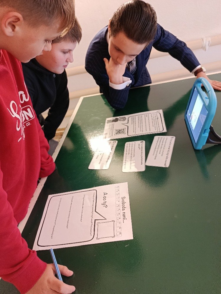 Poté se žáci rozdělili do skupin. Každá skupina obdržela zadání s QR kódem, pomocí něhož si pustila krátkou ukázku (o tom, že se nesmělo volně cestovat, jak lidé stáli fronty na banány či nemohli svobodně vyjadřovat své názory). Po poslechu žáci odpovídali na otázky.