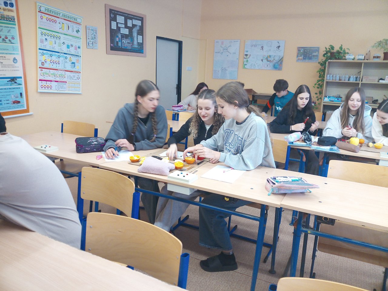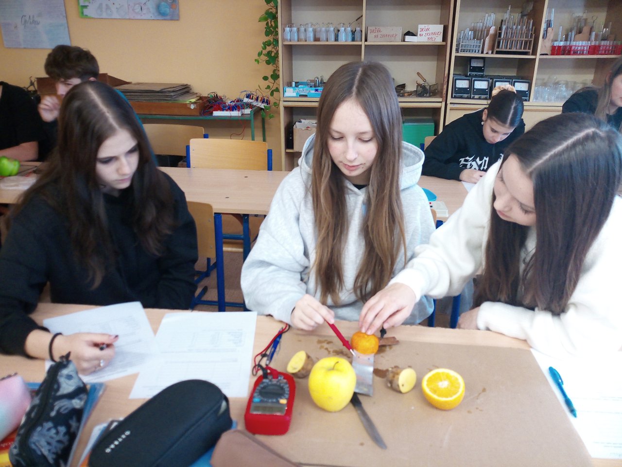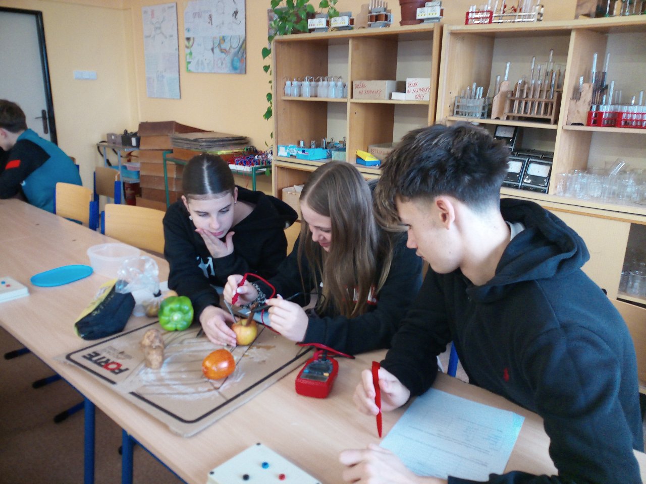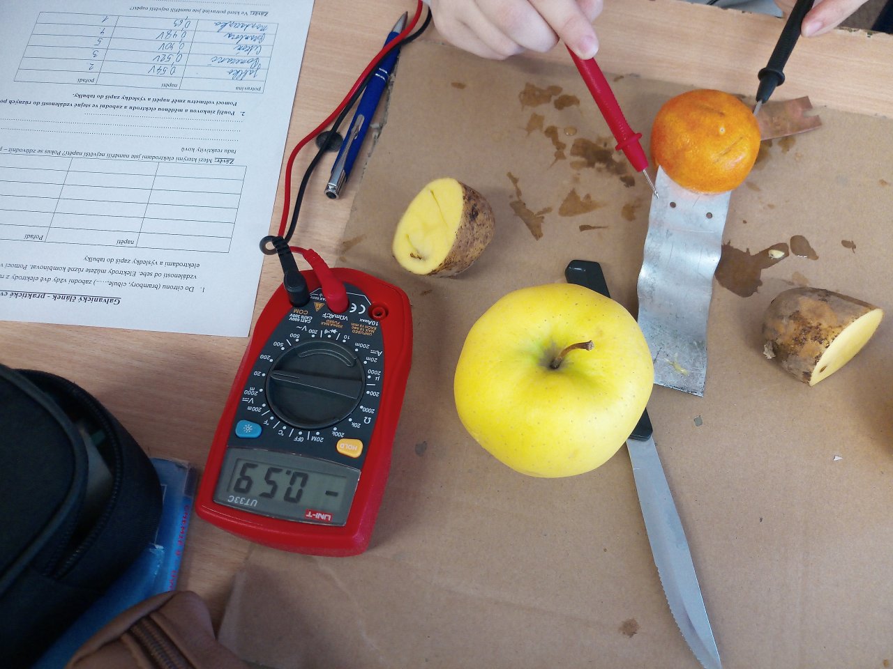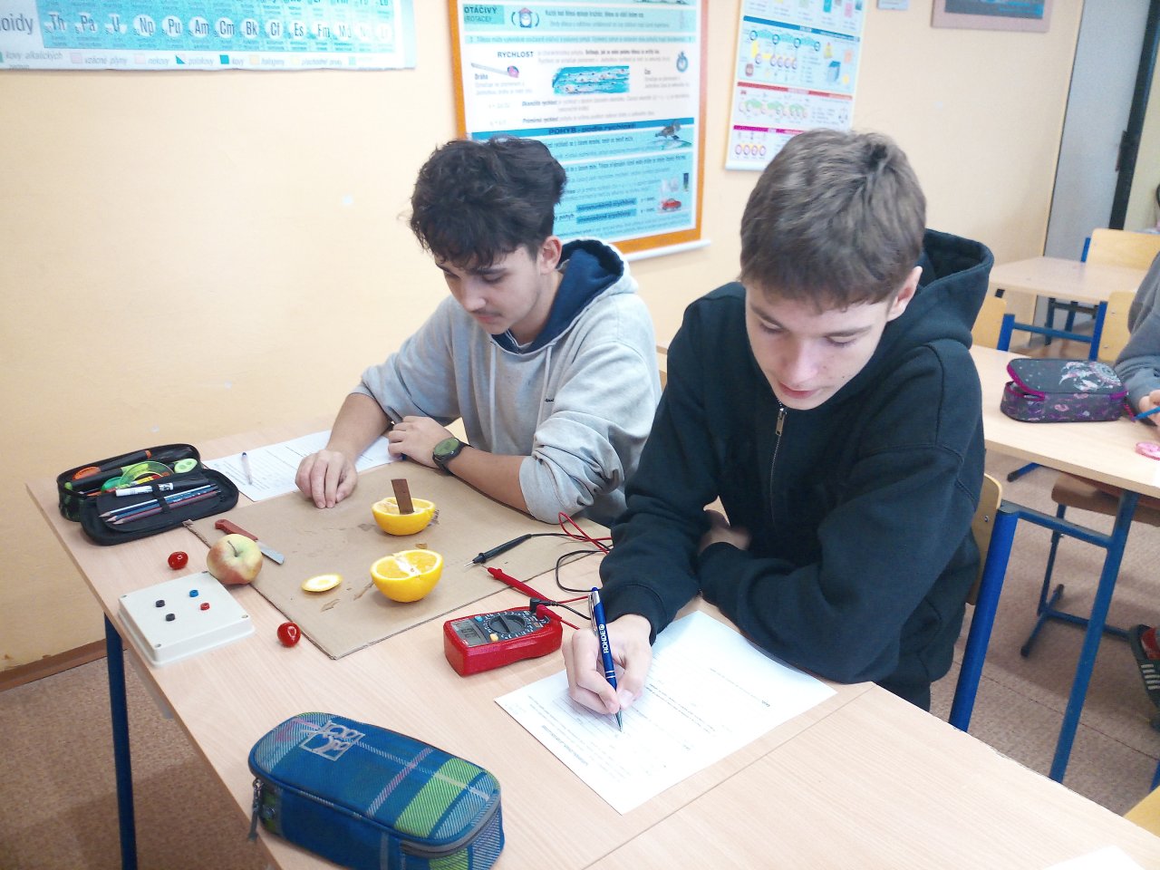 Datum: 19. 11. 2025V hodinách chemie si deváťáci vyzkoušeli, že elektřinu lze vyrobit i z běžných potravin. Z různých druhů ovoce a zeleniny – například citronů, brambor či jablek – sestavovali jednoduchý galvanický článek. Pomocí dvou různých kovů zapíchnutých do dužiny vytvořili podmínky pro vznik elektrického napětí, které následně měřili multimetrem.