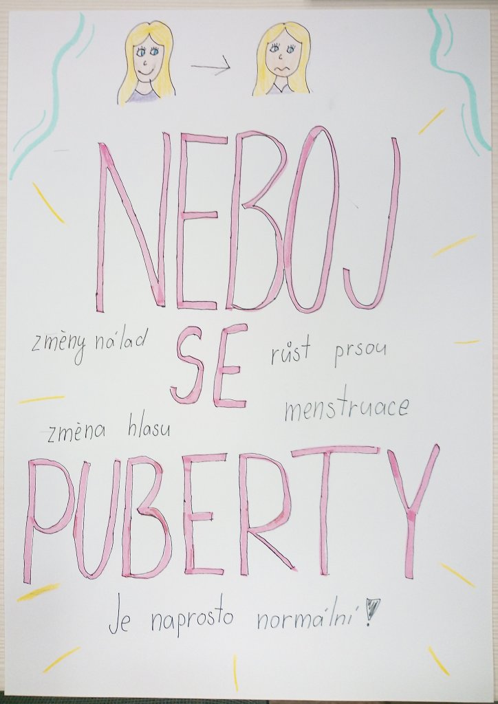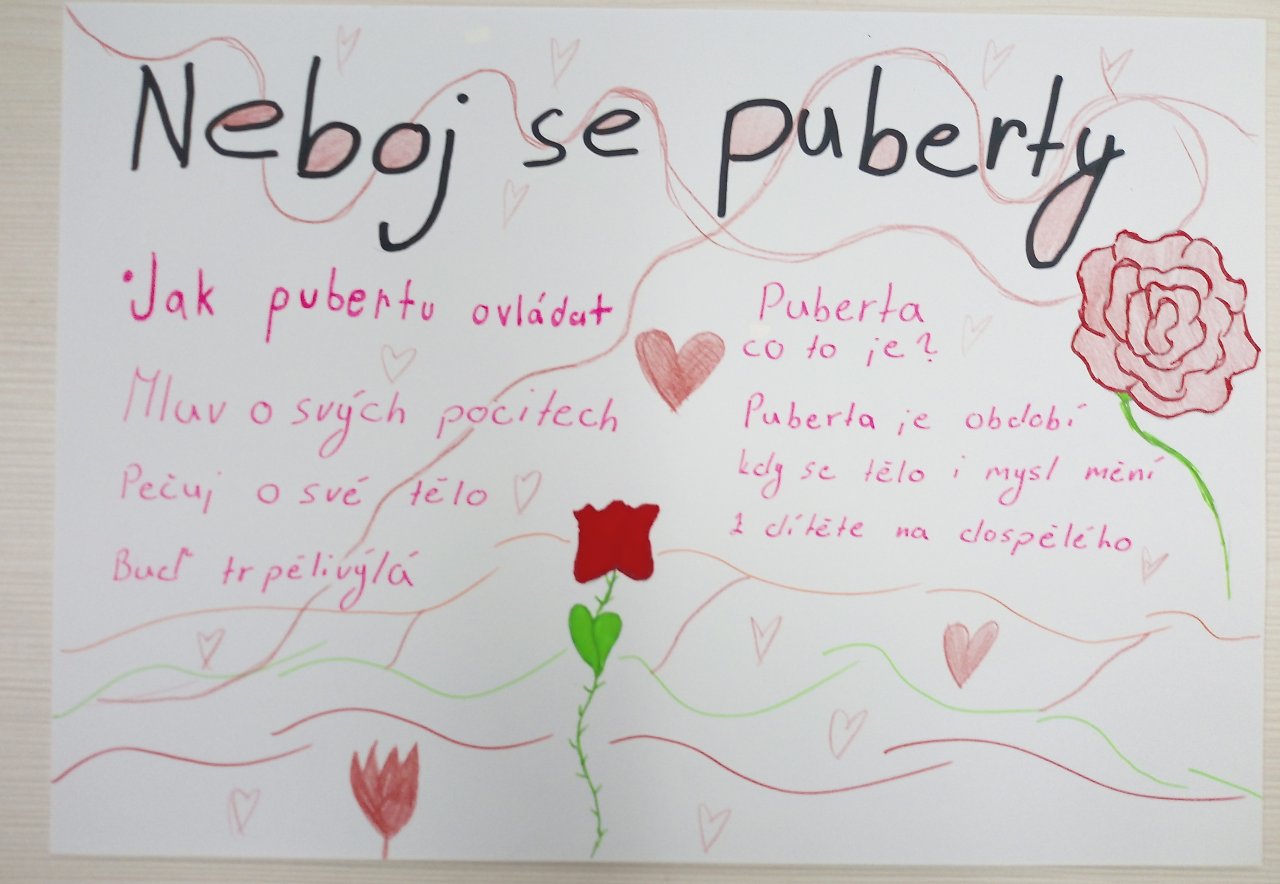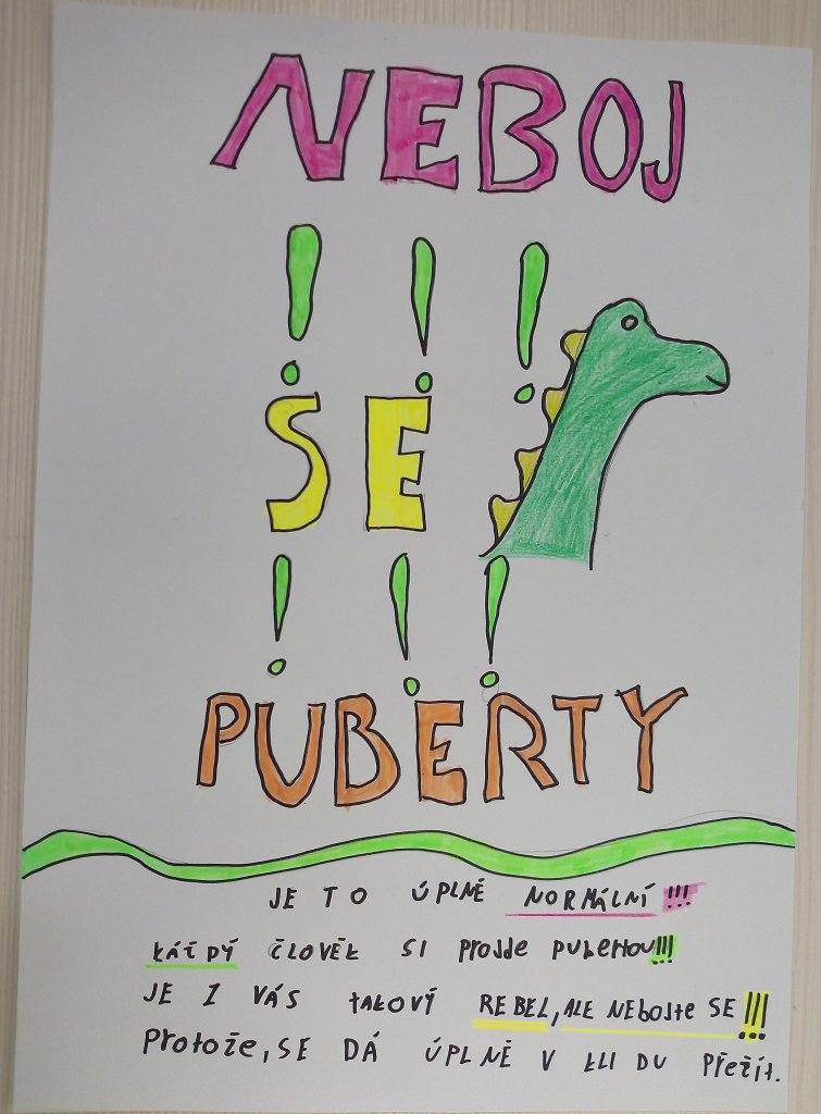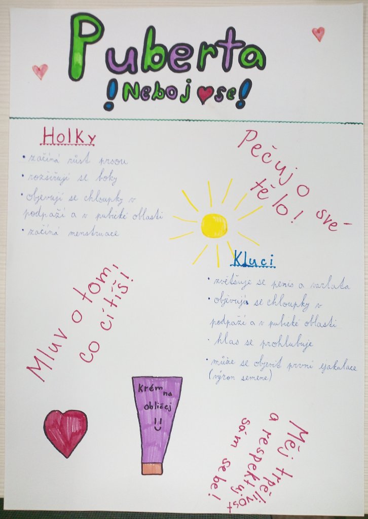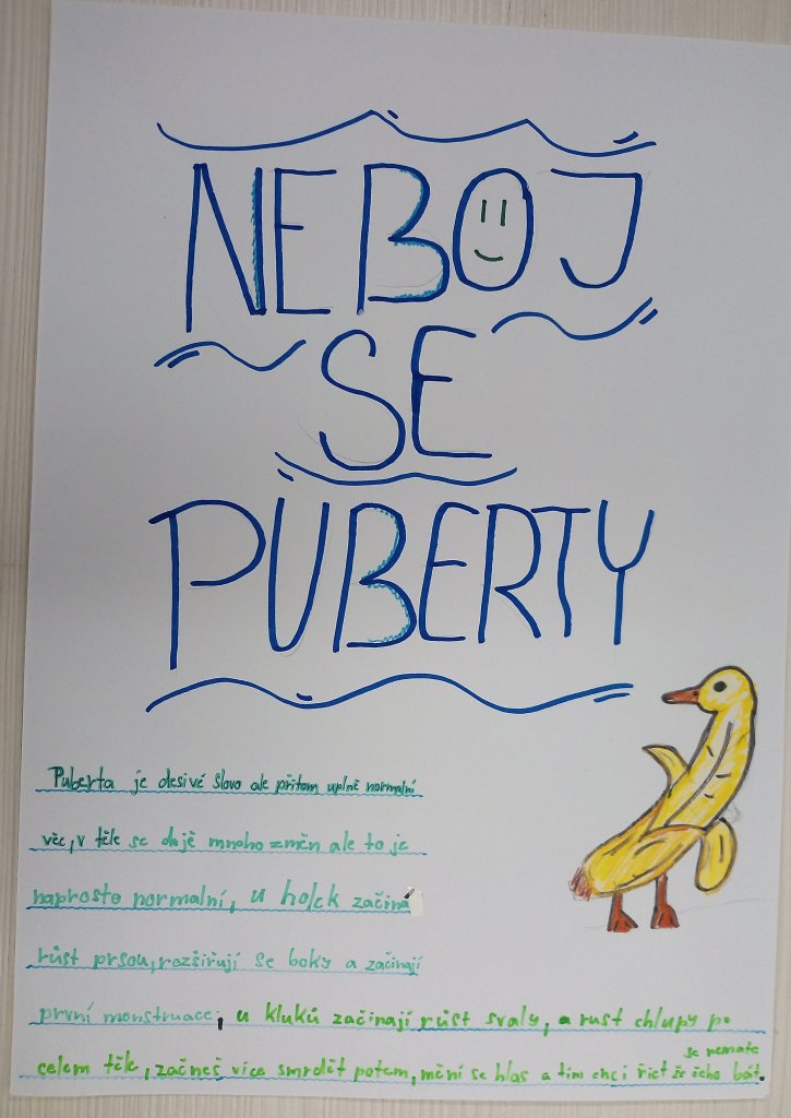 Během práce ve skupinách vybírali informace, kreslili, psali krátké rady a doplňovali plakát o vtipné, ale poučné ilustrace. Kromě fyzických změn se zaměřili i na psychiku, vztahy a zdravé sebevědomí.