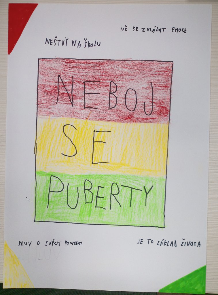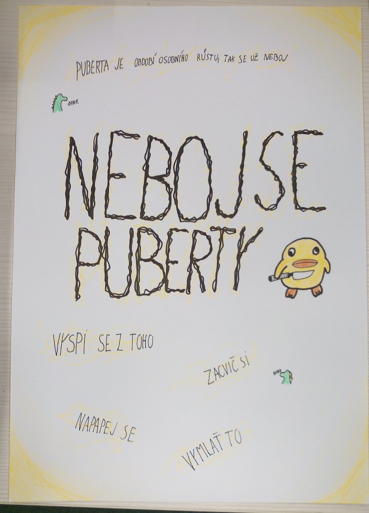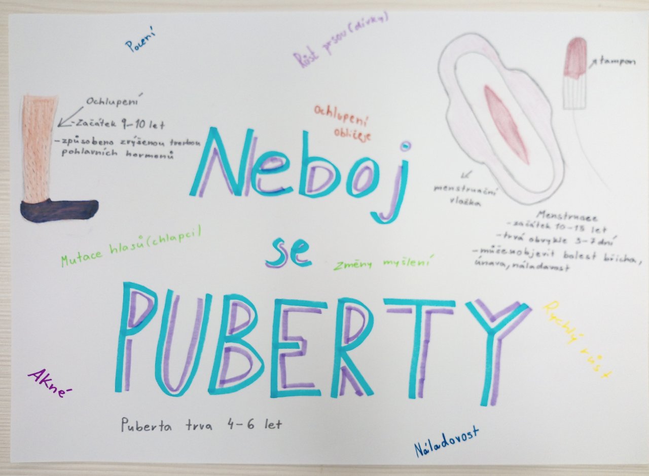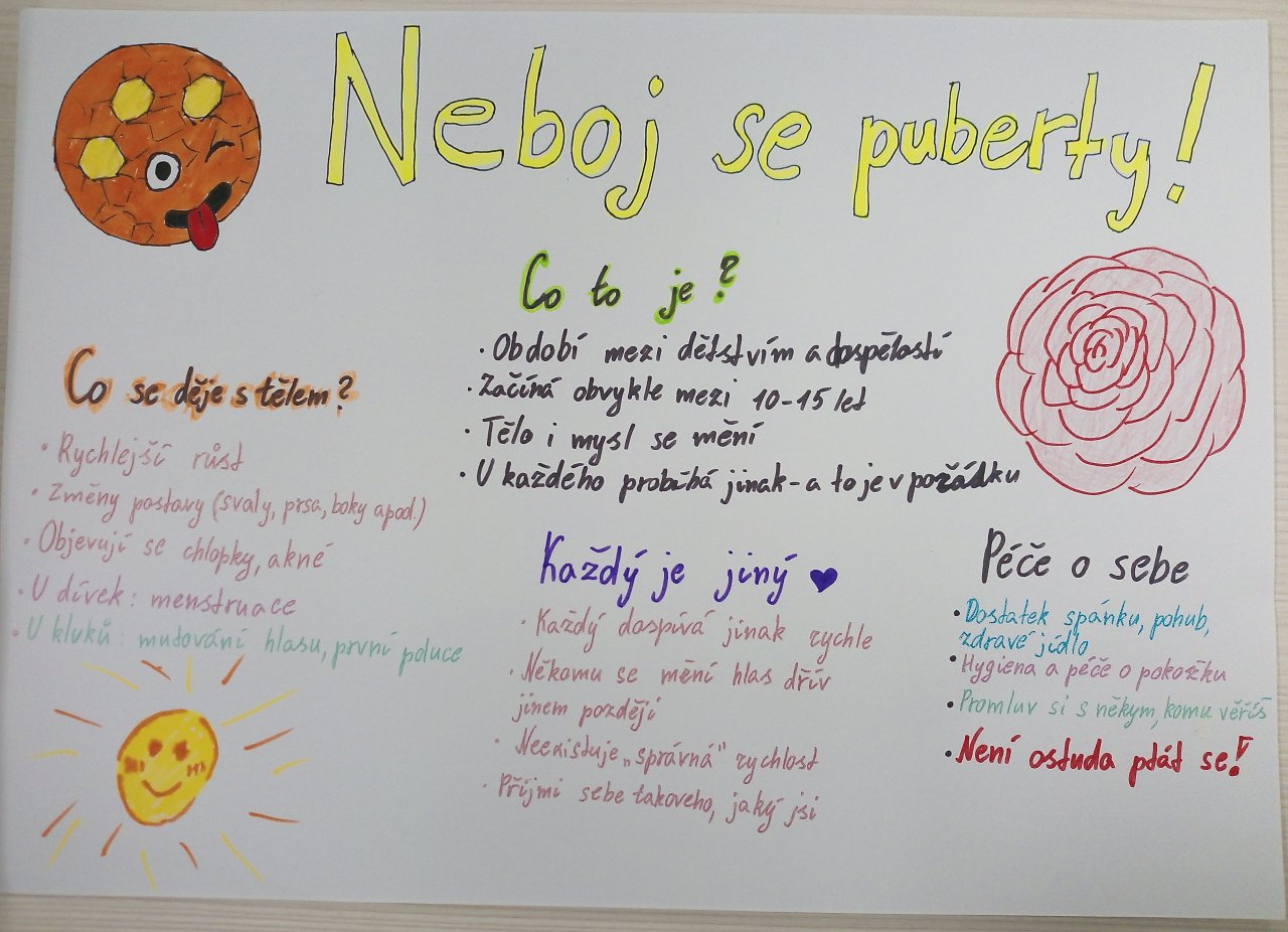 Během práce ve skupinách vybírali informace, kreslili, psali krátké rady a doplňovali plakát o vtipné, ale poučné ilustrace. Kromě fyzických změn se zaměřili i na psychiku, vztahy a zdravé sebevědomí.