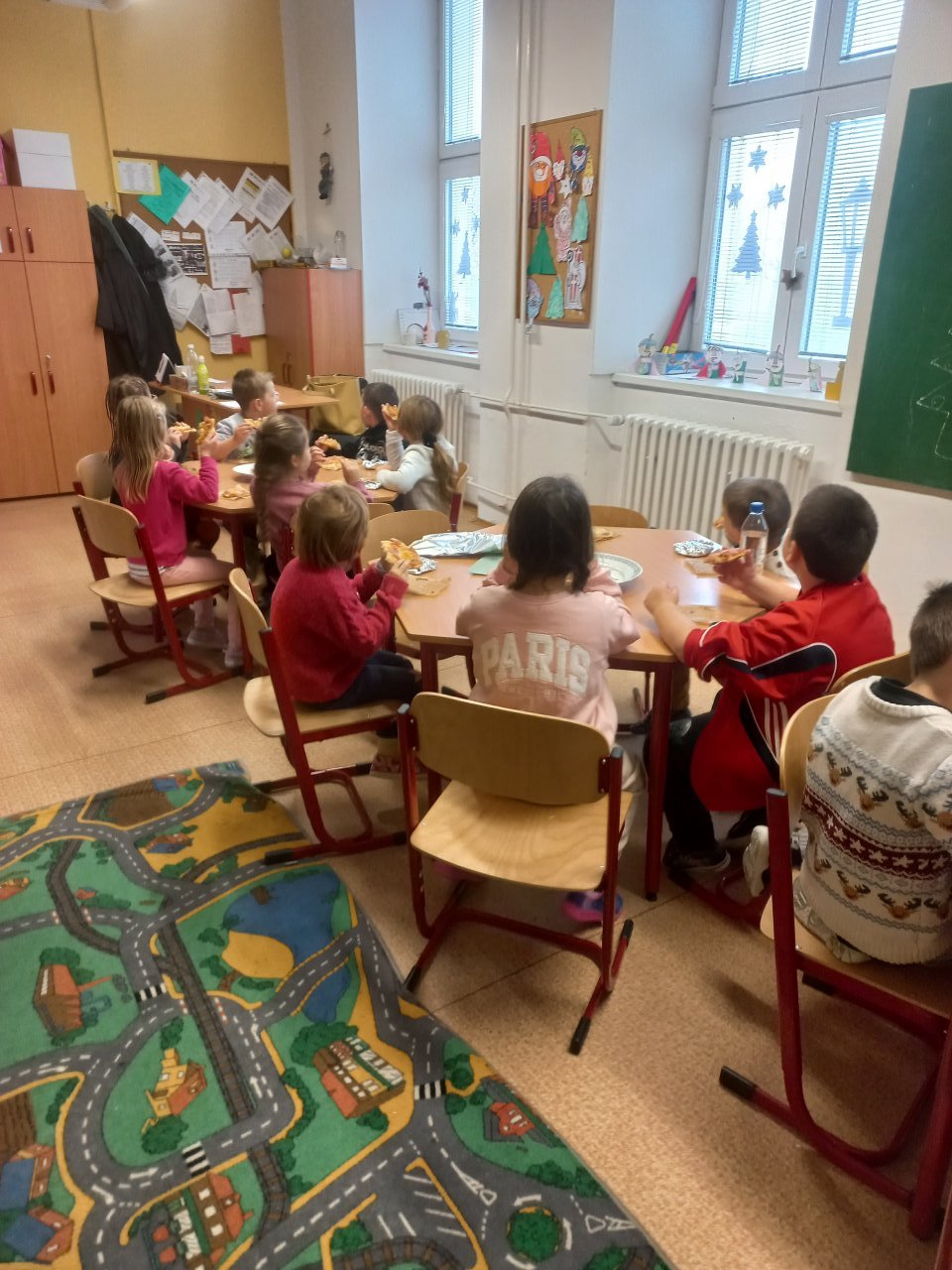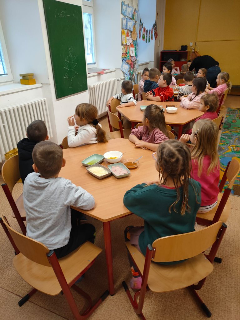 Datum: 20. 11. 2025Ve středu 12. 11. a v pátek 14. 11. k nám zavítaly děti mateřských škol z Valtrovic, Dyjákovic a Velkého Karlova. Společně s našimi prvňáčky si připravily chutnou svačinku v podobě vlastnoručně vytvořené pizzy, na které si všichni s nadšením pochutnali.