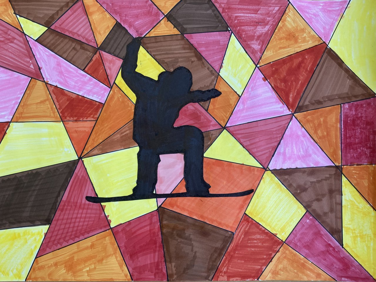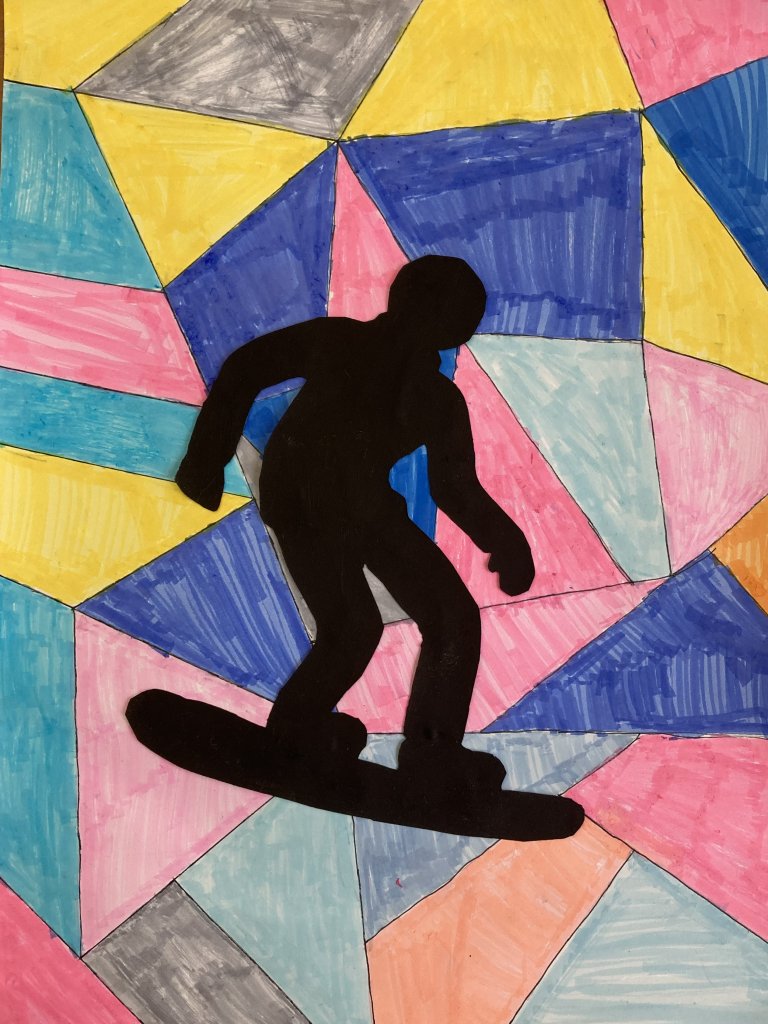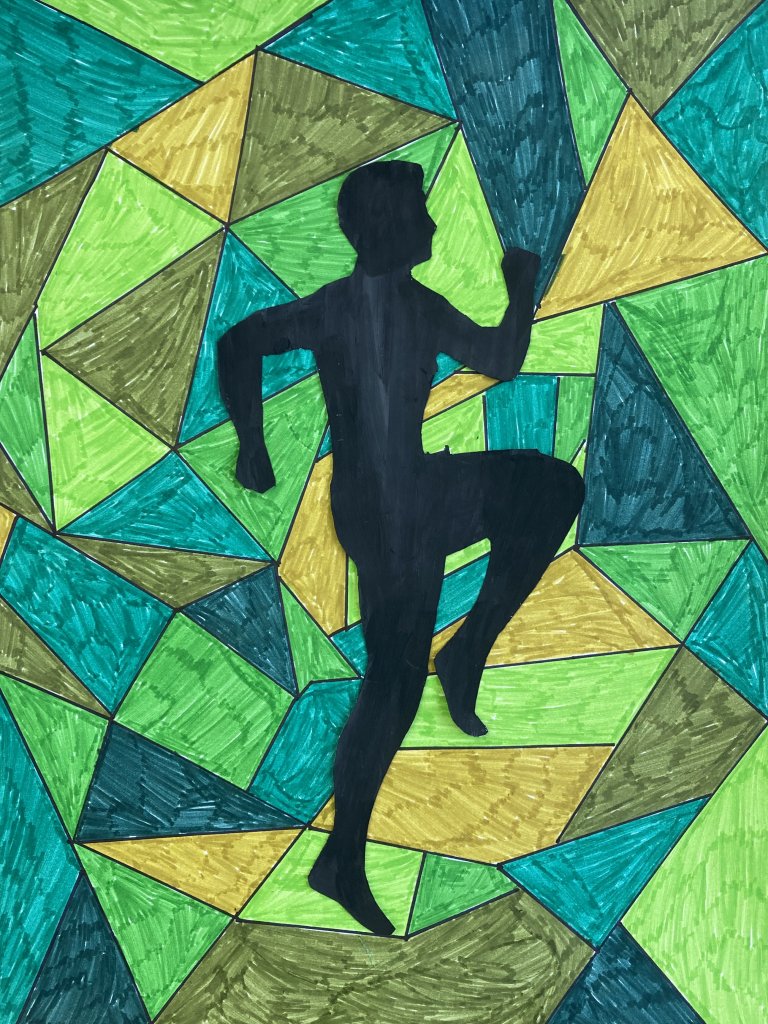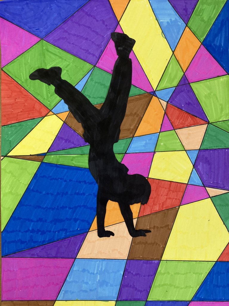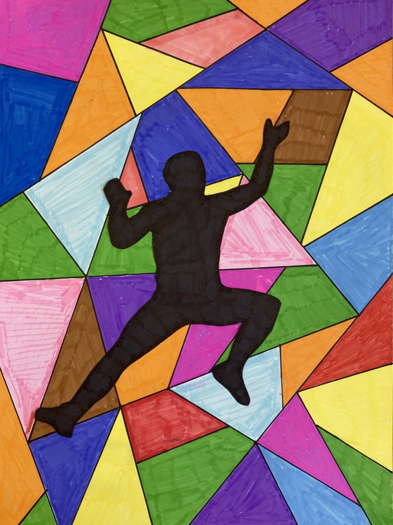 Datum: 20. 11. 2025Úkolem žáků bylo vytvořit obrázek, který bude připomínat vitráž. Nejprve si rozdělili papír na mnoho nepravidelných tvarů a ty potom vybarvili různými barvami. Nakonec do středu nalepili černou siluetu pohybující se postavy tak, aby na barevném pozadí dobře vynikla.
