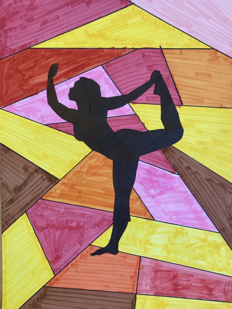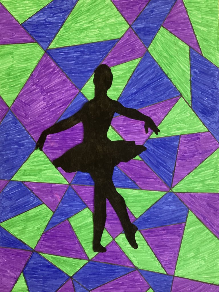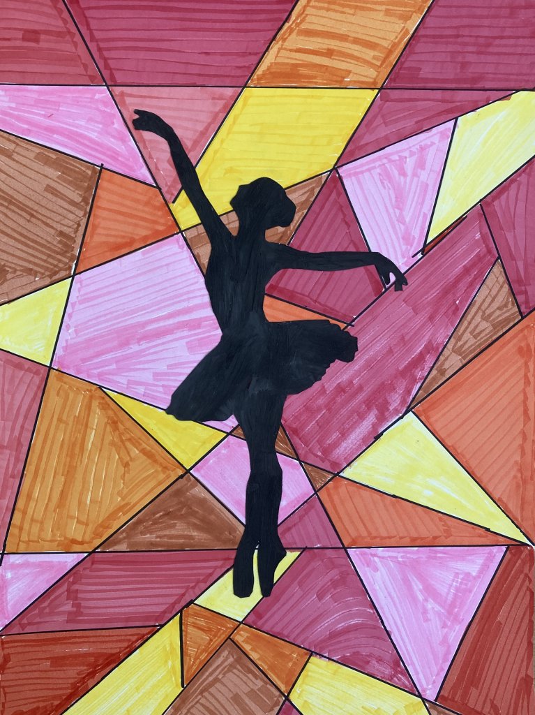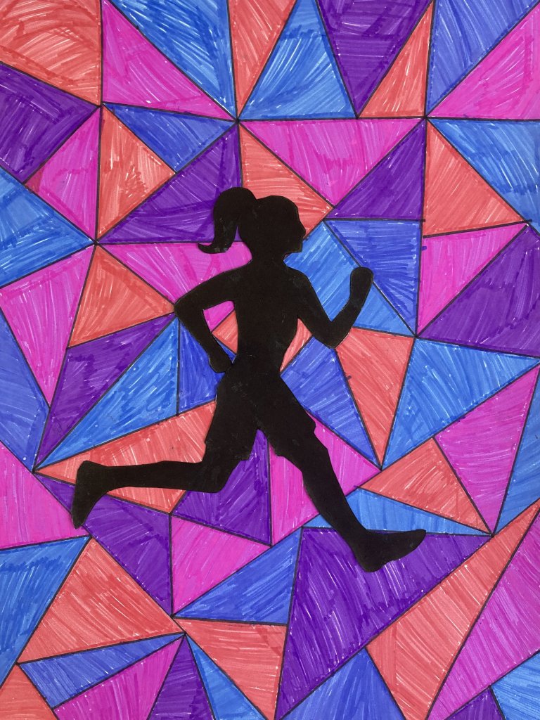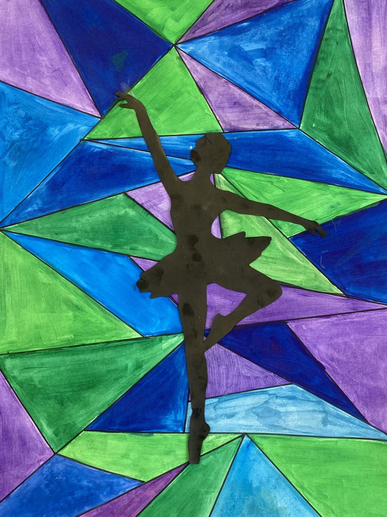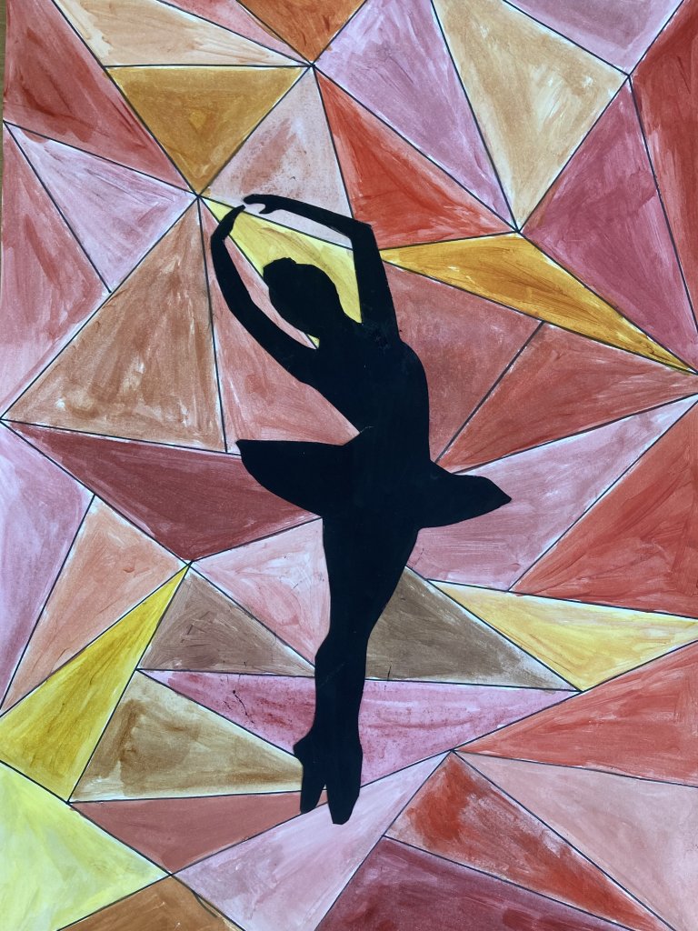 Datum: 20. 11. 2025Úkolem žáků bylo vytvořit obrázek, který bude připomínat vitráž. Nejprve si rozdělili papír na mnoho nepravidelných tvarů a ty potom vybarvili různými barvami. Nakonec do středu nalepili černou siluetu pohybující se postavy tak, aby na barevném pozadí dobře vynikla.