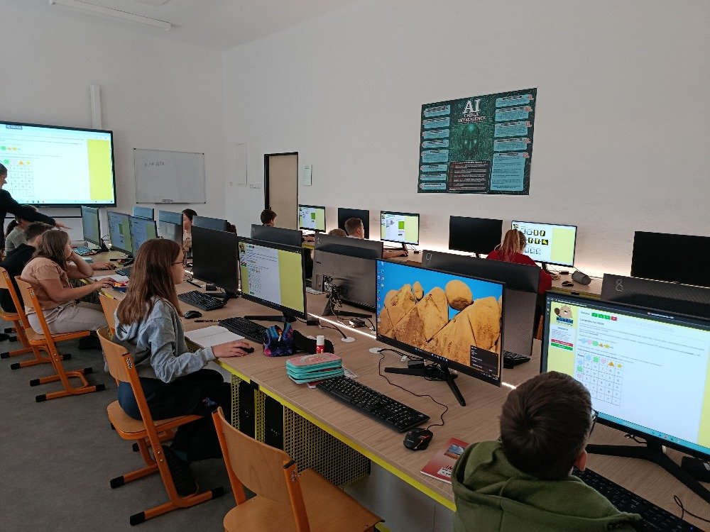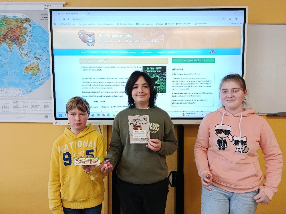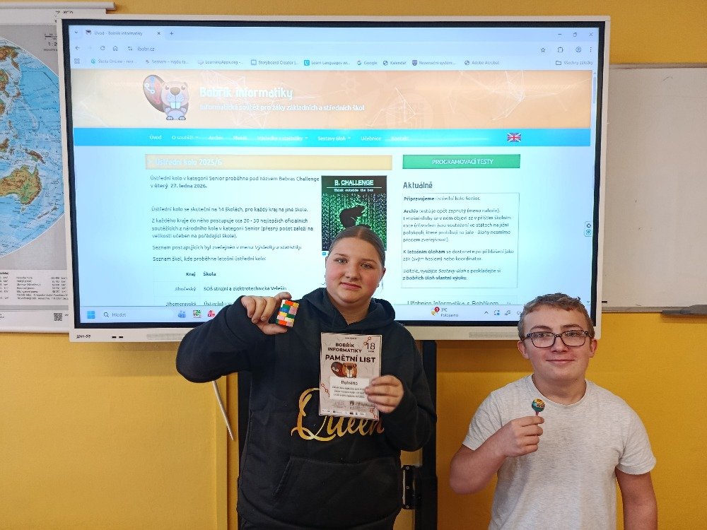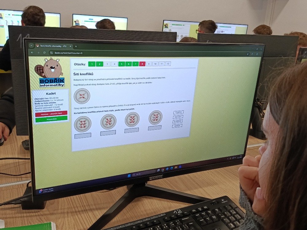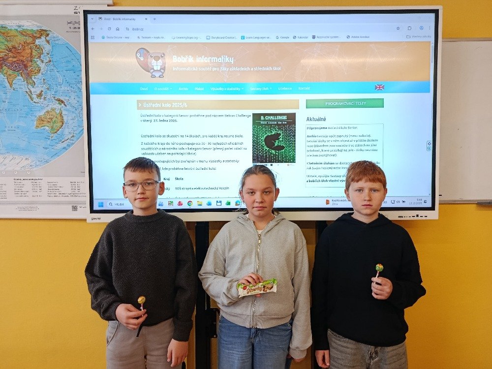 Datum: 24. 11. 2025Žáci naší školy se i letos zapojili do celostátní soutěže Bobřík informatiky, která prověřuje logické a informatické dovednosti. Soutěžící měli za úkol během 40 minut vyřešit 12 úloh, zahrnujících logické hlavolamy i programovací úkoly vytvářené pomocí blokového programování. Maximálně mohli nasbírat 192 bodů – “bobů”. Každý, kdo získal 120 bodů a více, se stal úspěšným řešitelem a symbolicky tak ulovil svého bobříka informatiky.