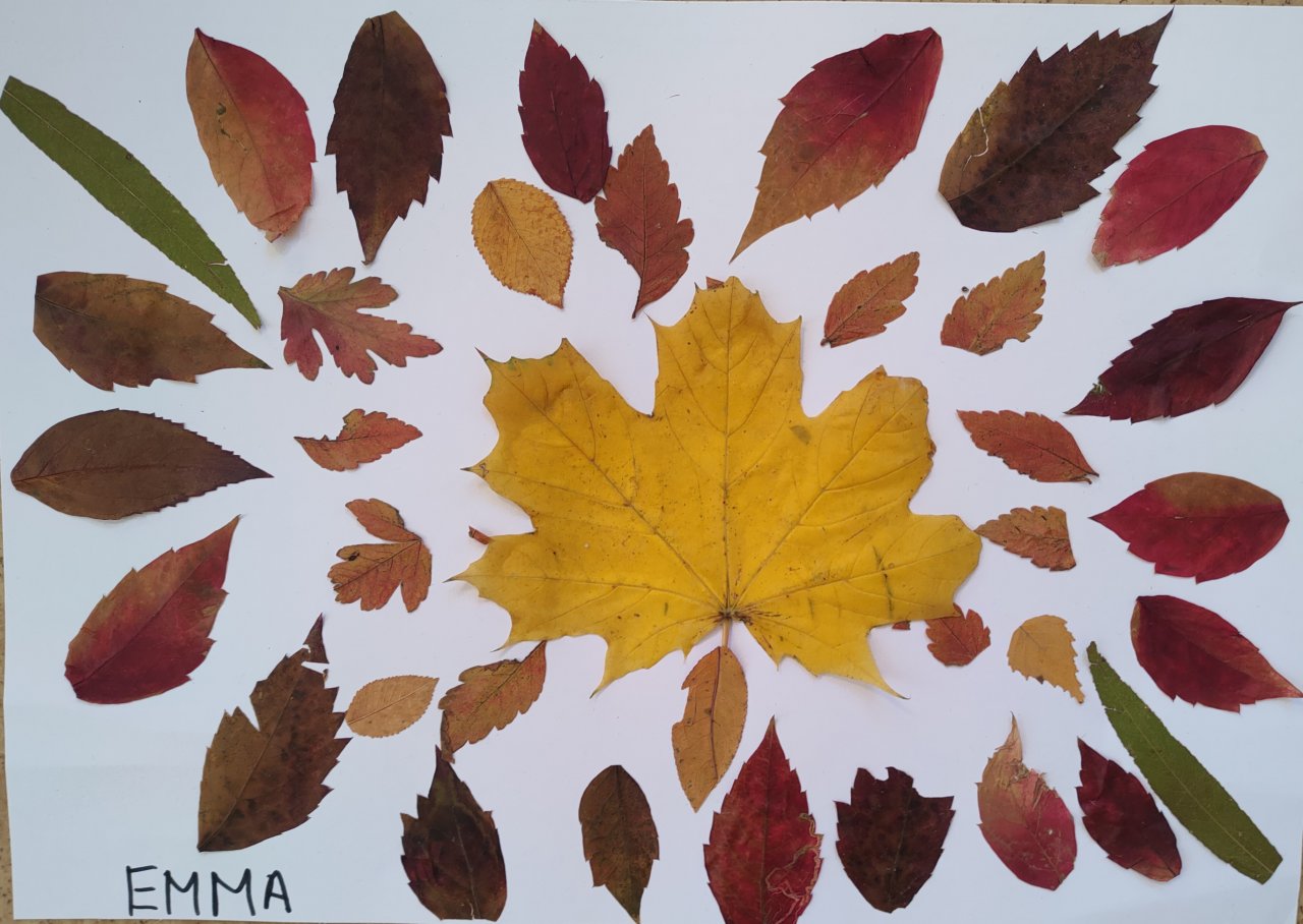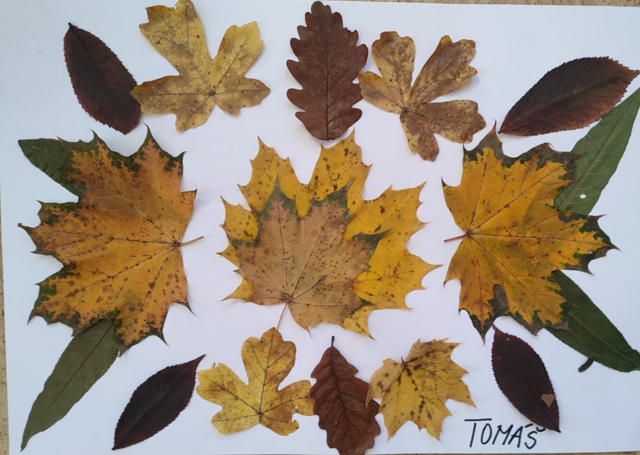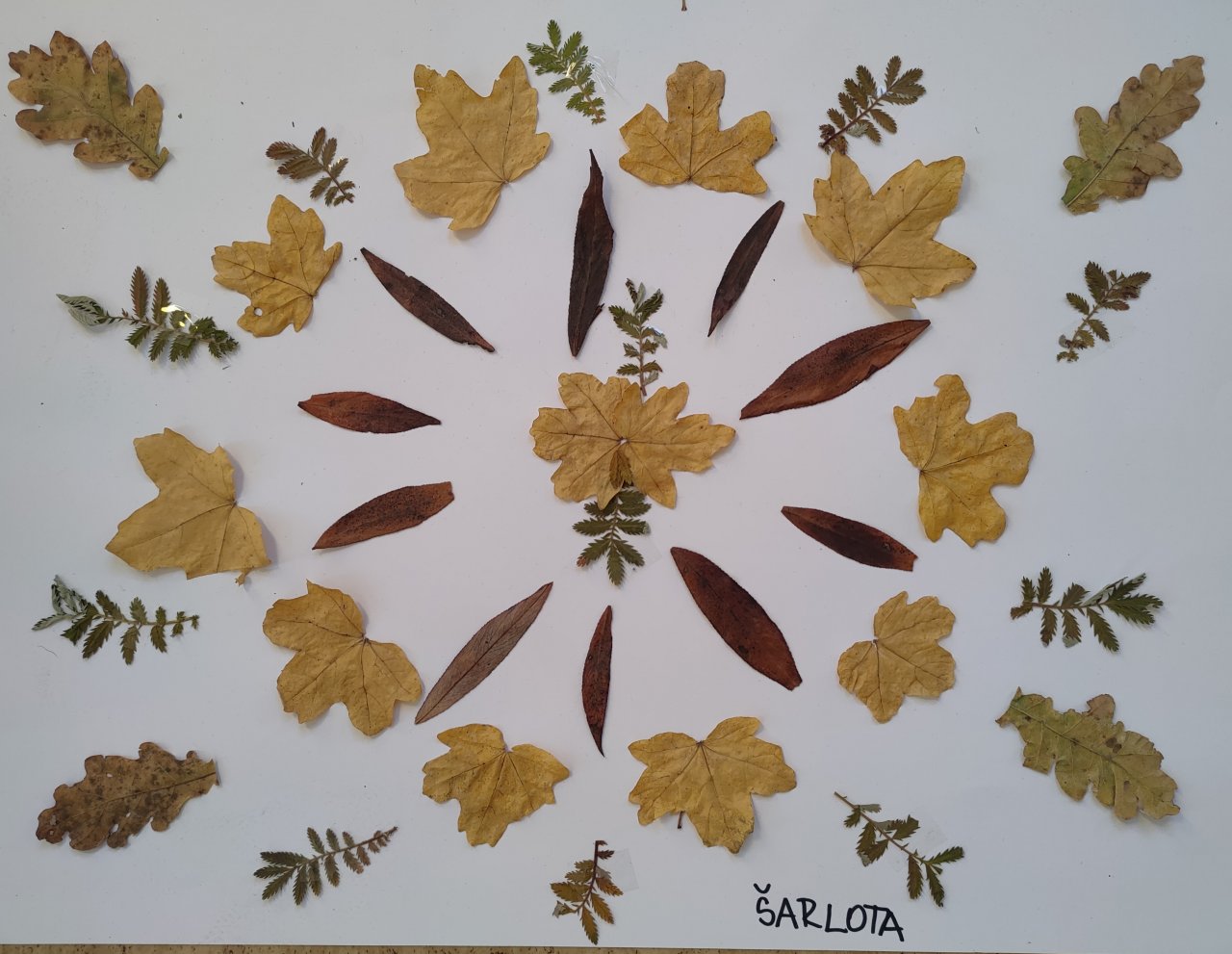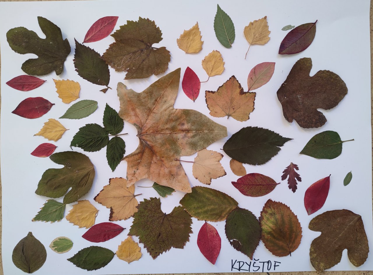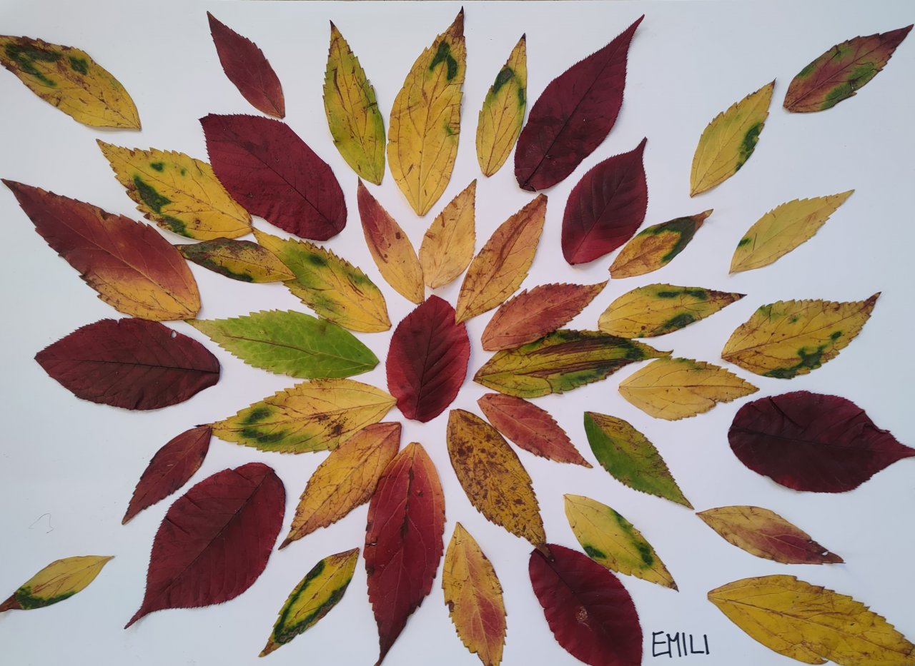 Žáci nasbírané a vylisované listy seskládali do tvarů připomínajících mandaly a poté je nalepili.