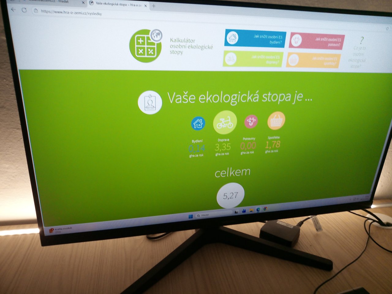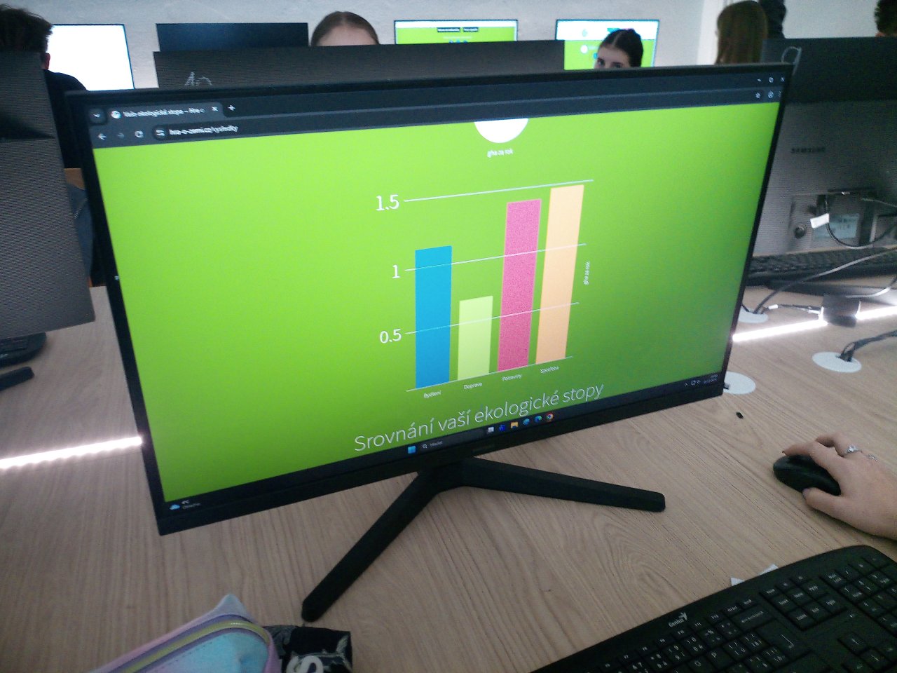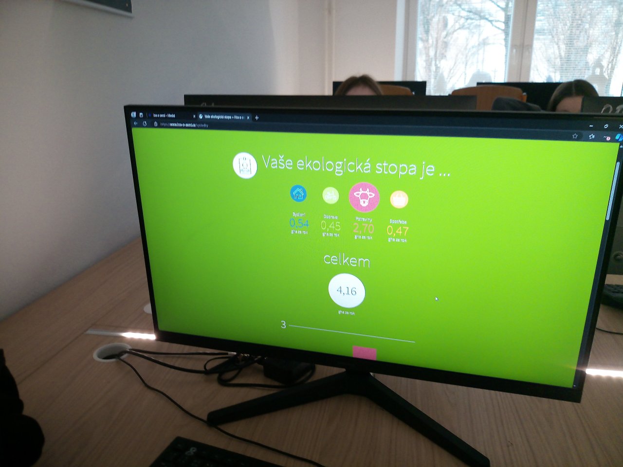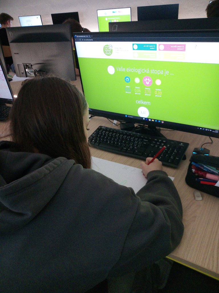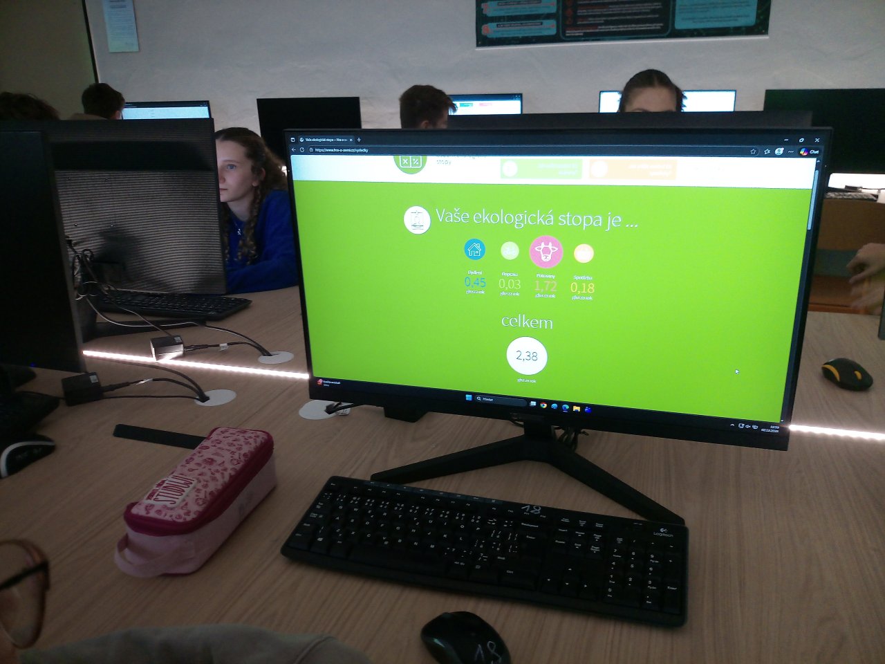 Po úvodní diskusi si každý žák online vypočítal vlastní ekologickou stopu. Výsledky byly pro mnohé překvapivé a často vedly k zamyšlení nad tím, co by se dalo změnit. Žáci porovnávali své výsledky, hledali rozdíly a přemýšleli o tom, jak by mohli svou stopu v budoucnu snížit.