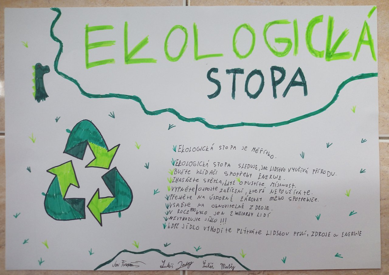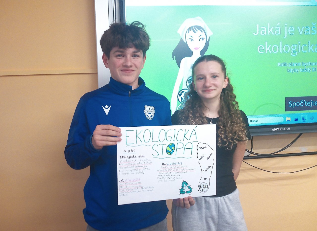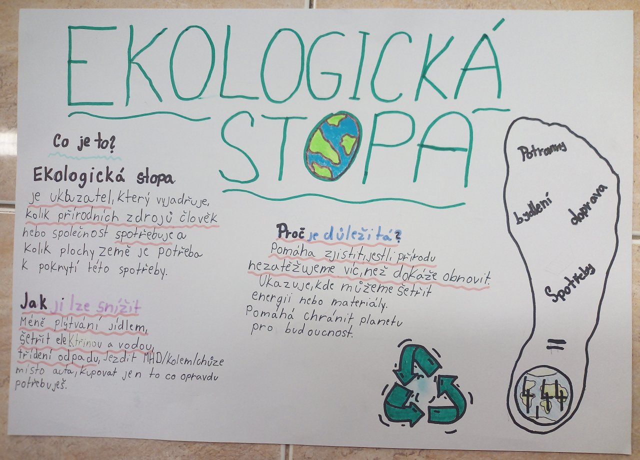 Datum: 3. 12. 2025Žáci 9. třídy se v hodinách chemie věnovali tématu ekologická stopa. Na úvod zhlédli krátké video, které je seznámilo s tím, jak naše každodenní rozhodnutí ovlivňují planetu – od způsobu dopravy až po to, co jíme. Video ukázalo, že ekologická stopa není jen pojem z učebnice, ale skutečný ukazatel toho, jak šetrně či nešetrně žijeme.