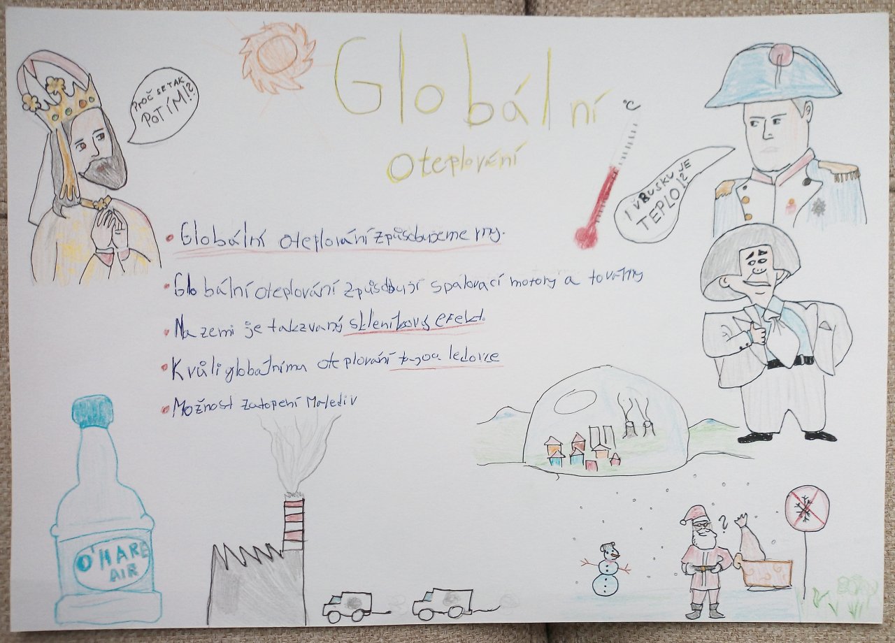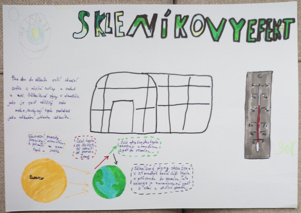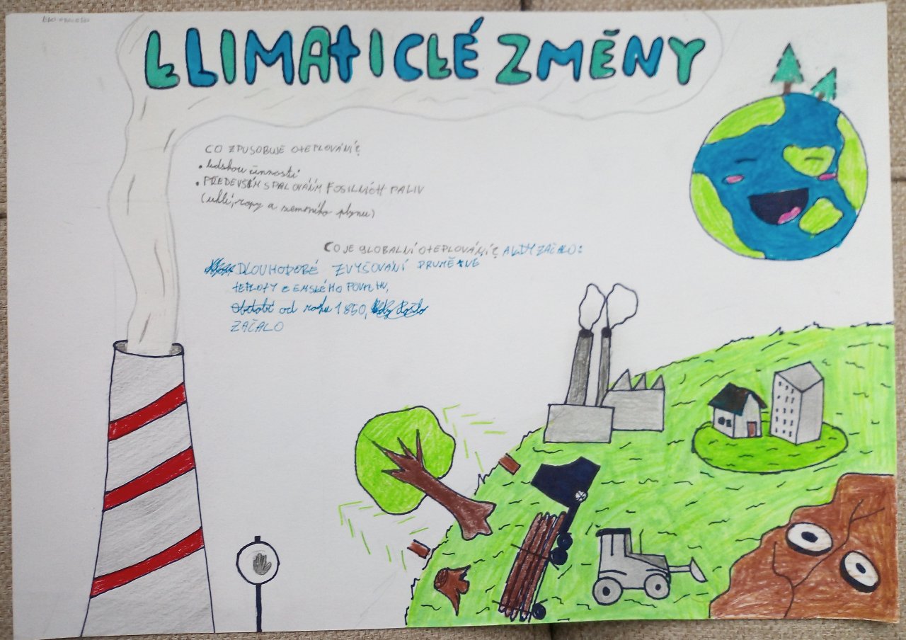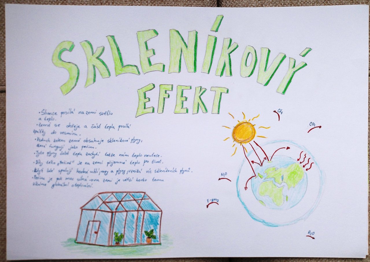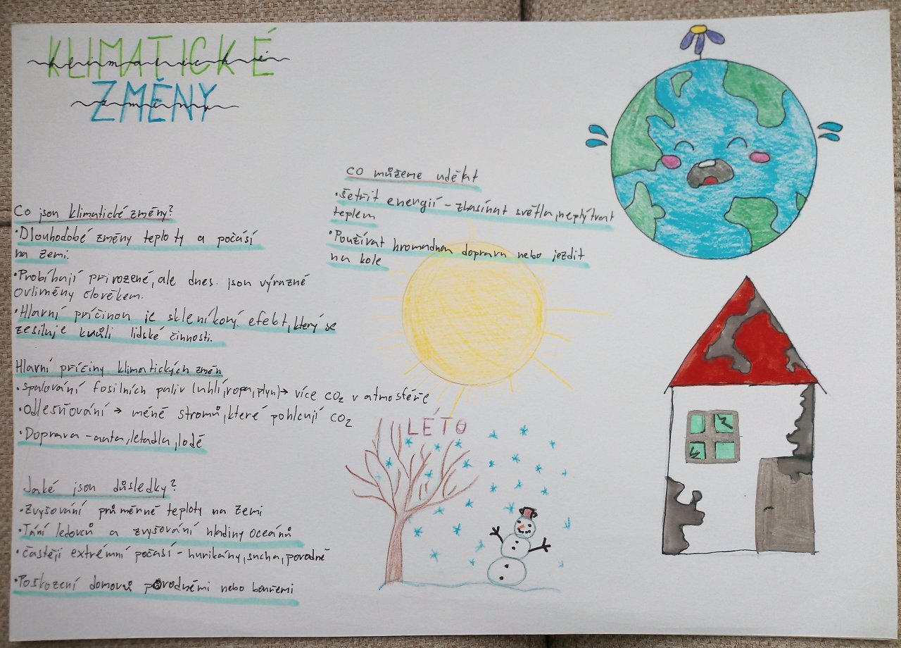 Následovala krátká diskuse. Poté žáci pracovali ve skupinách a vytvářeli jednoduché plakáty s využitím internetu, kde vyhledávali konkrétní informace k vybraným oblastem, například extrémní počasí, znečištění ovzduší nebo ochrana přírody.