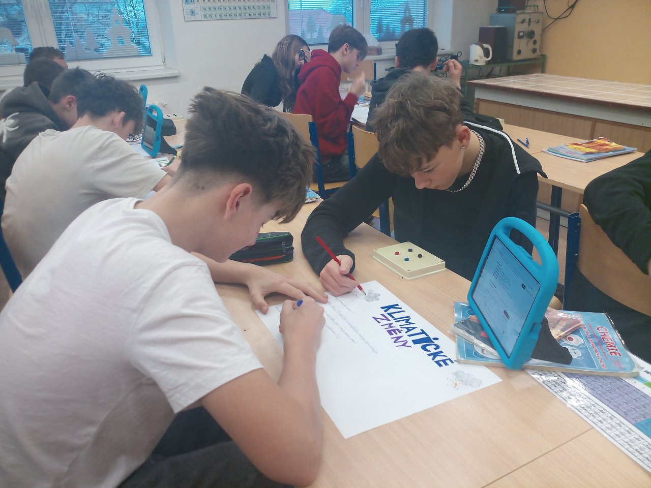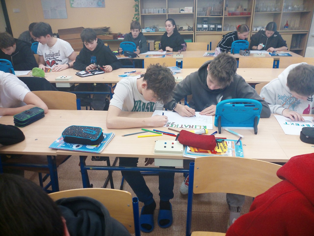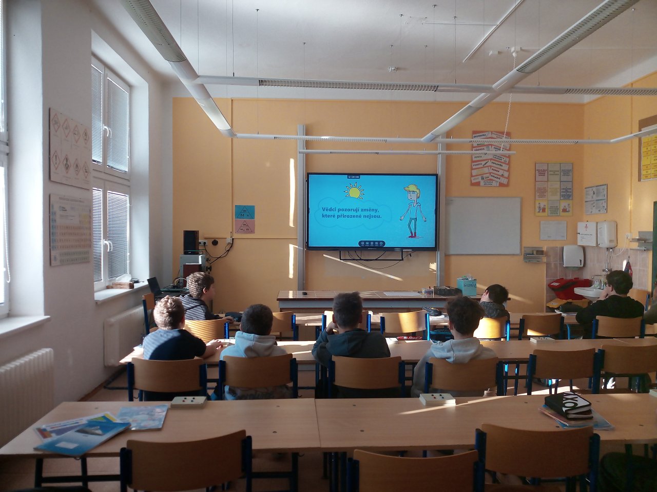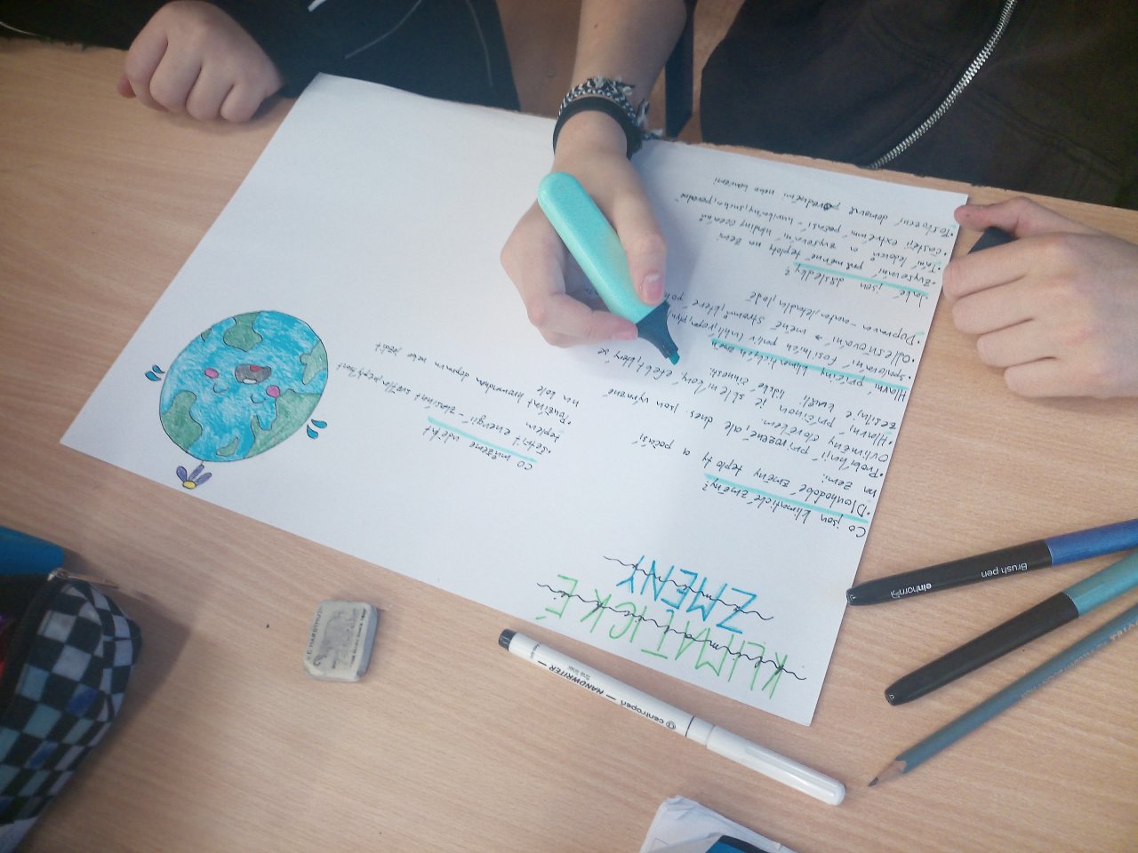 Následovala krátká diskuse. Poté žáci pracovali ve skupinách a vytvářeli jednoduché plakáty s využitím internetu, kde vyhledávali konkrétní informace k vybraným oblastem, například extrémní počasí, znečištění ovzduší nebo ochrana přírody.