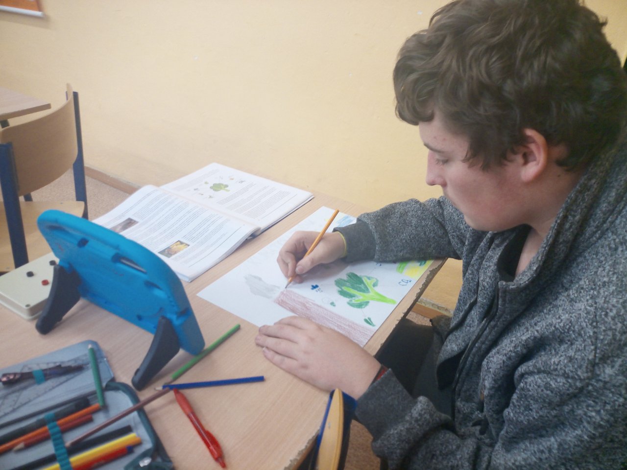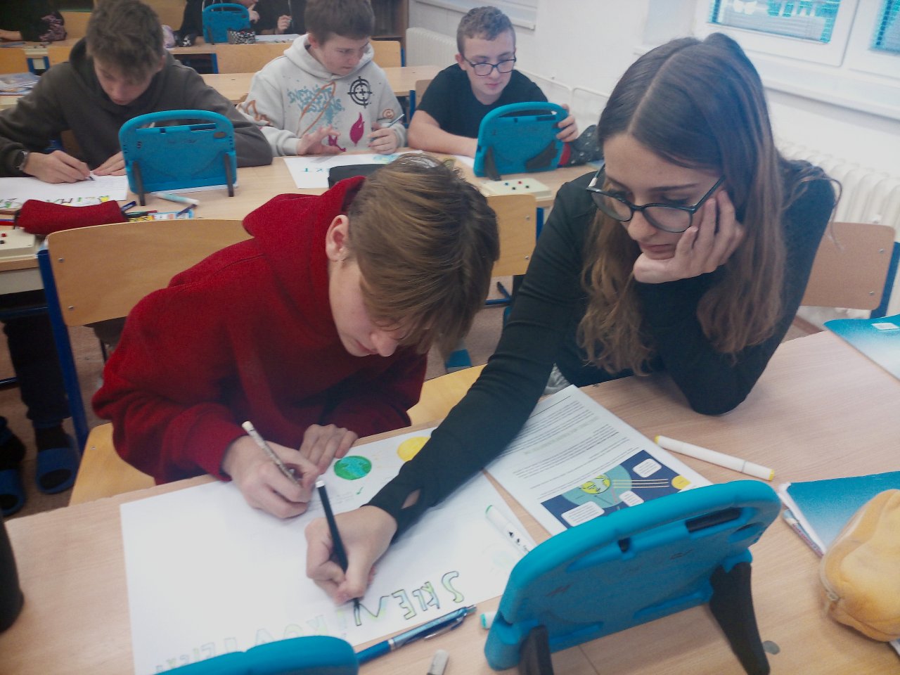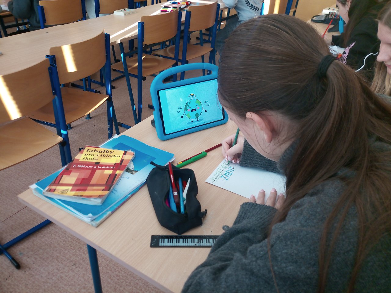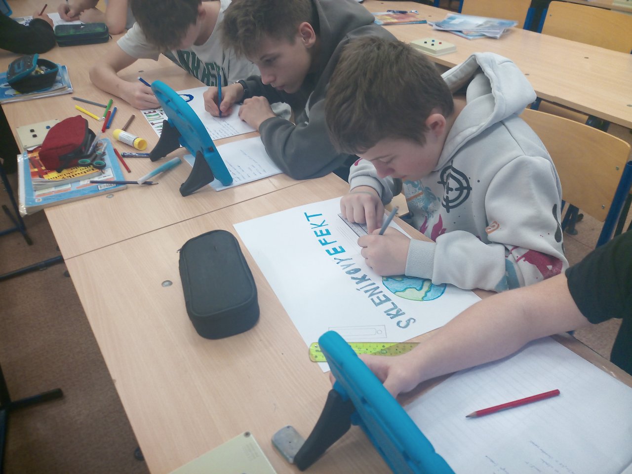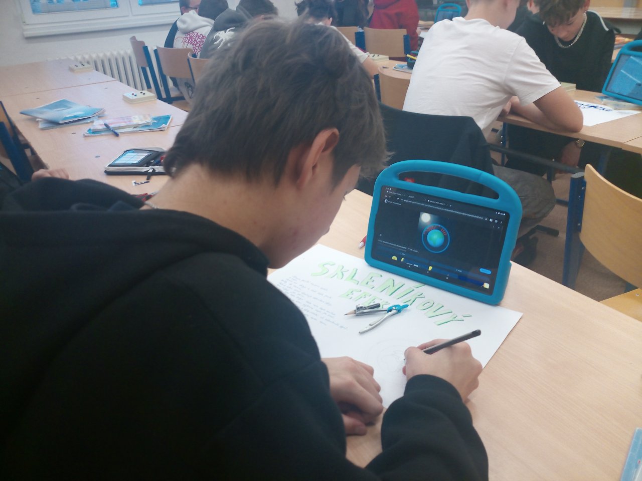 Následovala krátká diskuse. Poté žáci pracovali ve skupinách a vytvářeli jednoduché plakáty s využitím internetu, kde vyhledávali konkrétní informace k vybraným oblastem, například extrémní počasí, znečištění ovzduší nebo ochrana přírody.