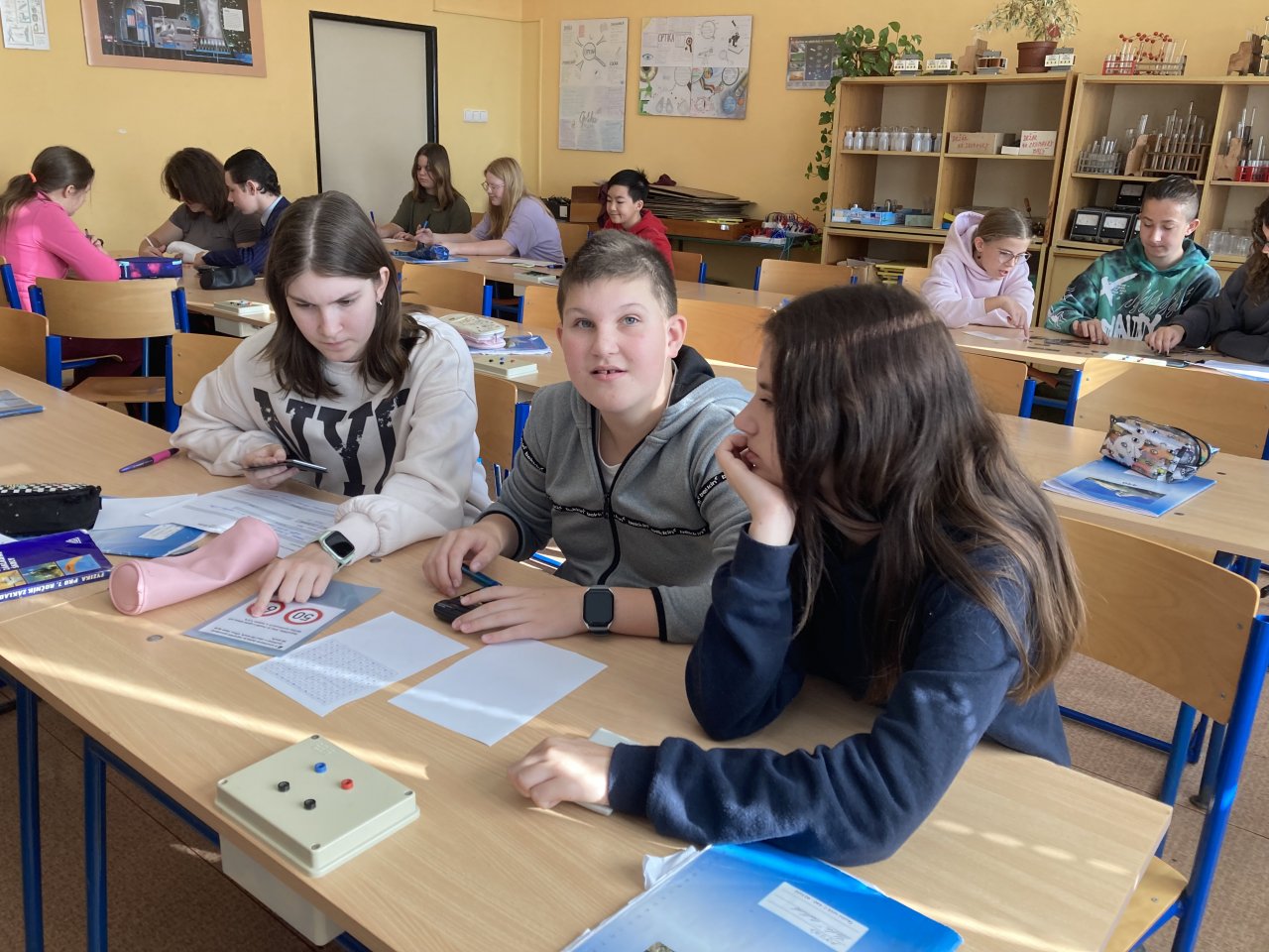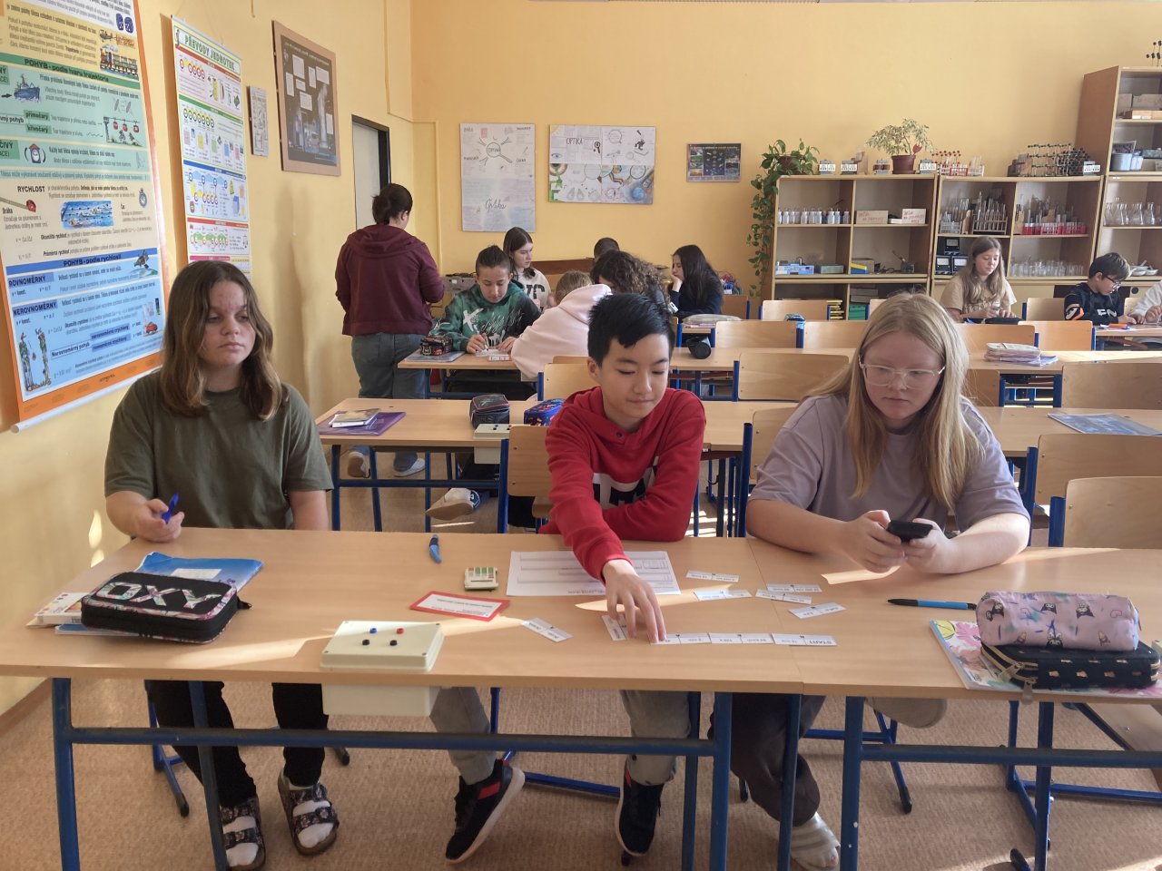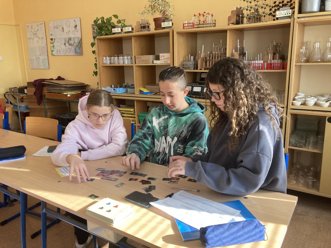 Datum: 9. 12. 2025V hodině fyziky si žáci sedmého ročníku zopakovali učivo o rychlosti netradiční formou. Byli náhodně rozděleni do skupin a každá z nich dostala jiný úkol týkající se výpočtu nebo porovnávání rychlosti. Po určité době si skupiny úkoly vyměnily, takže si postupně vyzkoušely více typů příkladů.