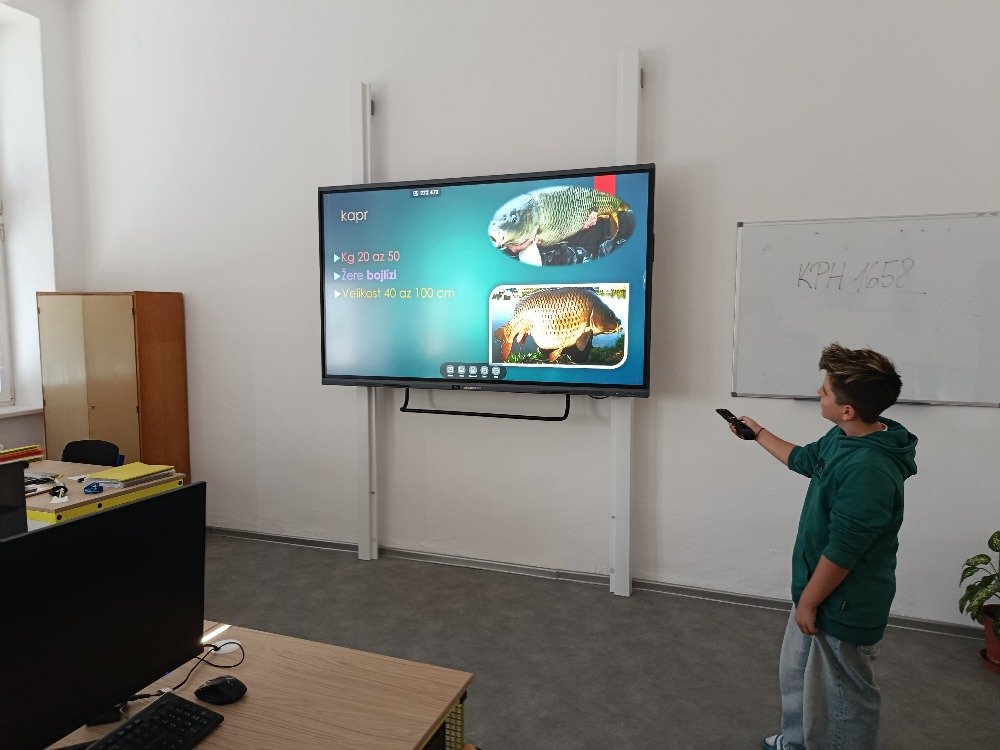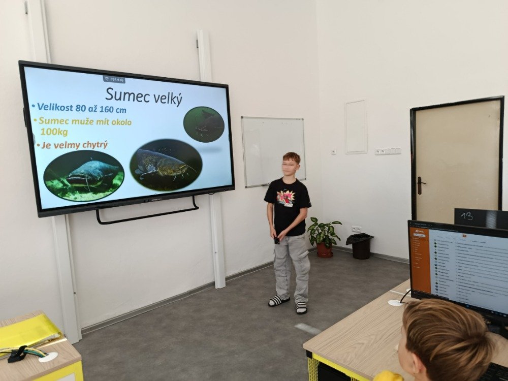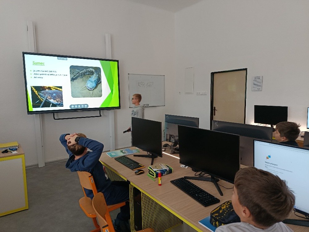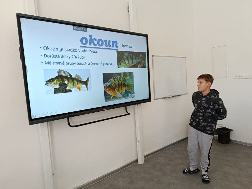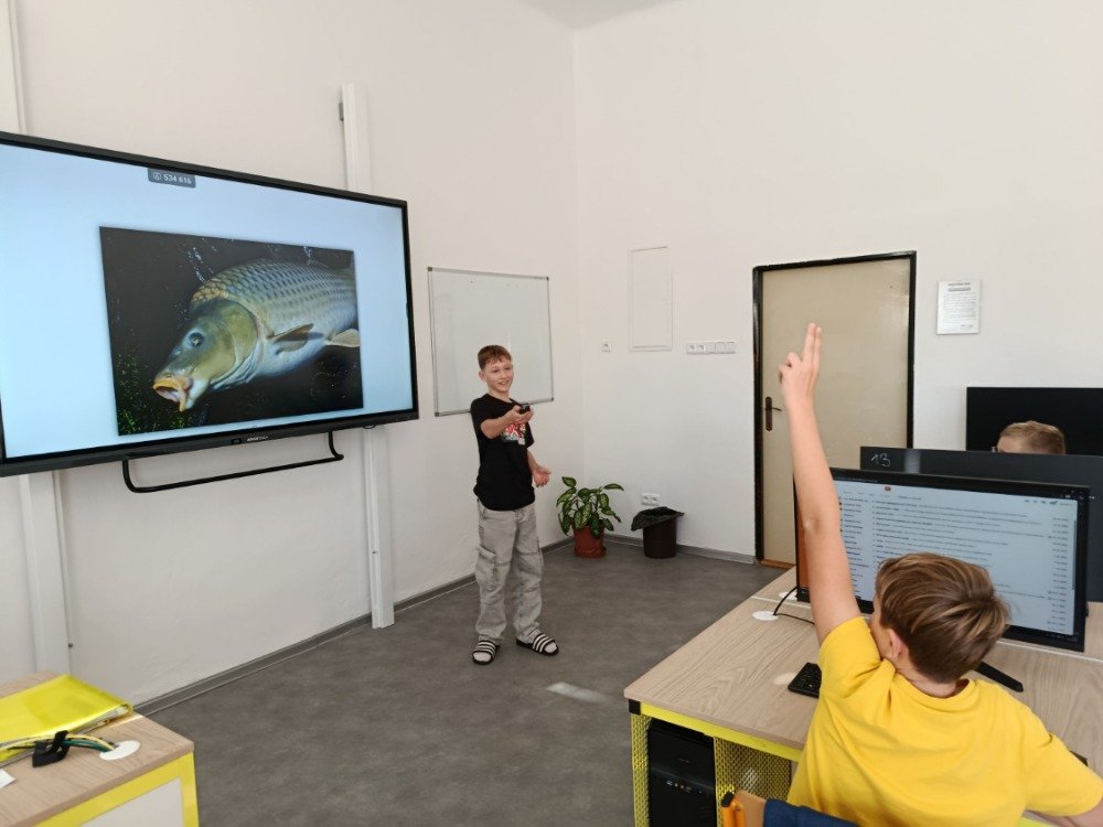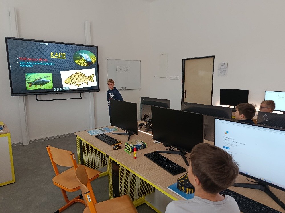 Datum: 13. 12. 2025Žáci 6. třídy si v hodině informatiky vyzkoušeli svou první prezentaci. Téma bylo blízké a zajímavé – ryby. Nejprve společně diskutovali o tom, kdo je rybář, jaké ryby už někdo chytil, kde se nacházejí rybníky a proč jsou ryby zdravé a patří do jídelníčku. Nechyběla ani debata o vánoční večeři a o tom, kdo má na Štědrý večer na talíři rybu.