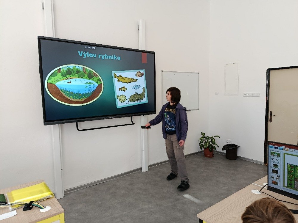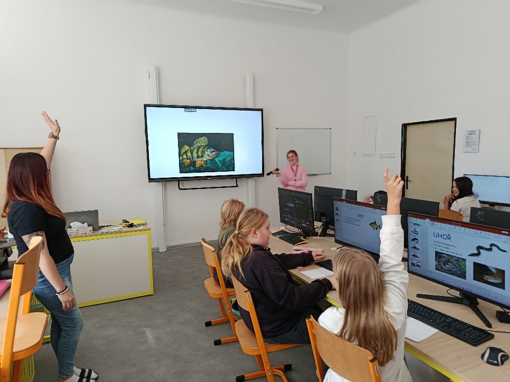 Následně žáci zpracovali prezentace, ve kterých využili jednoduché animace. Pomocí nich mohli spolužáci hádat, o jakou rybu se jedná. Práce žáky velmi bavila a do celého tématu se vrhli s plným nasazením. Výsledkem byly povedené prezentace a první cenné zkušenosti s digitálními dovednostmi.