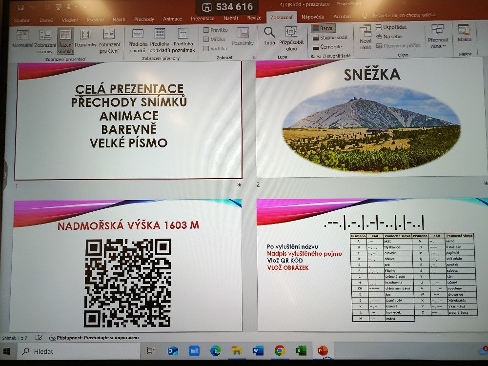 Na závěr žáci vkládali QR kódy také do prezentací. Vybrali si různé památky a zajímavé objekty, aby při cestování mohli QR kód jednoduše použít v telefonu. Aktivita propojila informatiku s matematikou i praktickým využitím v reálném životě.