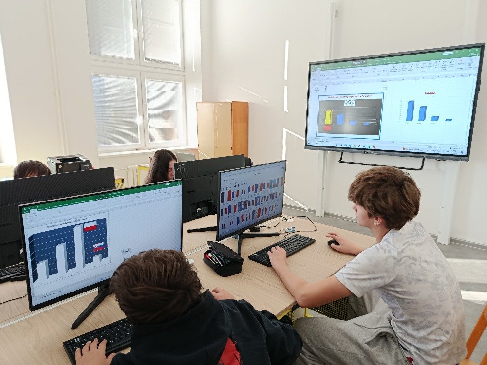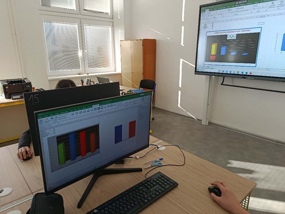 Práce pokračovala v programu Excel, kde žáci propojili svůj sport s olympijskými sporty. Vyhledali počet medailí, které daný stát získal na olympijských hrách v Paříži v roce 2024, a vytvořili přehledný graf. Tím si prakticky procvičili práci s daty a základy statistiky.