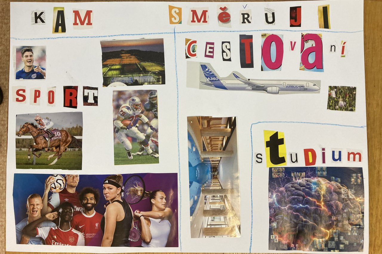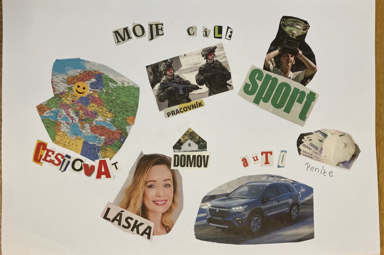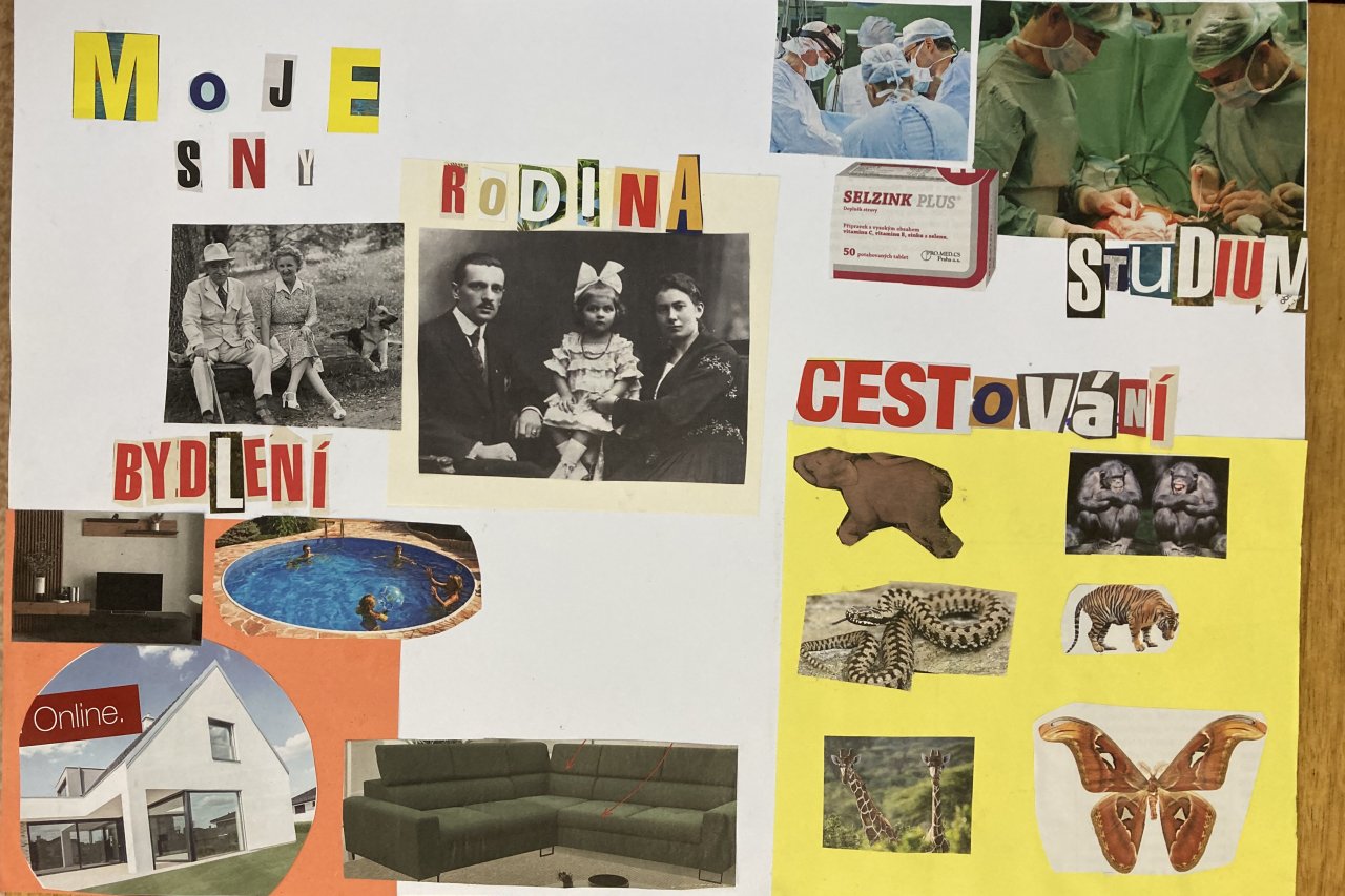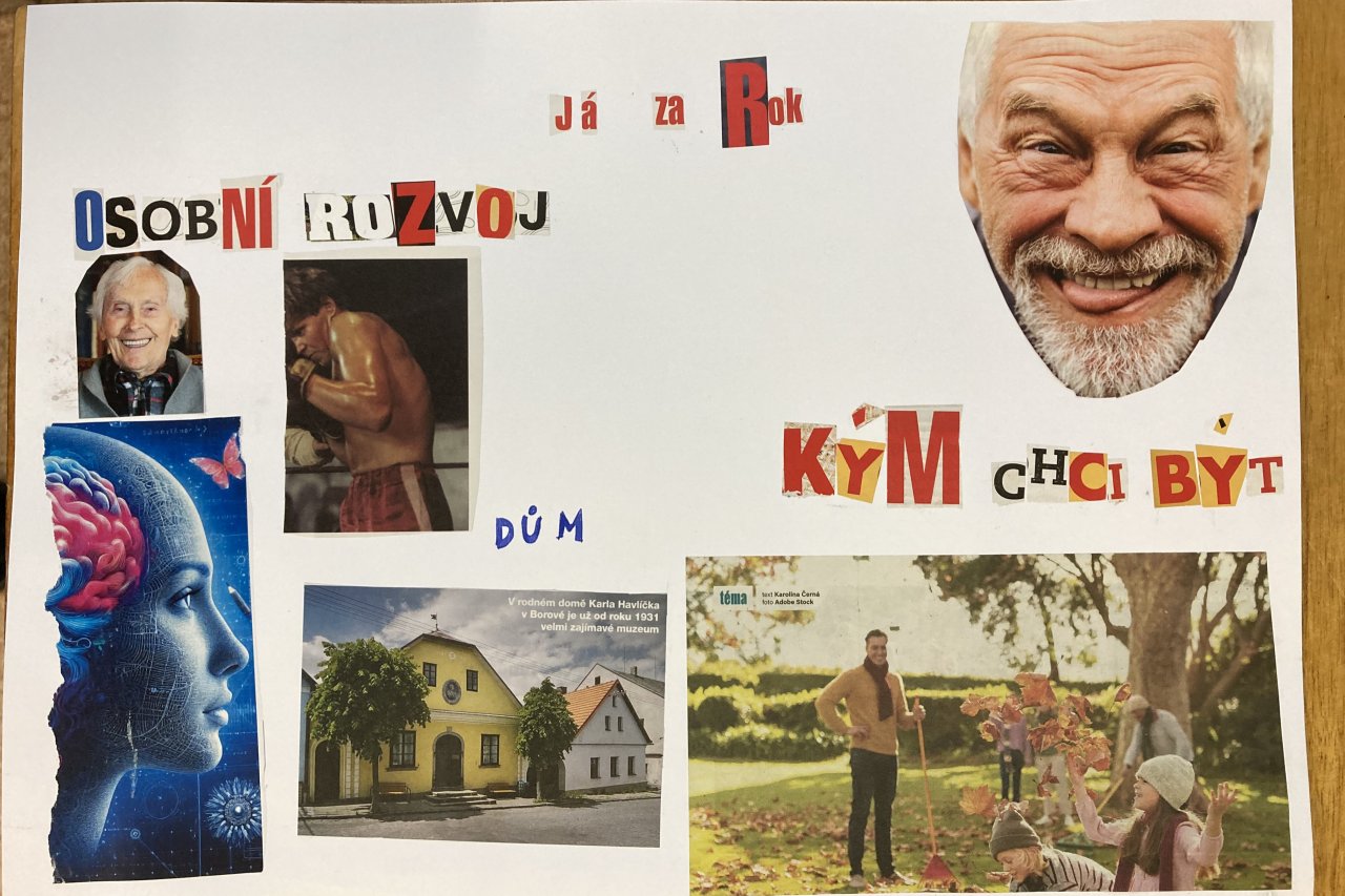 Datum: 15. 12. 2025Žáci 8. třídy v rámci tématu motivace, vůle a osobní cíle vytvořili koláž na téma: „Jak chci, aby vypadal můj život za 5, 10, 15 a 20 let.“ Při práci vystřihovali obrázky a písmena z novin a časopisů, které následně skládali a lepili do výsledné koláže podle své představy budoucího života.