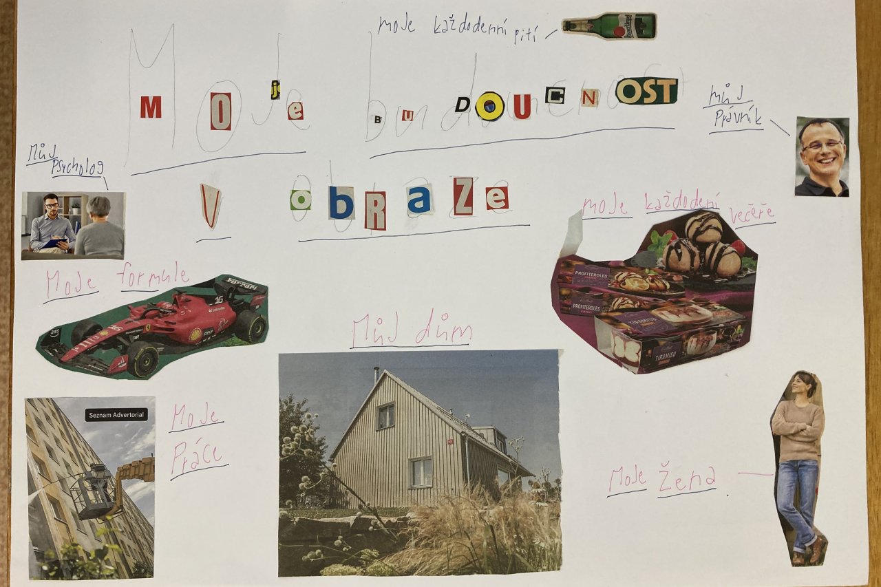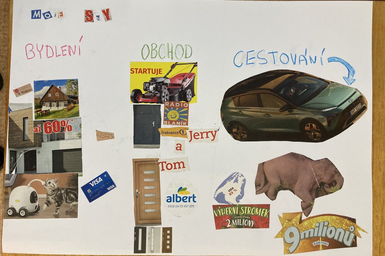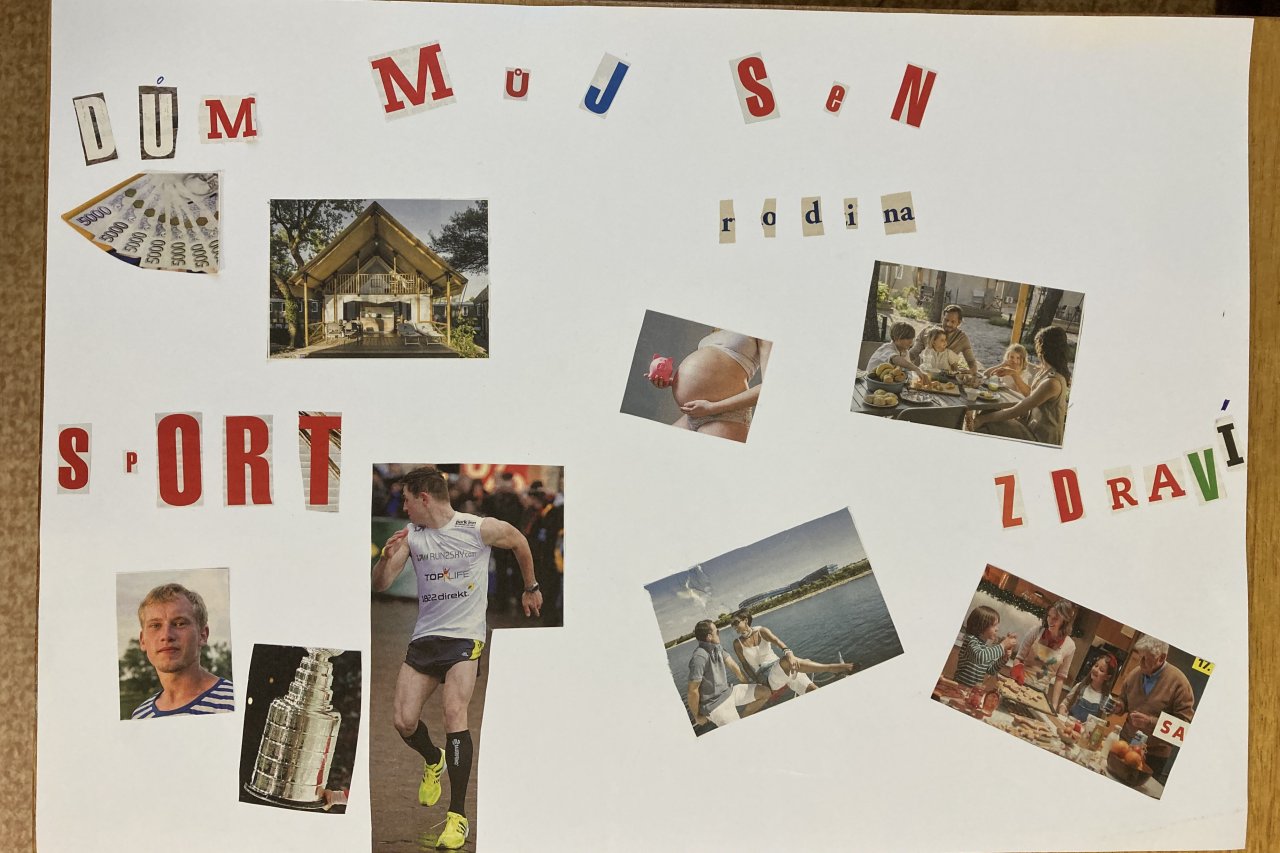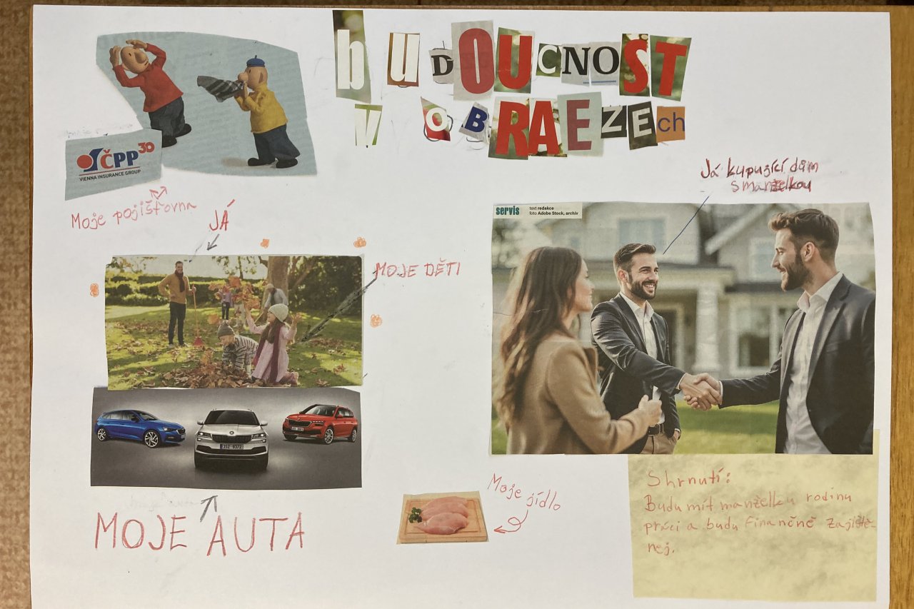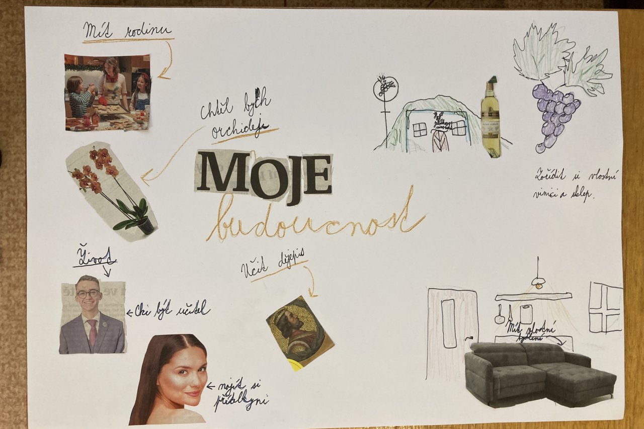 Datum: 15. 12. 2025Žáci 8. třídy v rámci tématu motivace, vůle a osobní cíle vytvořili koláž na téma: „Jak chci, aby vypadal můj život za 5, 10, 15 a 20 let.“ Při práci vystřihovali obrázky a písmena z novin a časopisů, které následně skládali a lepili do výsledné koláže podle své představy budoucího života.