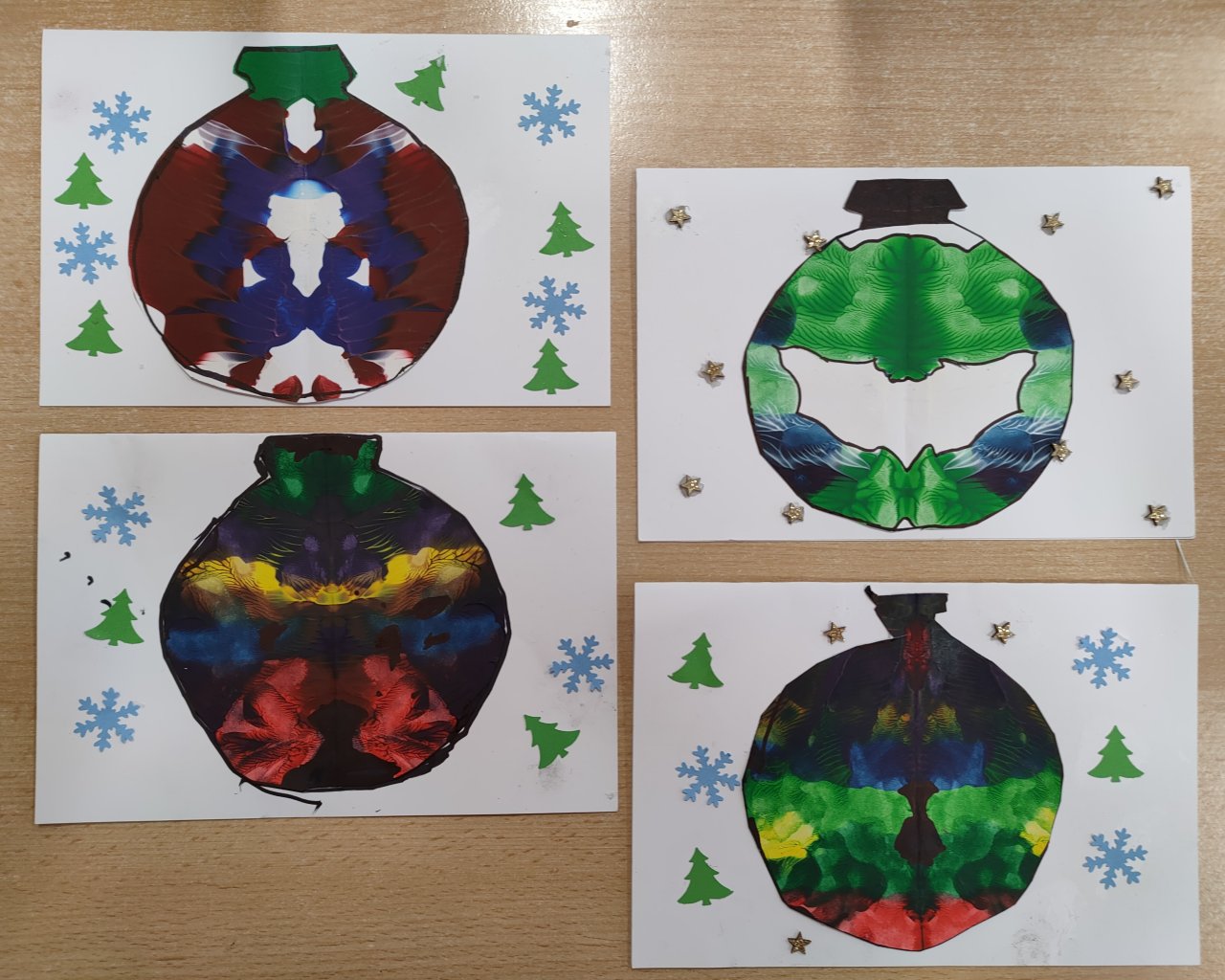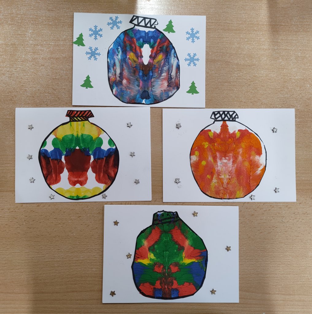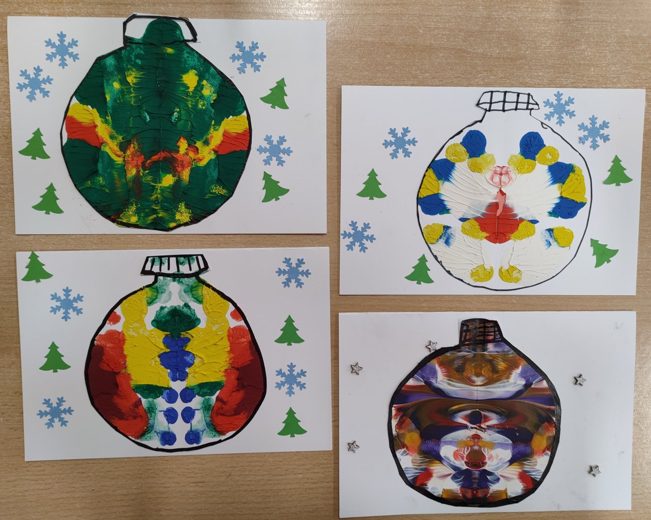 Z připravených vánočních baněk si žáci vyrobili vánoční přání, která si dozdobili. V hodině českého jazyka napsali do přání vánoční text.