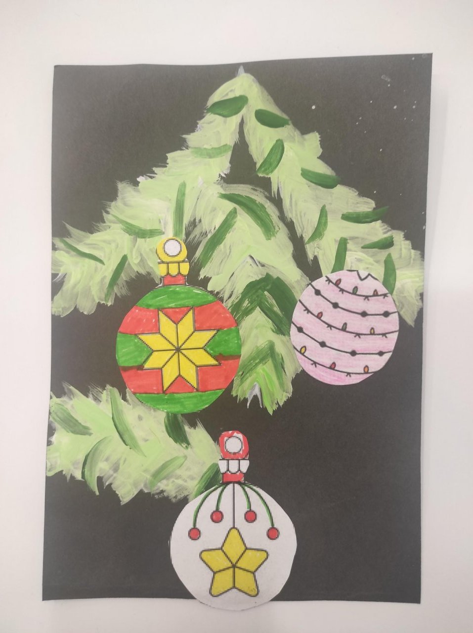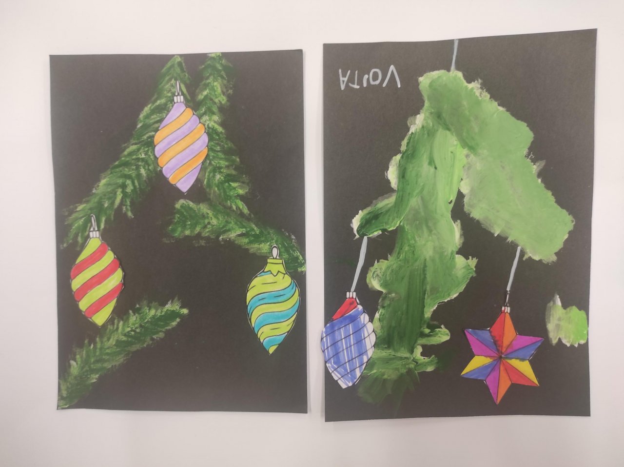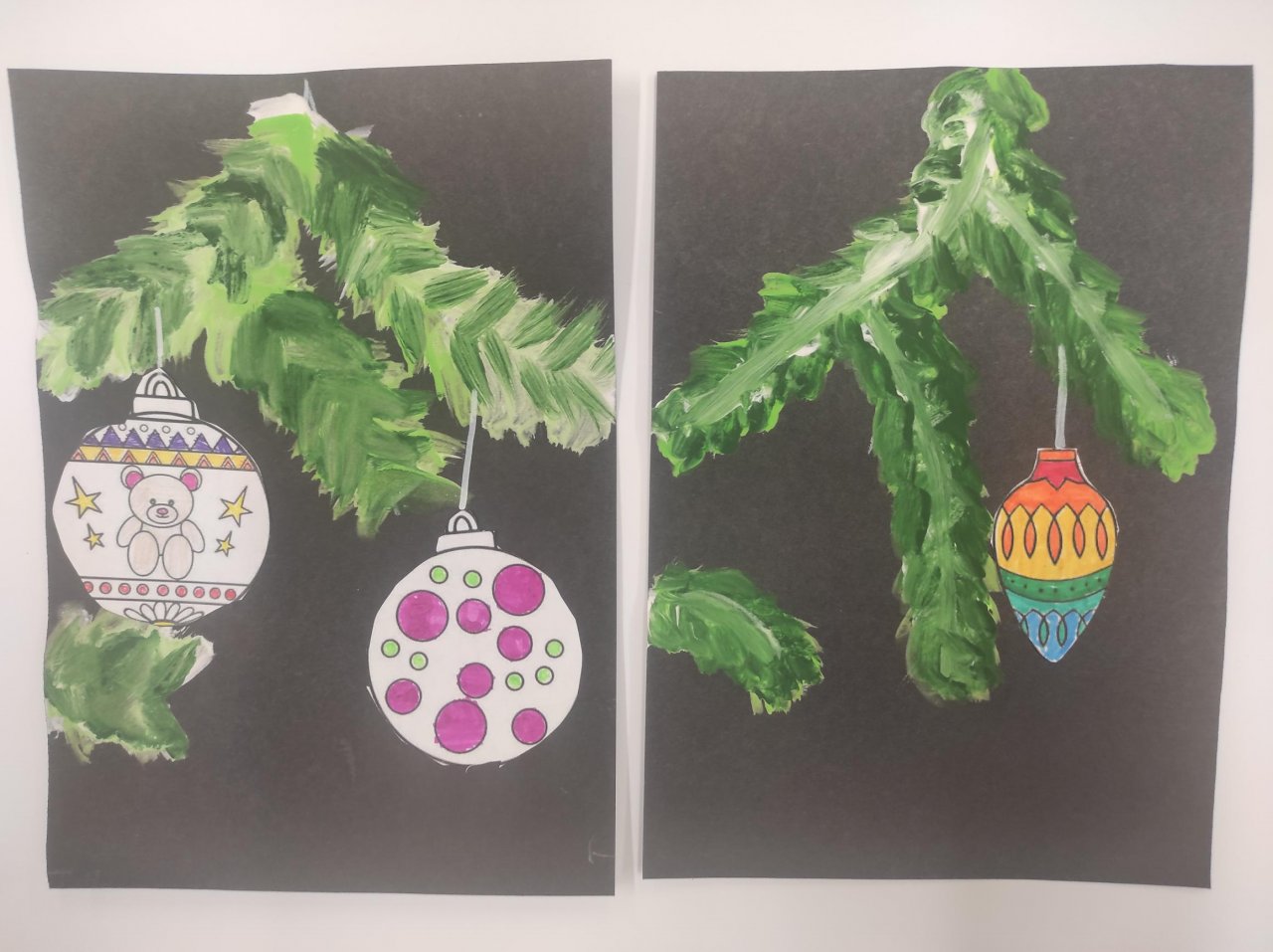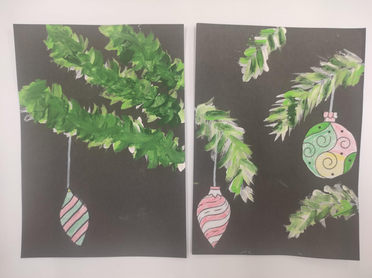 Děti tvořily vánoční koláž na černém papíře, kde temperovými barvami namalovaly větvičku. Poté dolepily dotvořené baňky, které obrázek krásně doplnily. Výsledkem byly originální a barevné dekorace s vánoční atmosférou.
