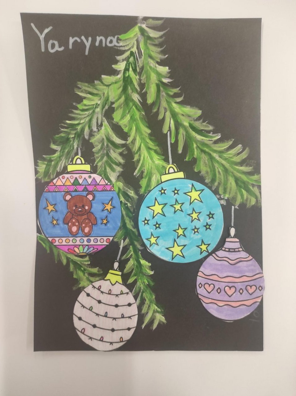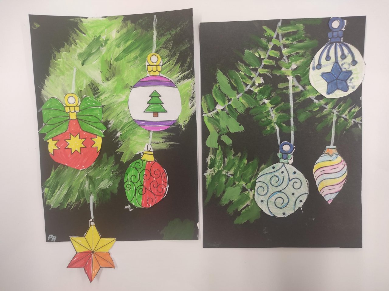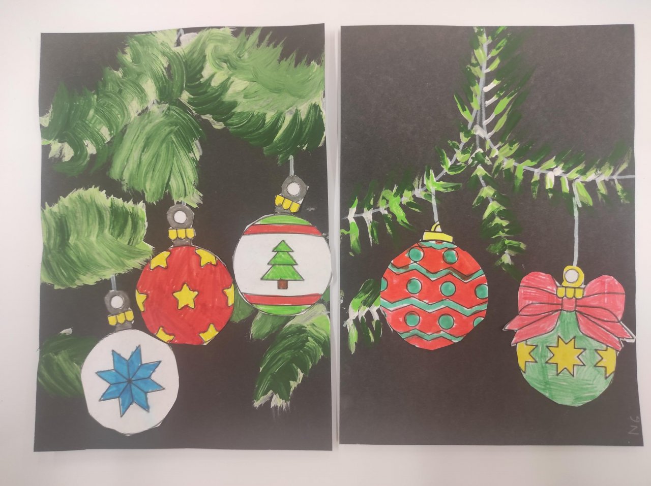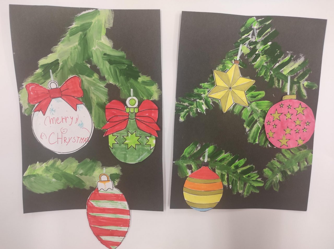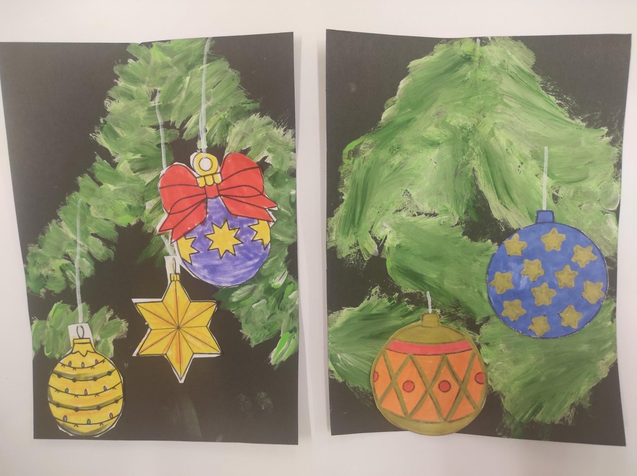 Děti tvořily vánoční koláž na černém papíře, kde temperovými barvami namalovaly větvičku. Poté dolepily dotvořené baňky, které obrázek krásně doplnily. Výsledkem byly originální a barevné dekorace s vánoční atmosférou.