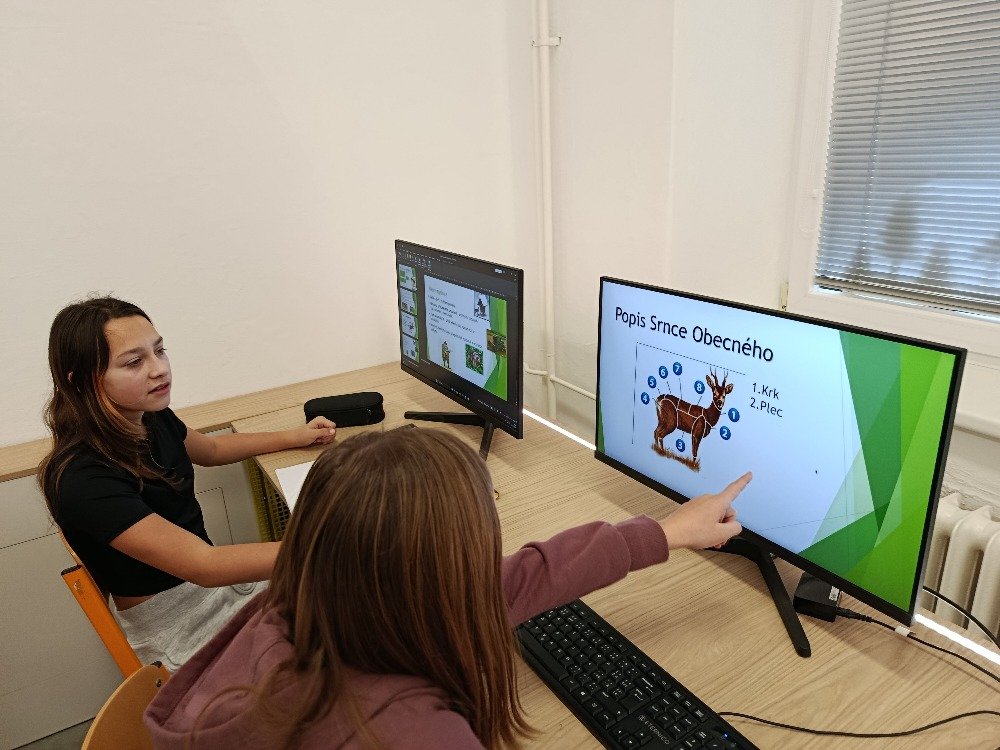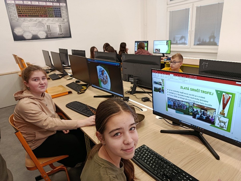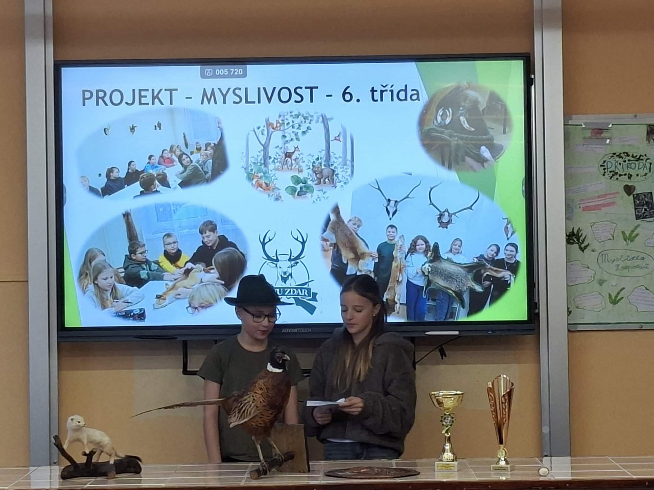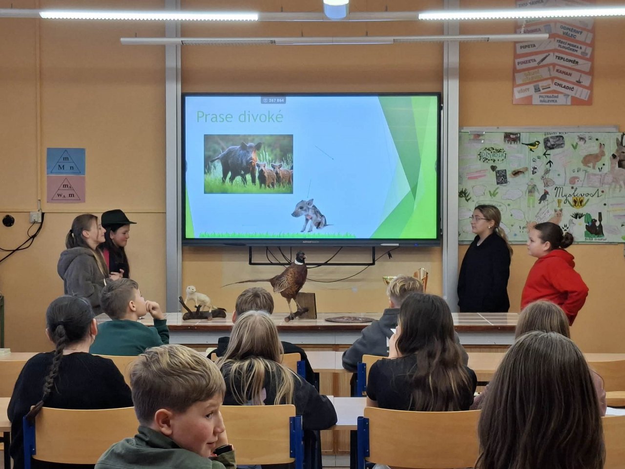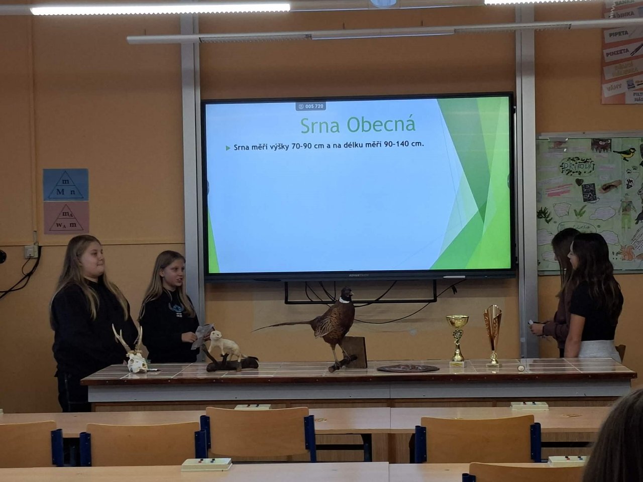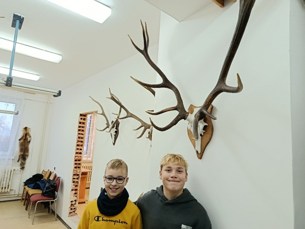 Při prezentaci pro 7. třídu jsme se zaměřili také na svatého Huberta, patrona myslivců, na pouť v Dyjákovicích a na myslivecký kroužek pro děti. V něm se děti připravují na soutěž Zlatá srnčí trofej, které se zúčastnily i Ellen a Valerie. Nezapomněli jsme zmínit úkoly myslivce a jeho uniformu.