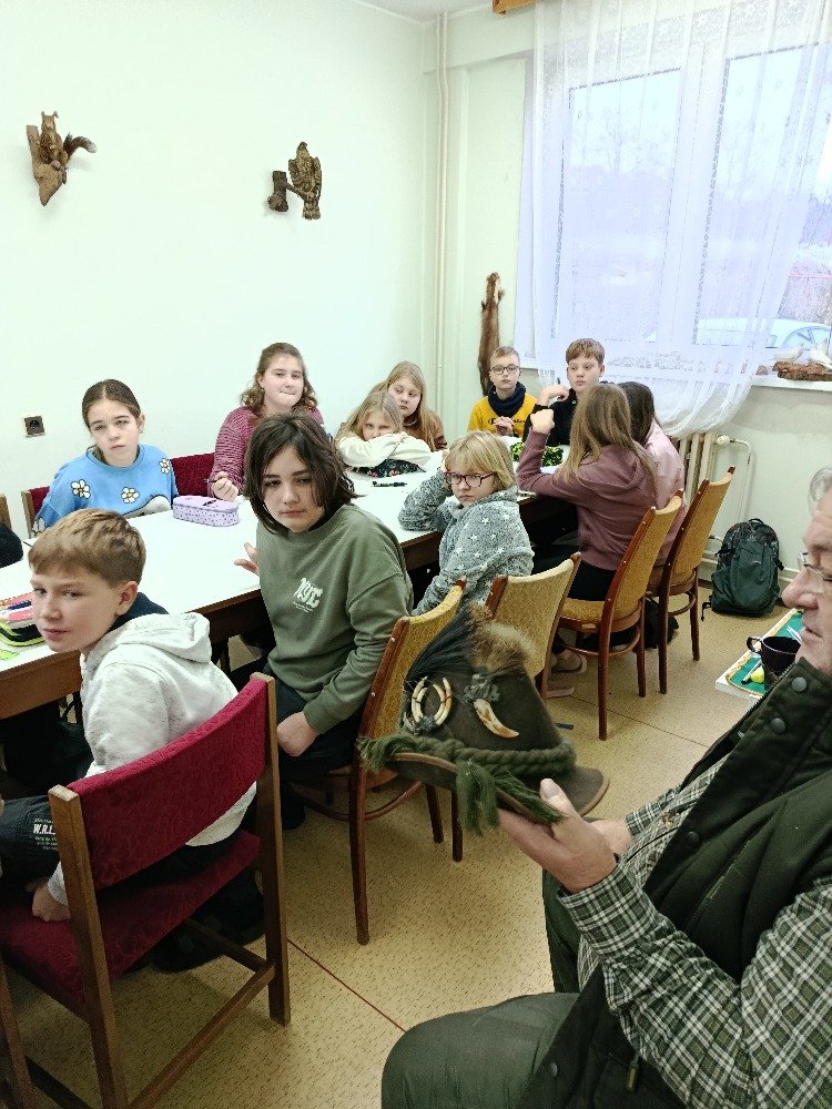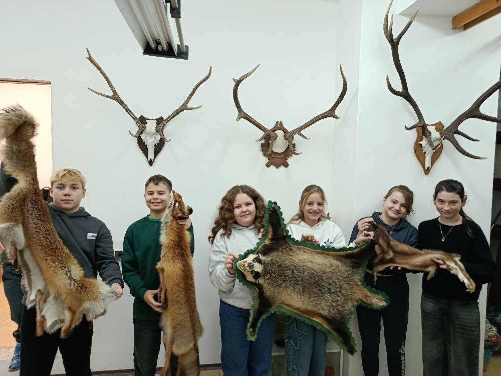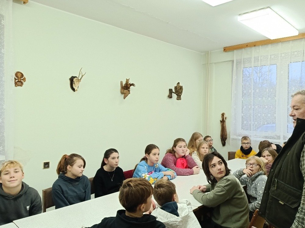 Datum: 20. 12. 2025Nejprve jsme navštívili mysliveckou klubovnu v Dyjákovicích. Pan Geba nás seznámil se zajímavostmi o myslivosti, o zvířatech a vysvětlil nám, jak můžeme zvířátkům v přírodě pomáhat. Povídali jsme si o bažantovi, srně, zajíci, divokém praseti, bobrovi, lišce a také o loveckém psovi.