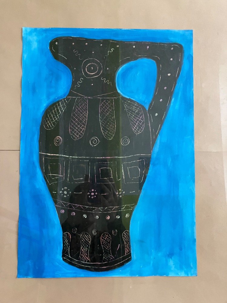 Datum: 20. 12. 2025Žáci 6. a 7. třídy se ve výtvarné výchově zaměřili na řecké výtvarné umění, konkrétně na černofigurový a červenofigurový styl, který je typický pro řeckou keramiku. Předkreslili si na formát A3 tvar vázy a pomocí voskovek, tuše a techniky proškrabávání se tento styl snažili napodobit. Navázali tak na učivo dějepisu o starověkém Řecku. Výsledkem byly velmi zajímavé a originální práce.