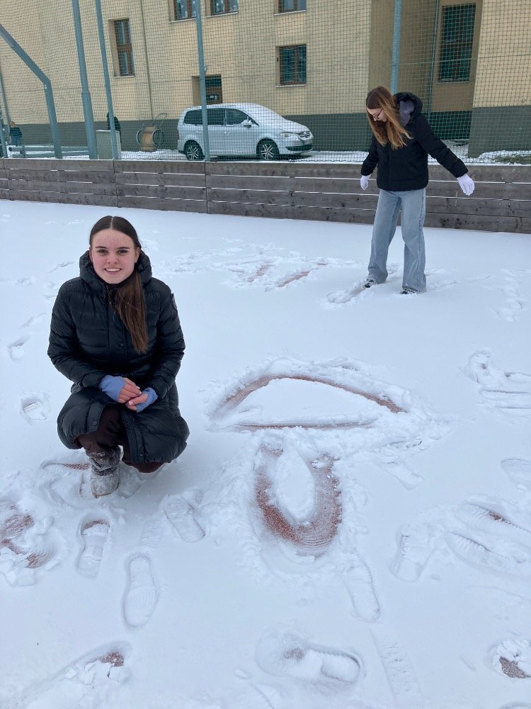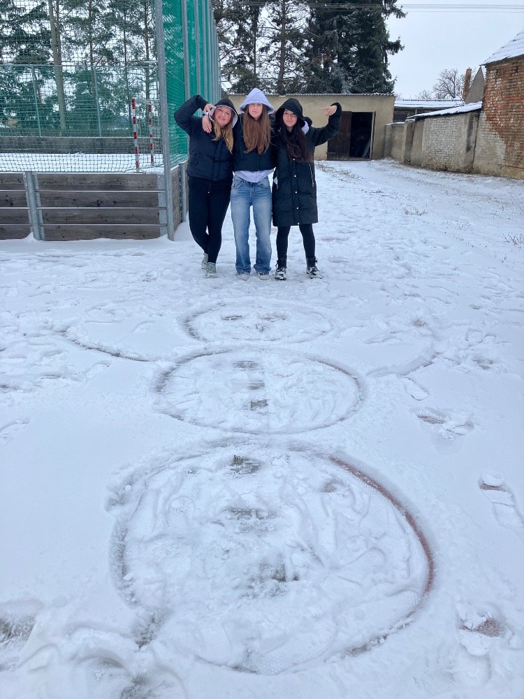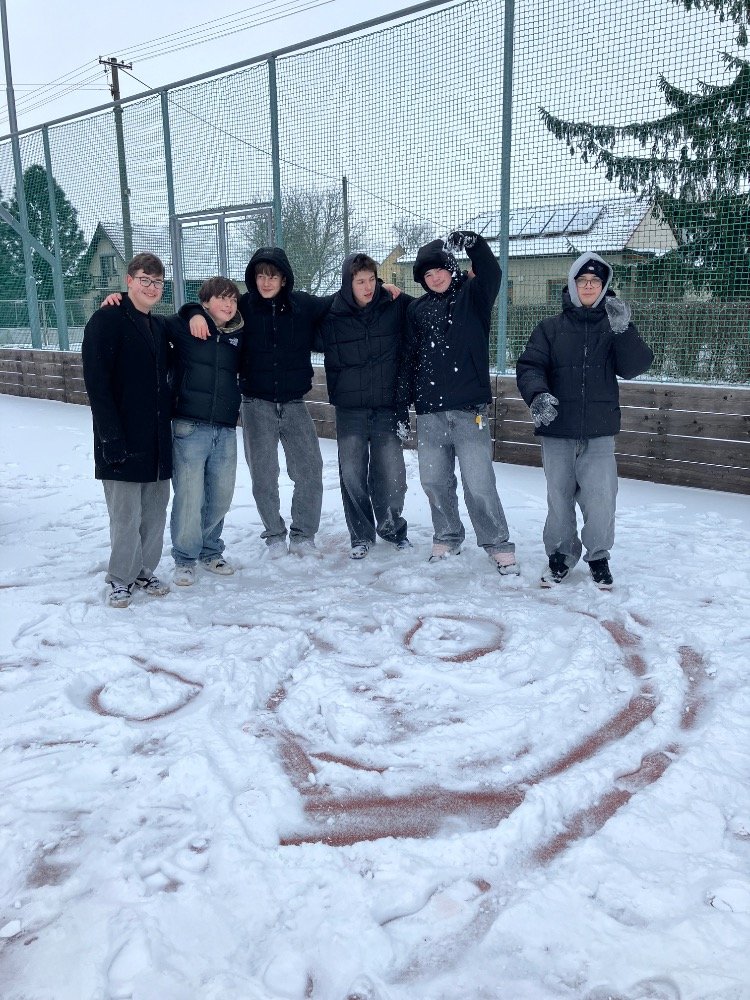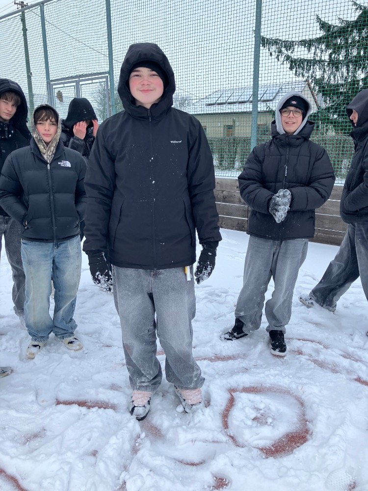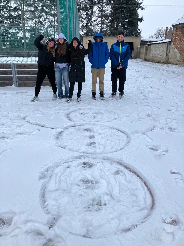 Kromě radostných hrátek na sněhu se osmáci pustili do kreativní práce – vyšlapávali do sněhu svá jména, tvořili nejrůznější obrazce, symboly i originální tvary. Hodina proběhla ve veselém duchu a žáci si odnesli nejen zajímavý výtvarný zážitek, ale také spoustu dobré nálady.