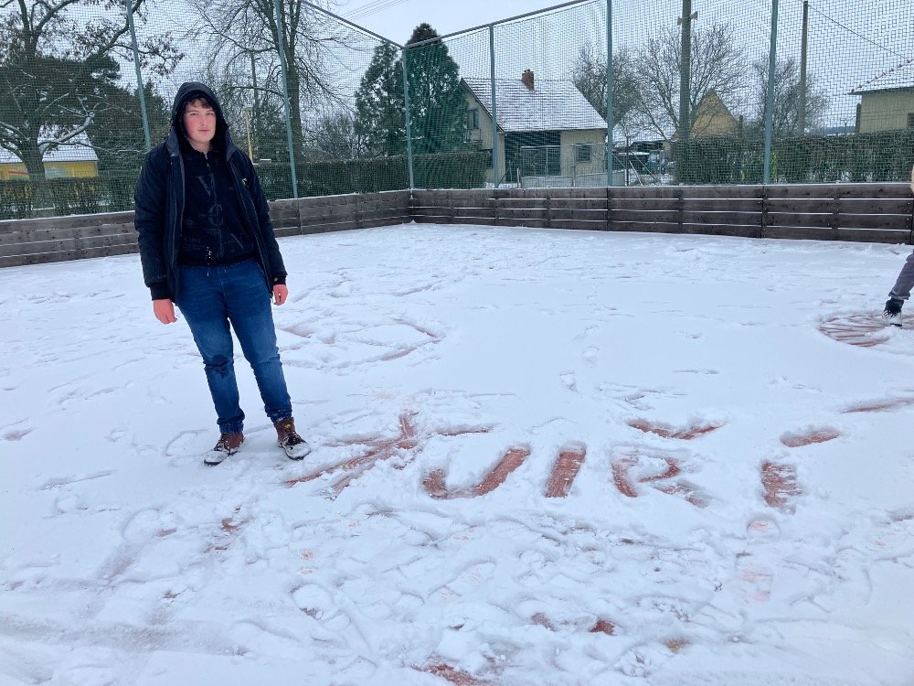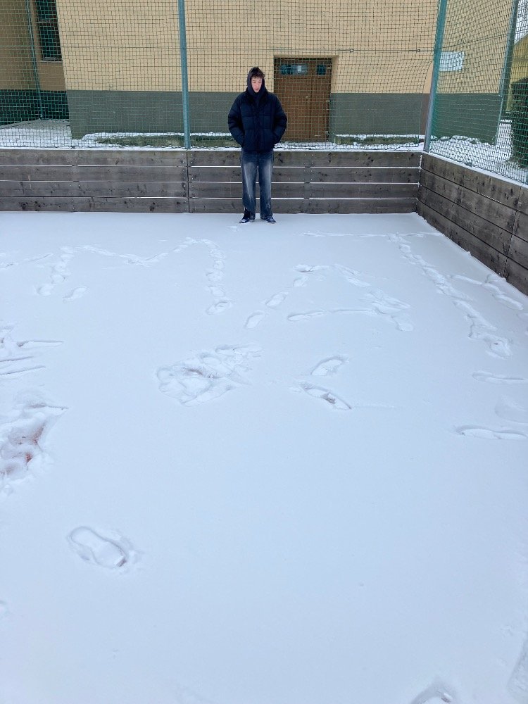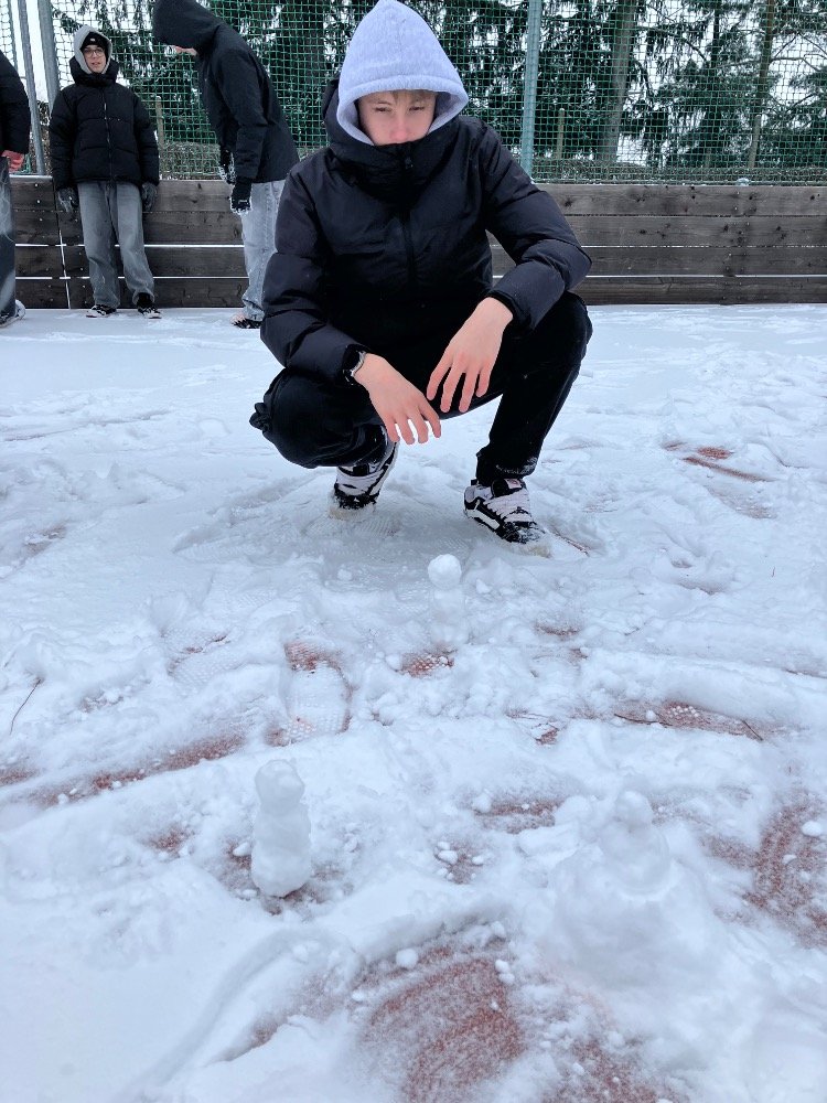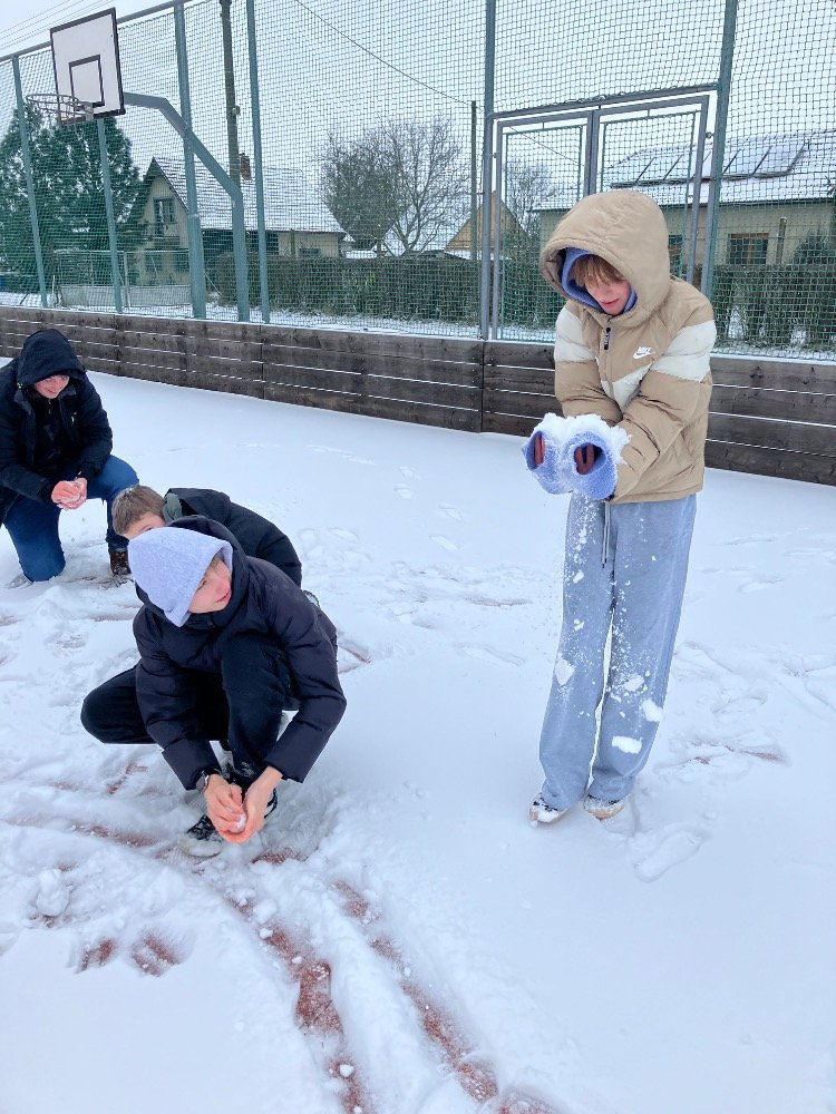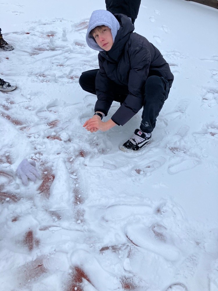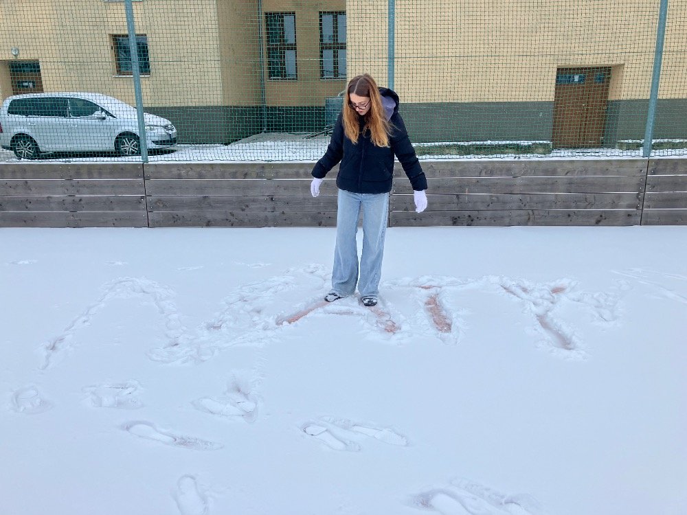 Kromě radostných hrátek na sněhu se osmáci pustili do kreativní práce – vyšlapávali do sněhu svá jména, tvořili nejrůznější obrazce, symboly i originální tvary. Hodina proběhla ve veselém duchu a žáci si odnesli nejen zajímavý výtvarný zážitek, ale také spoustu dobré nálady.